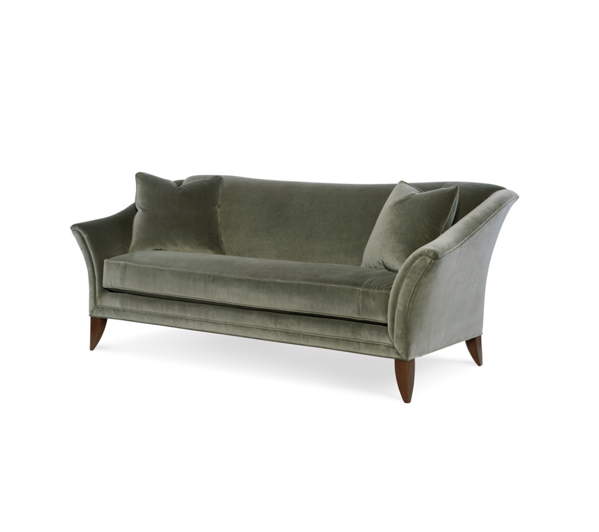 Design Plus Gallery presents a NEW sofa from Michael Thomas & Company. The Charlotte, elegantly clad in dove gray velvet, references Biedermeier style in its curving arms and legs. The bench cushion, with tie downs, is down wrapped foam. Arm Height 25.5″ Seat Height 20″
