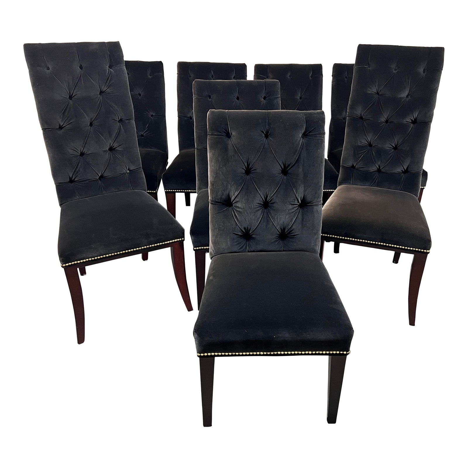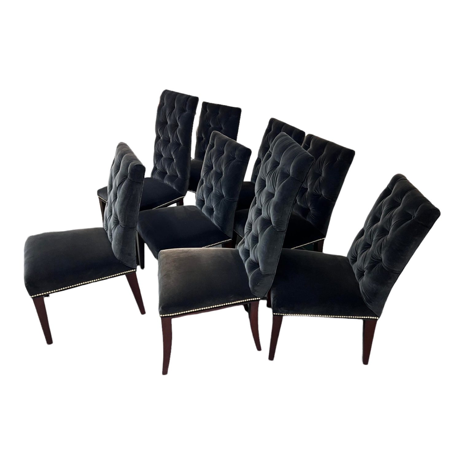 Design Plus Gallery presents a Set of 8 Custom Dining Chairs by Charles Stewart Company. Handcrafted in Hickory, North Carolina, this elegant set of chairs works beautifully with many styles of tables (shown here with Vintage Mastercraft Triboli Table). Built to last, the six side and 2 head chairs are built on a Kiln-dried Maple Frame with High-tensile-strength Elastic Webbing for Support. Upholstered in lush charcoal velvet, deeply tufted and detailed with brass nailheads. Dark stained tapered legs elevates the set. Some soil spots, one chair has visible sun damage. Orig. Price $8,660.