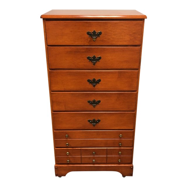 Design Plus Gallery presents a seven drawer dresser chest. The traditional frame structure is constructed of wood and veneers, the finish is a dark cherry. The hardware are metal in a dark brass finish. Accompanied with wheels at the base to make this narrow tall beauty moveable in the space. Brand Unknown.