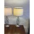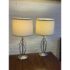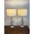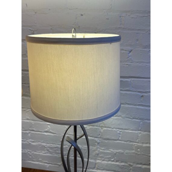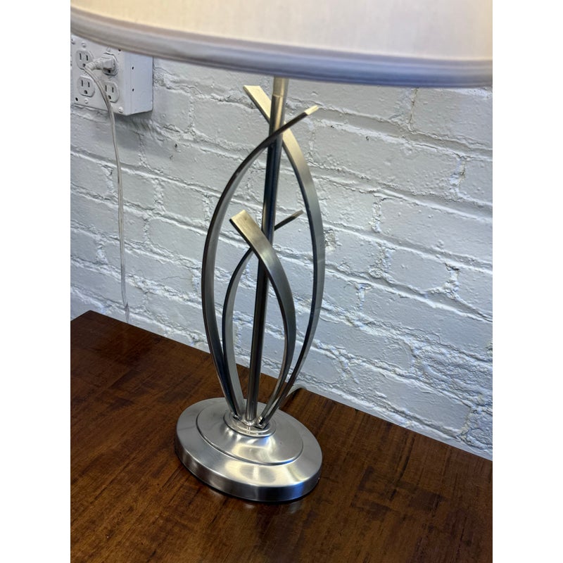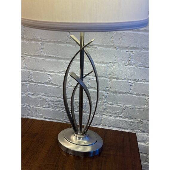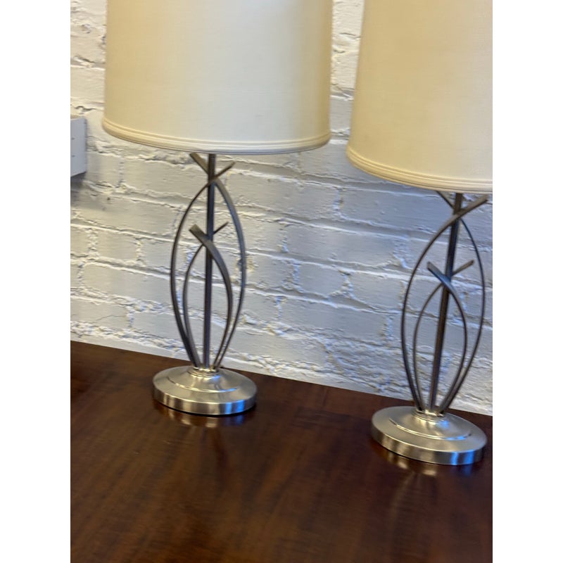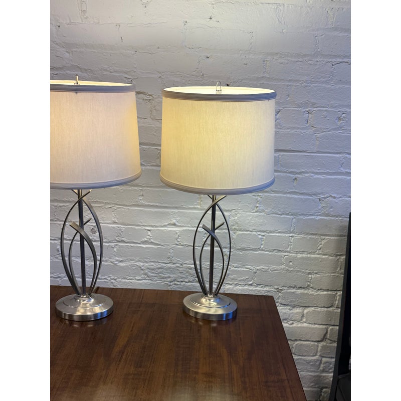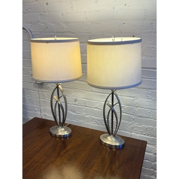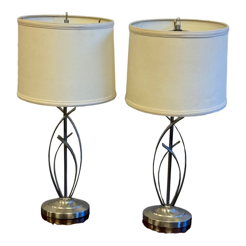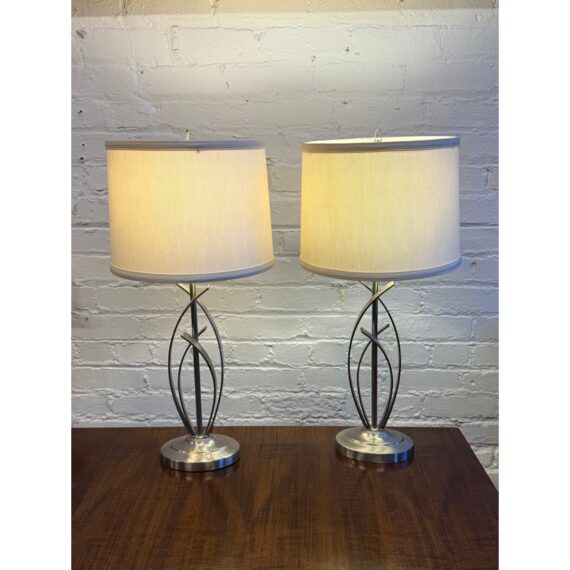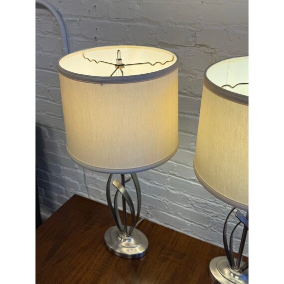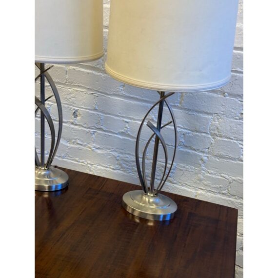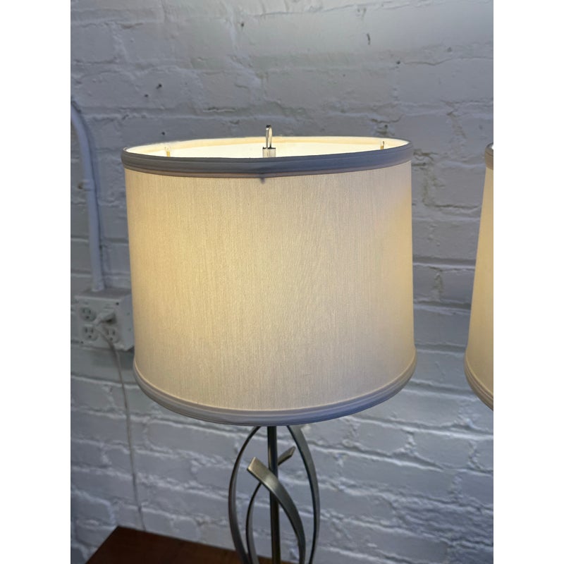 Design Plus Gallery presents a Pair of Cheyenne Table Lamps. The lamps have a round + solid base to balance the steel finished ribbons that are formed in an interesting design. They are identical with matching lamps shades and finials for complimentary placement in your home. They are in good condition with minimal surface wear for their usage.