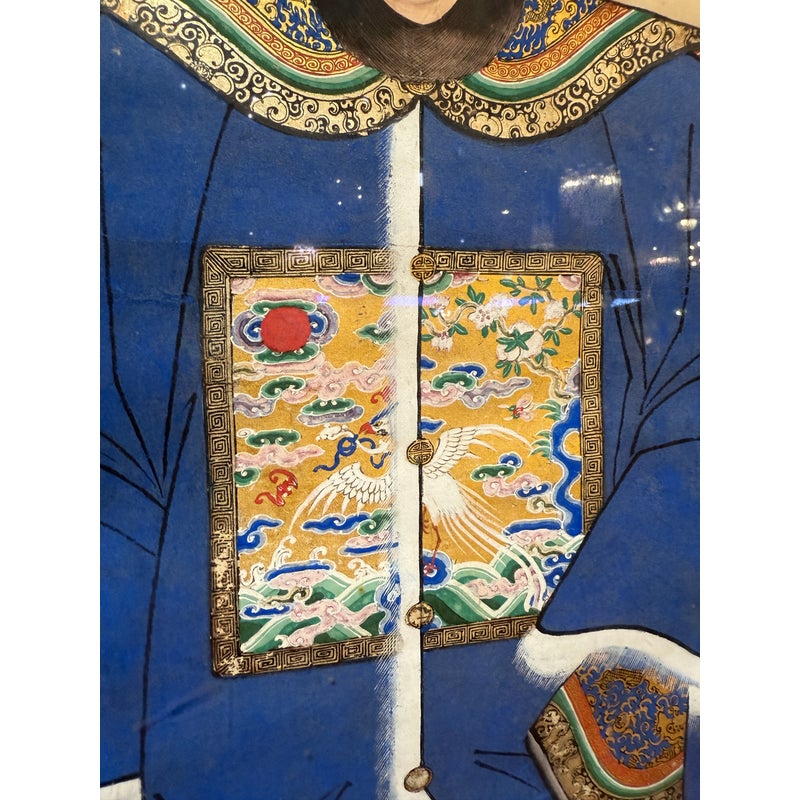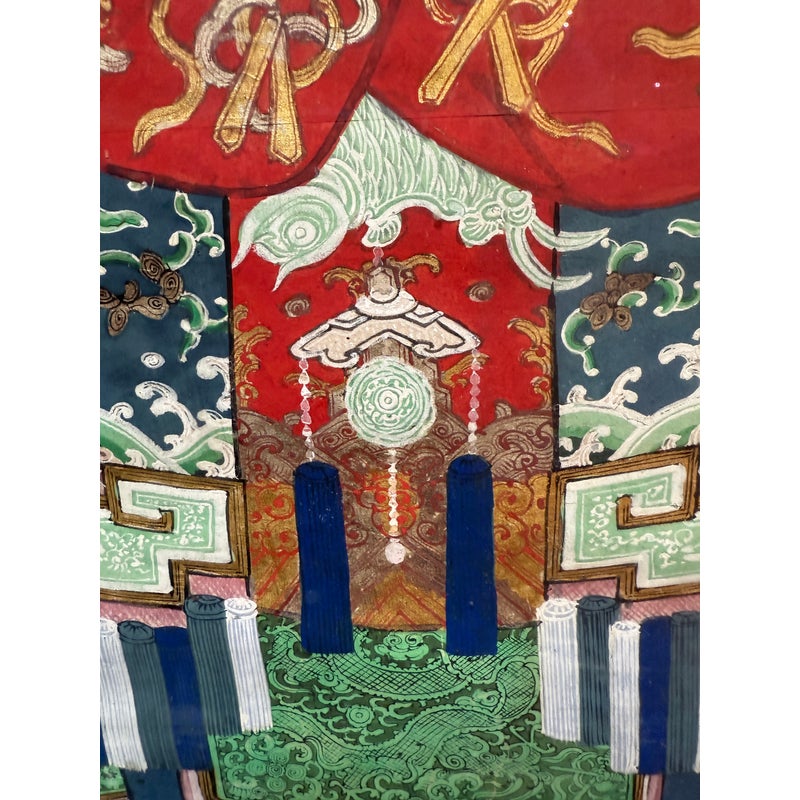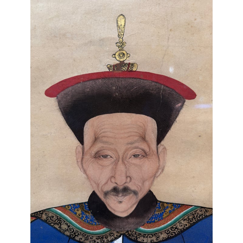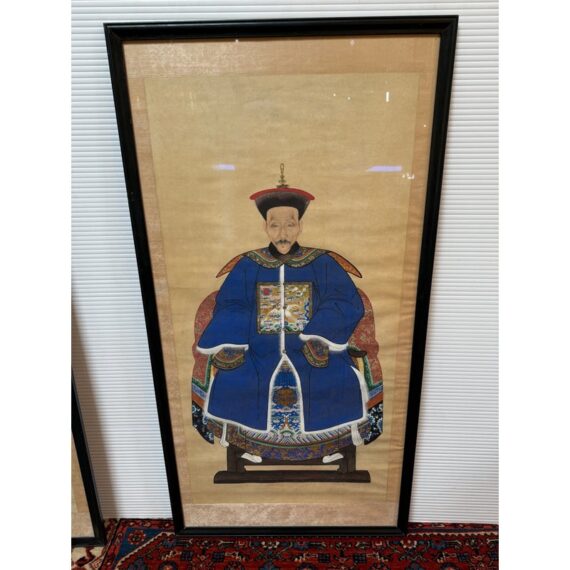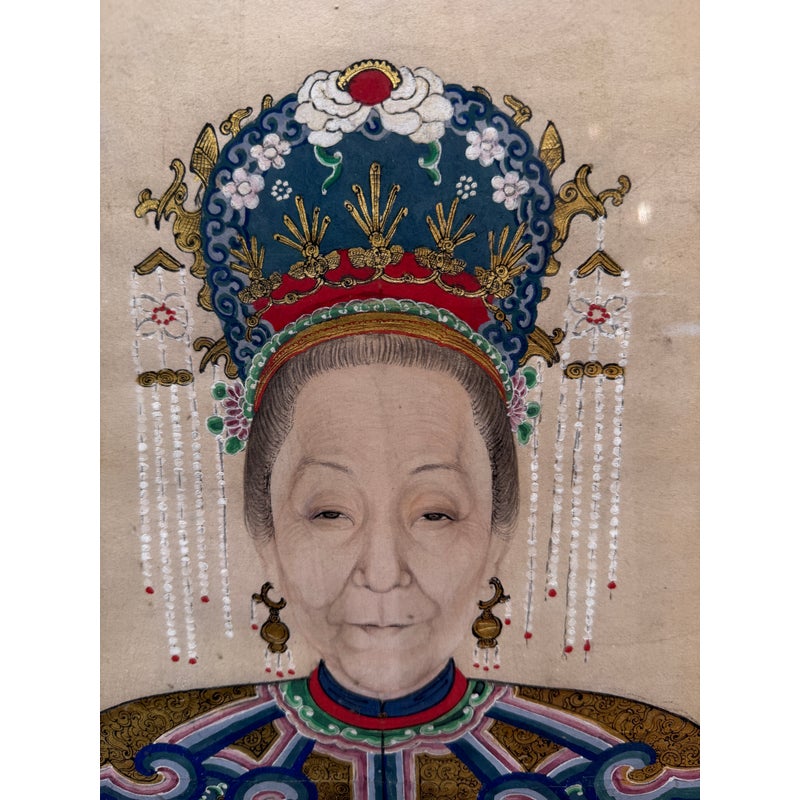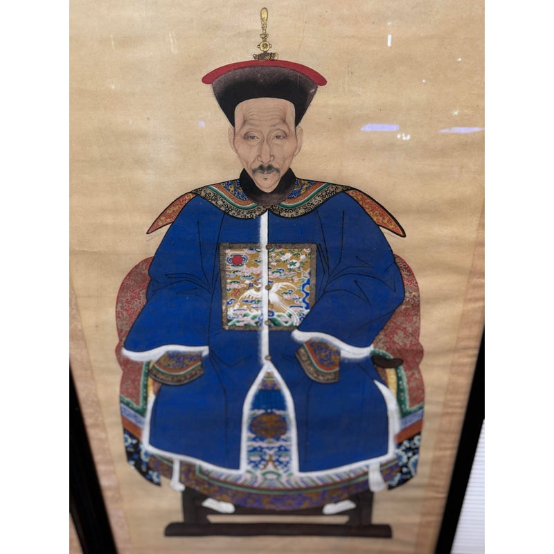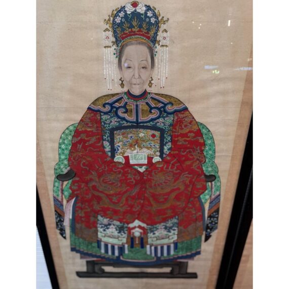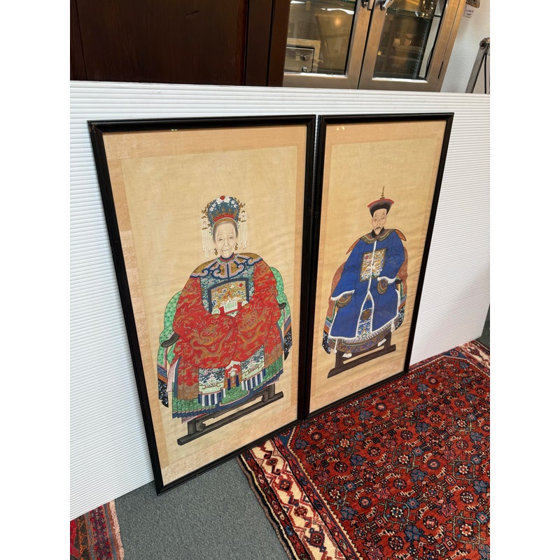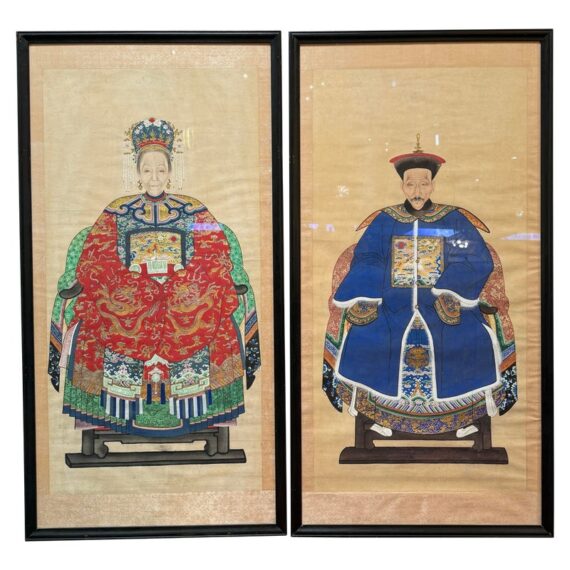 Design Plus Gallery presents a Set of Two Ancestrial Prints of the Emperor & Empress. Both are identically framed and proportioned to complement each other realistically. The set depicts the rulers in ceremonial attire, such as robes with symbols of dragons and phoenixes, to convey power, status, and continuity with tradition. These paintings were prominent during the Qing Dynasty and used to legitimize rule and honor deceased imperial family members, emphasizing their importance and connection to Chinese history and culture. They are both in good condition for their sage.