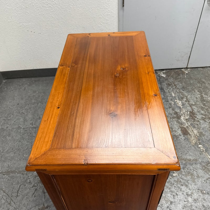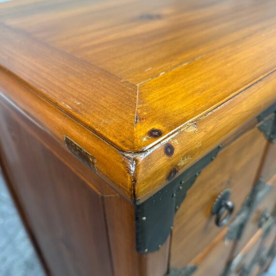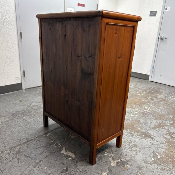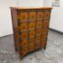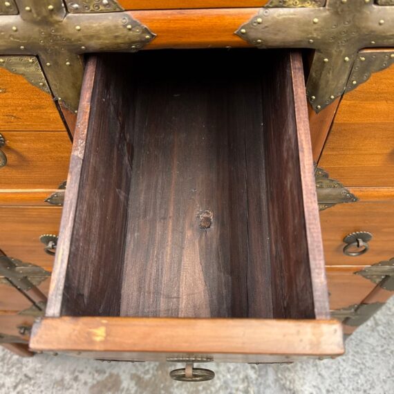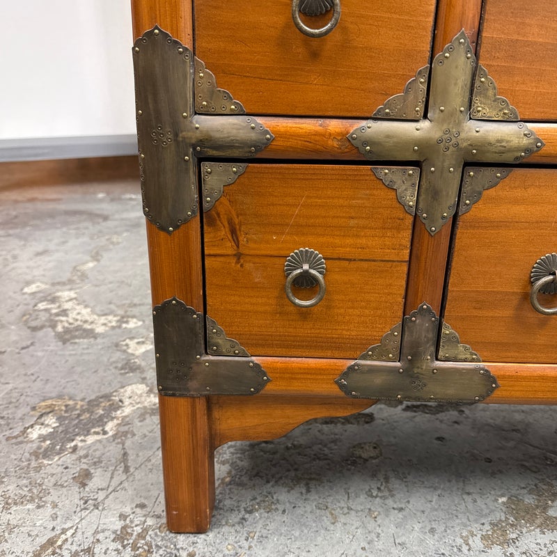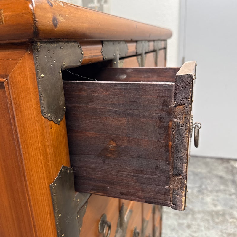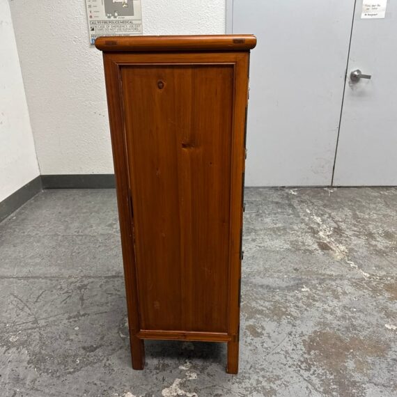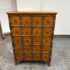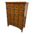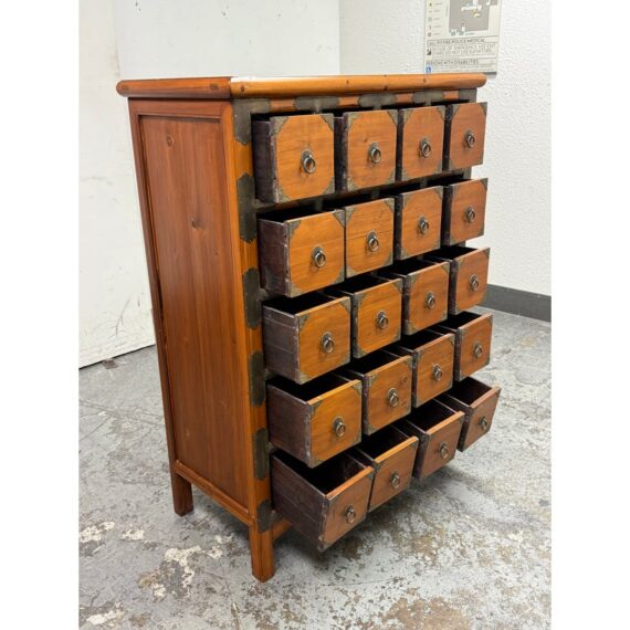 Design Plus Gallery presents a Reproduction Apothecary Cabinet of Chinese Heritage. These cabinets are meant for storage of herbs that were used in the healing/medicating post modern times. Each of the twenty drawers are able to organize tonics, potions and could be organized well. The solid wood cabinet has the additional treatment of iron at each corner of the drawer allowing it to withstand frequent use over time. The cabinet is in good condition for its vintage age + use.