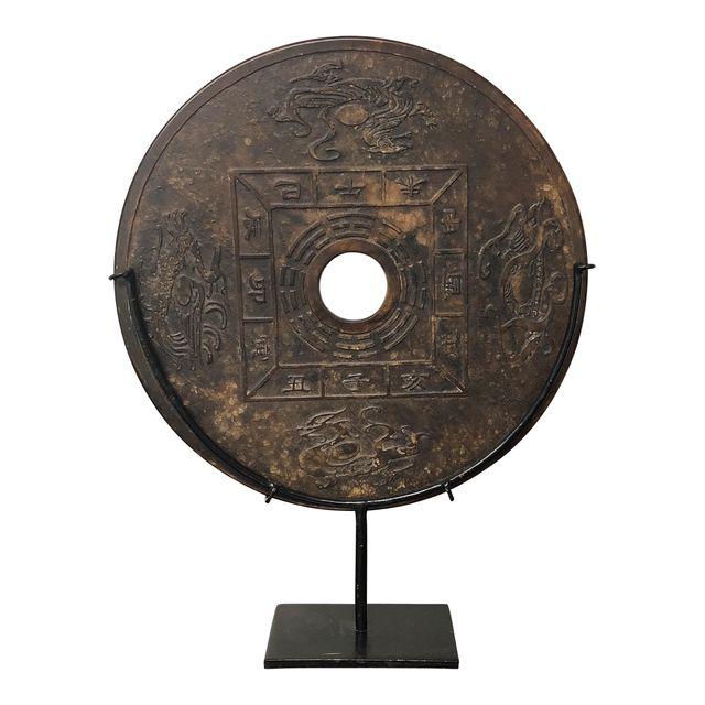 Design Plus Gallery presents a Bronze sculpture. The piece appears to be the shape of Chinese coins. Its age or provenance is not known. It has the same raised decoration on front and back. The disk is set in a Black metal display stand.