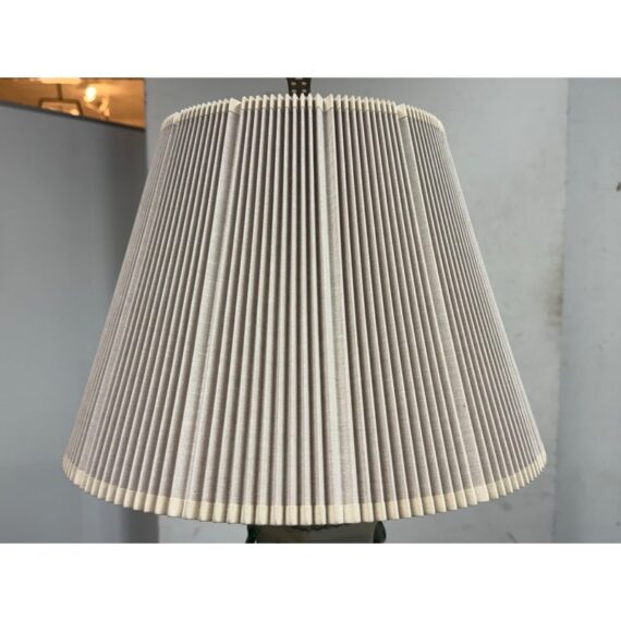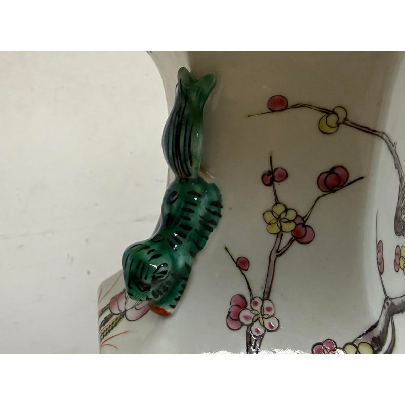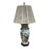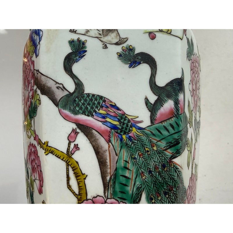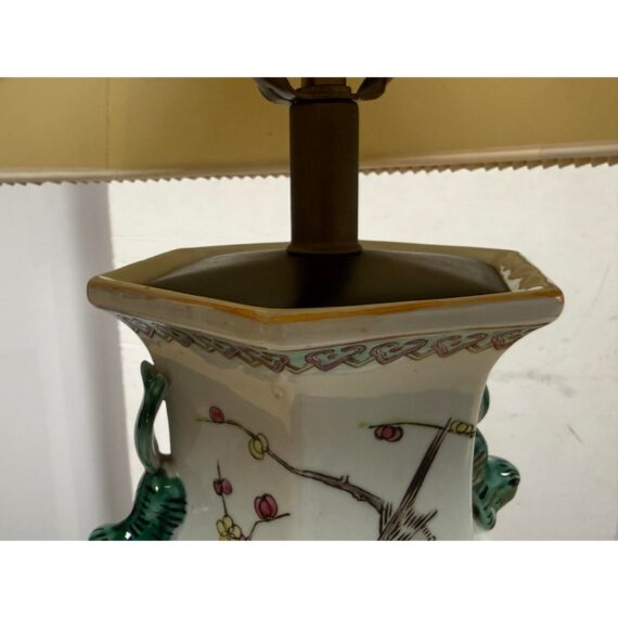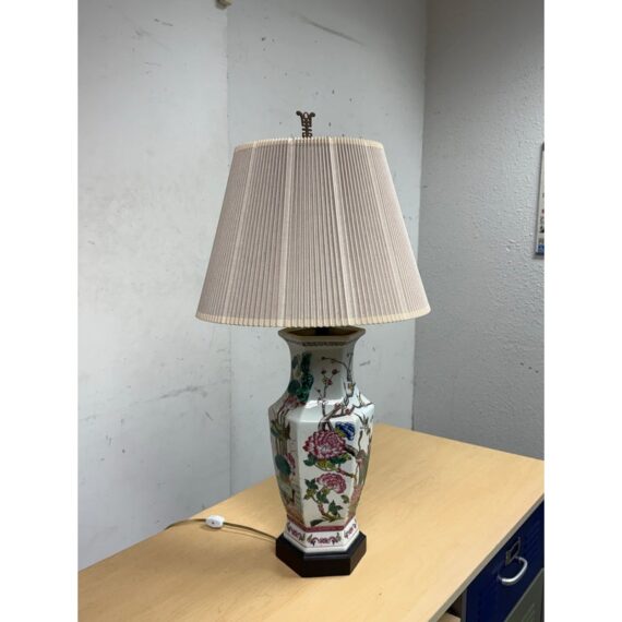 Design Plus Gallery presents a Famille Rose Table Lamp. The lamp has a hand painted porcelain body and rest of an octagonal rosewood tone base. The white background is enriched with painted peacocks on blossoming limbs. The lamp shade is heavily pleated with a brass finial on top. It is in good condition for its usage with minimal visible wear.