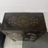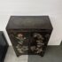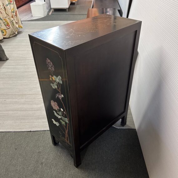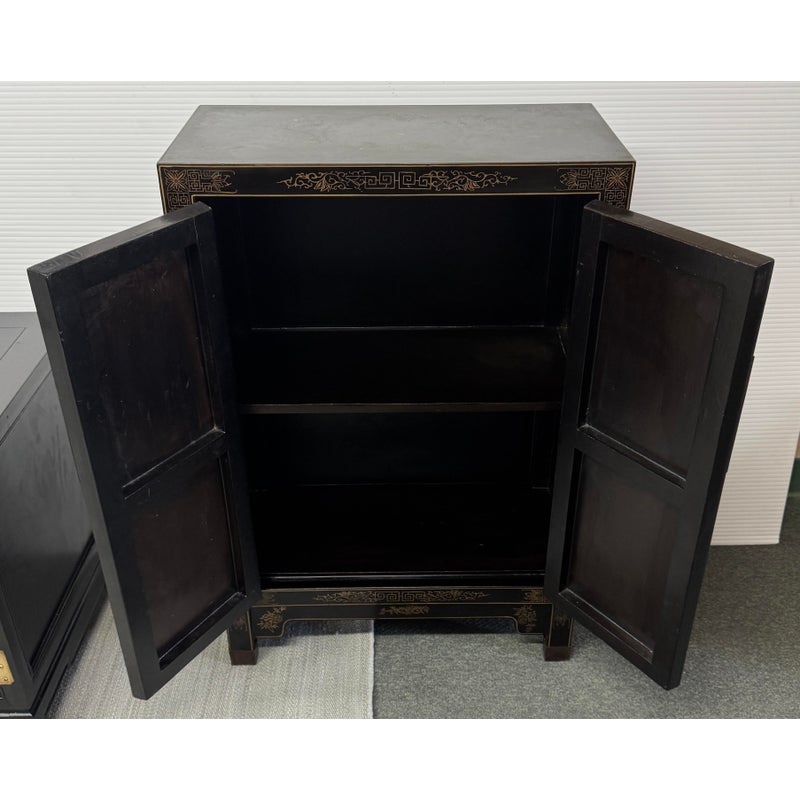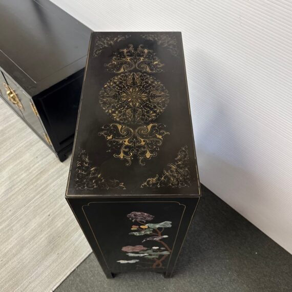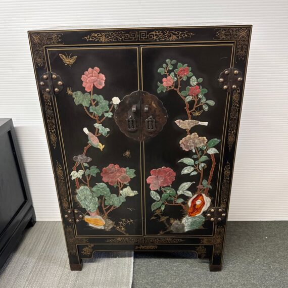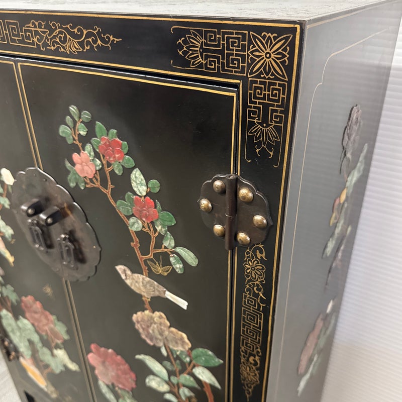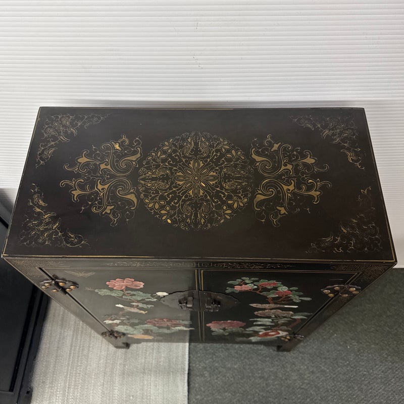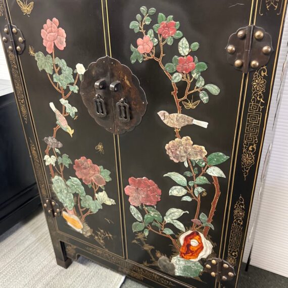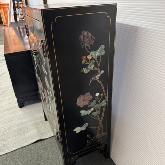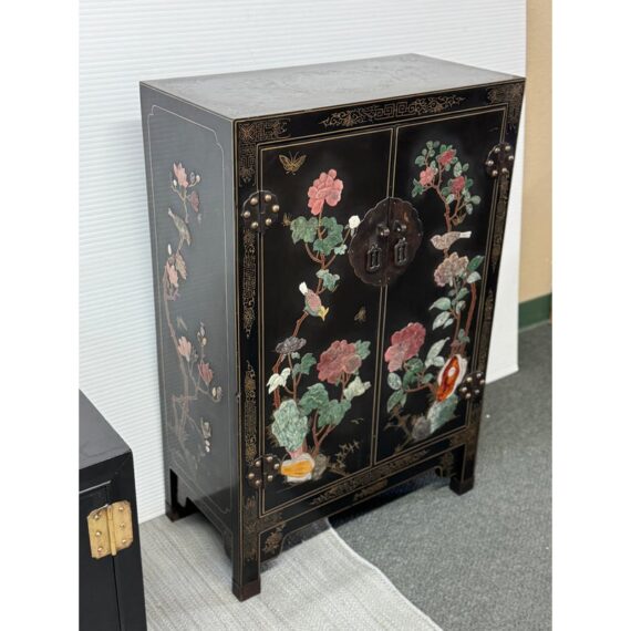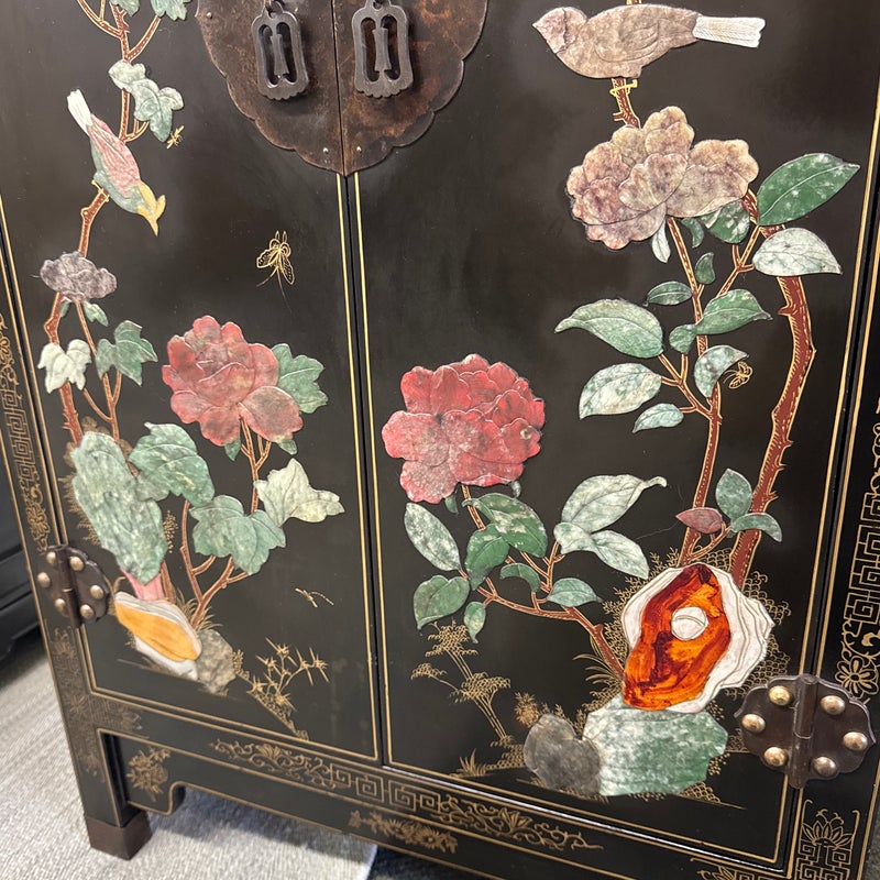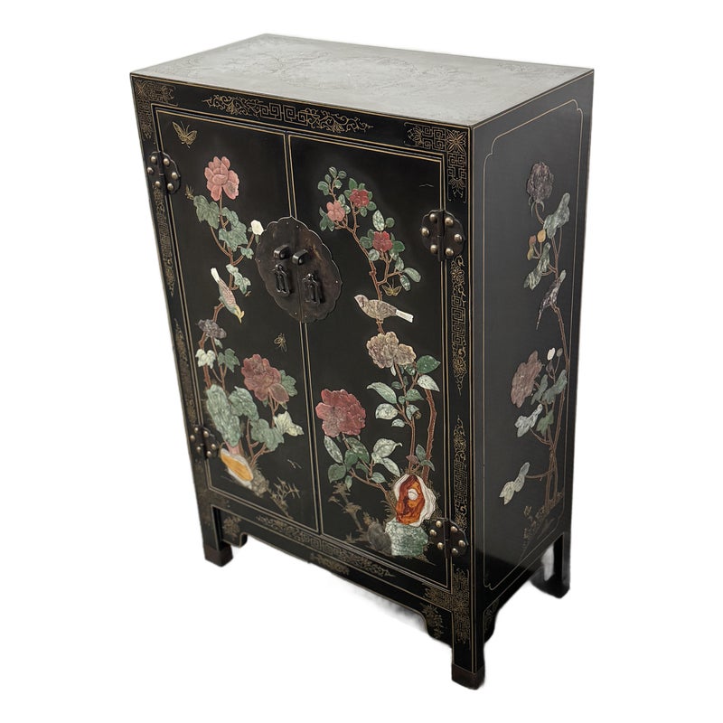 Design Plus Gallery presents a Chinese Lacquered Cabinet of a Vintage Age. The black lacquered wood cabinet is embellished throughout with applied, carved soapstone flowers + intricate gold painted borders with accents. It has a rectangular top with waterfall edges on the sides, a cabinet with exposed brass hinges and a brass escutcheon. The cabinet rests on scrolled bracket feet. The cabinet is missing the pin to lock the doors, but they do stay closed on their own without it.