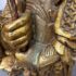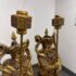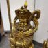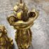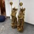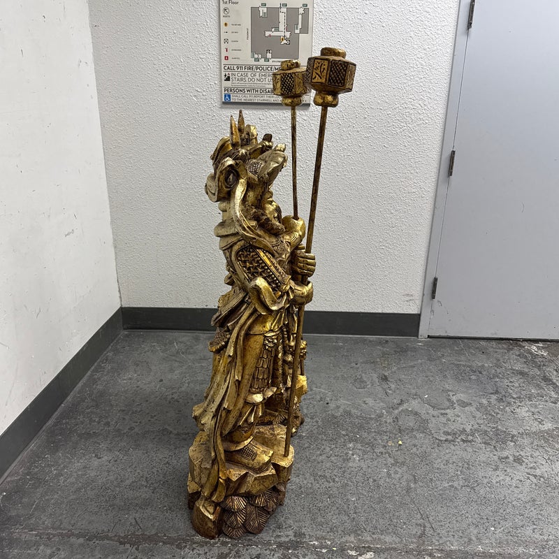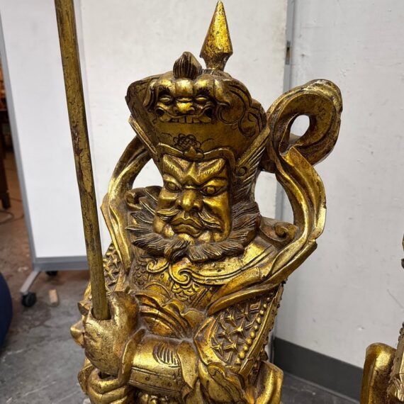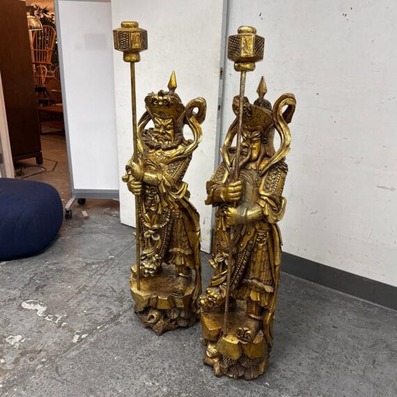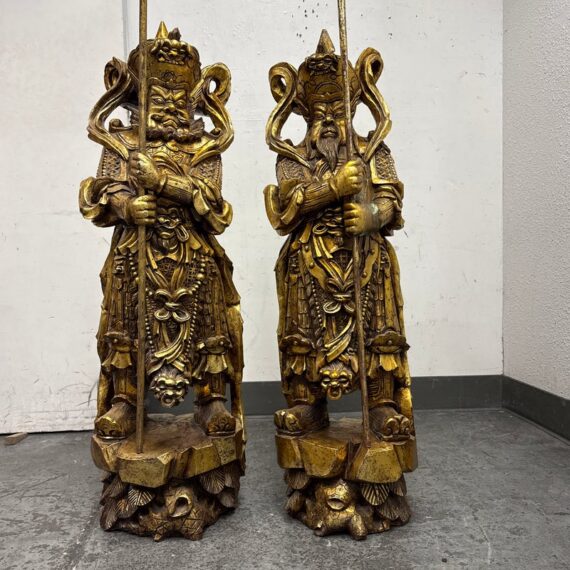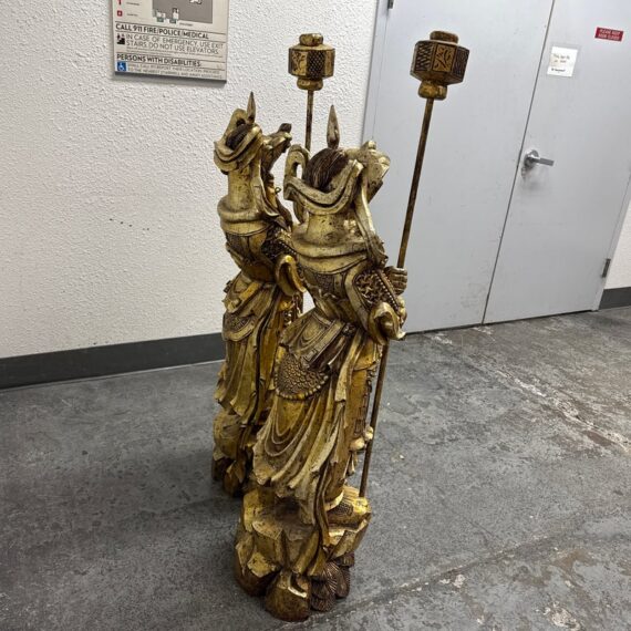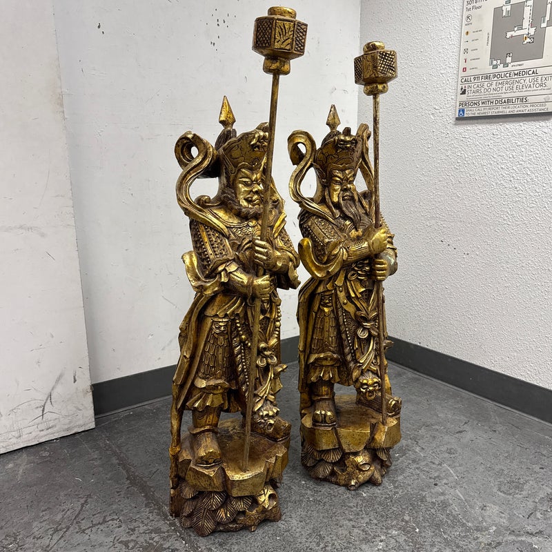 Design Plus Gallery presents a Set of Chinese Menshen Statues of Guan Yu + Wei Tuo. The duo of guardian figures is made of intricate wood carving finished with a gilt surface. They each have ceremonial staffs rising above elaborately detailed robes and armor. Expressive faces, scrolling forms, and layered ornamental motifs give each statue a strong sculptural presence, while the carved bases add further dimension and texture. Guan Yu represents loyalty and justice, while Wei Tuo symbolizes spiritual protection and discipline. They are in good condition with visible distress to the gold finish and minimal wear from usage.