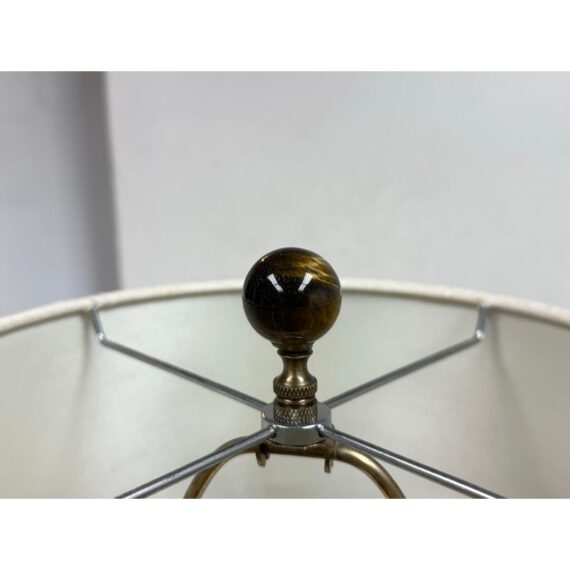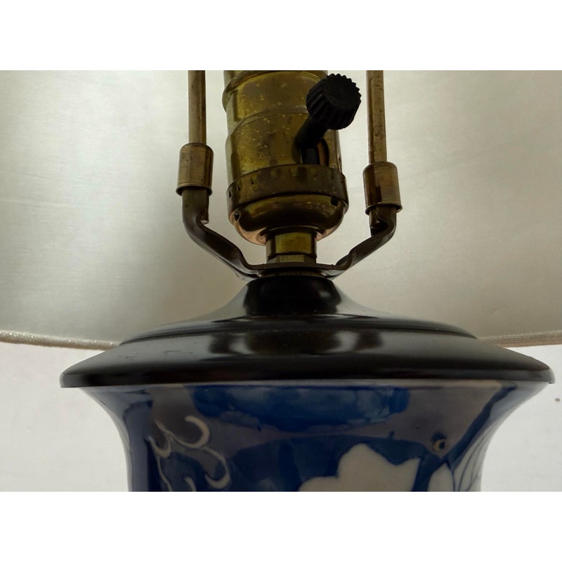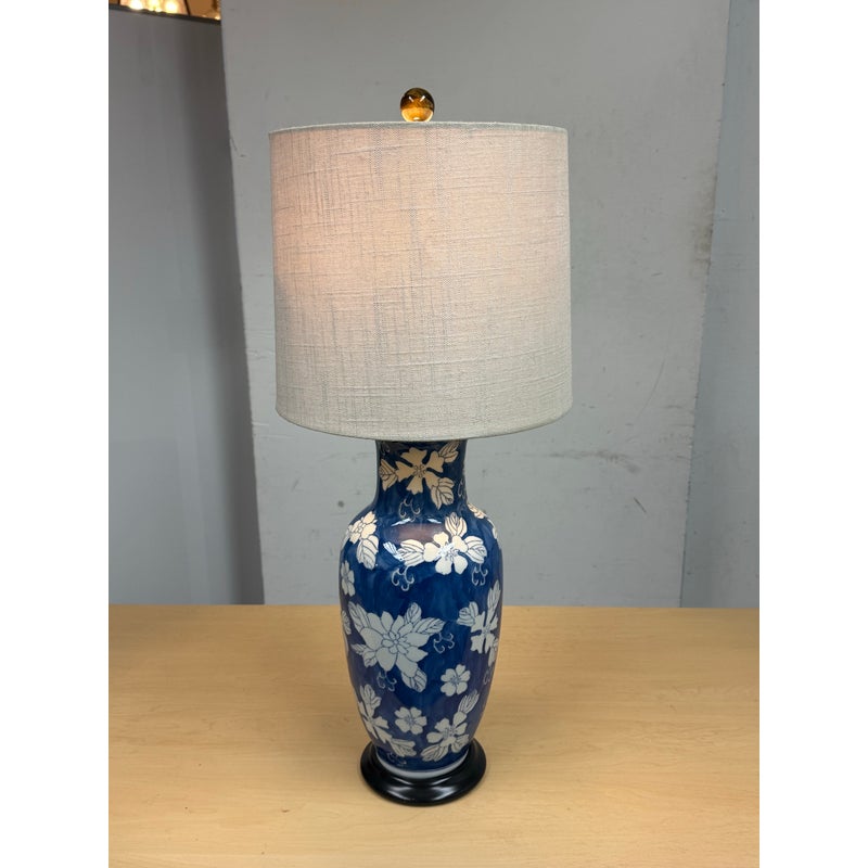 Design Plus Gallery presents a Blue with White Flower Table Lamp. The body of the lamp is vase like and porcelain with a medium blue background and a plentitude of white lily shaped flowers. The lamp had is a linen blend with a top brass finial. It is in good condition for its usage.