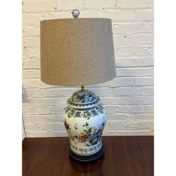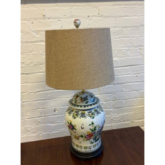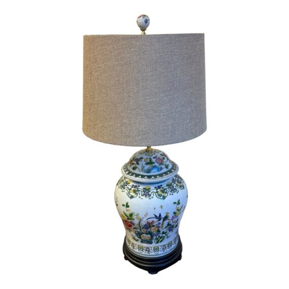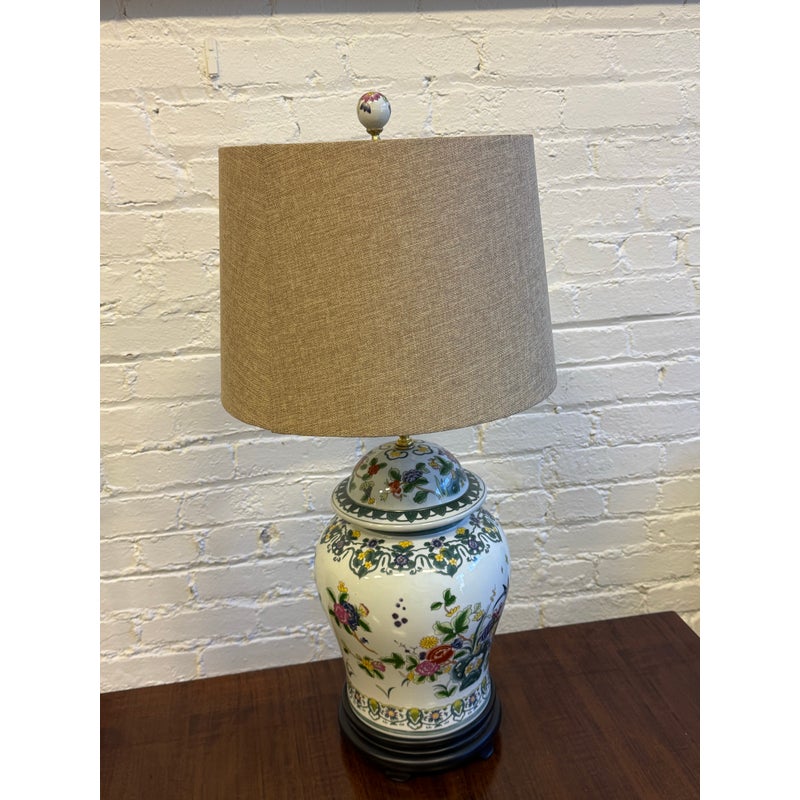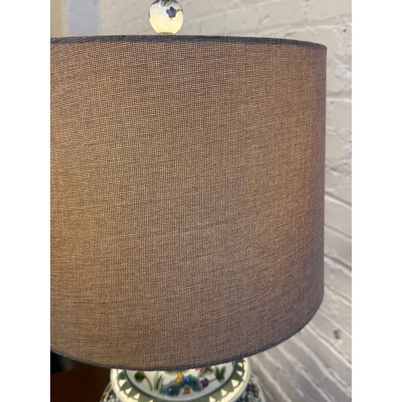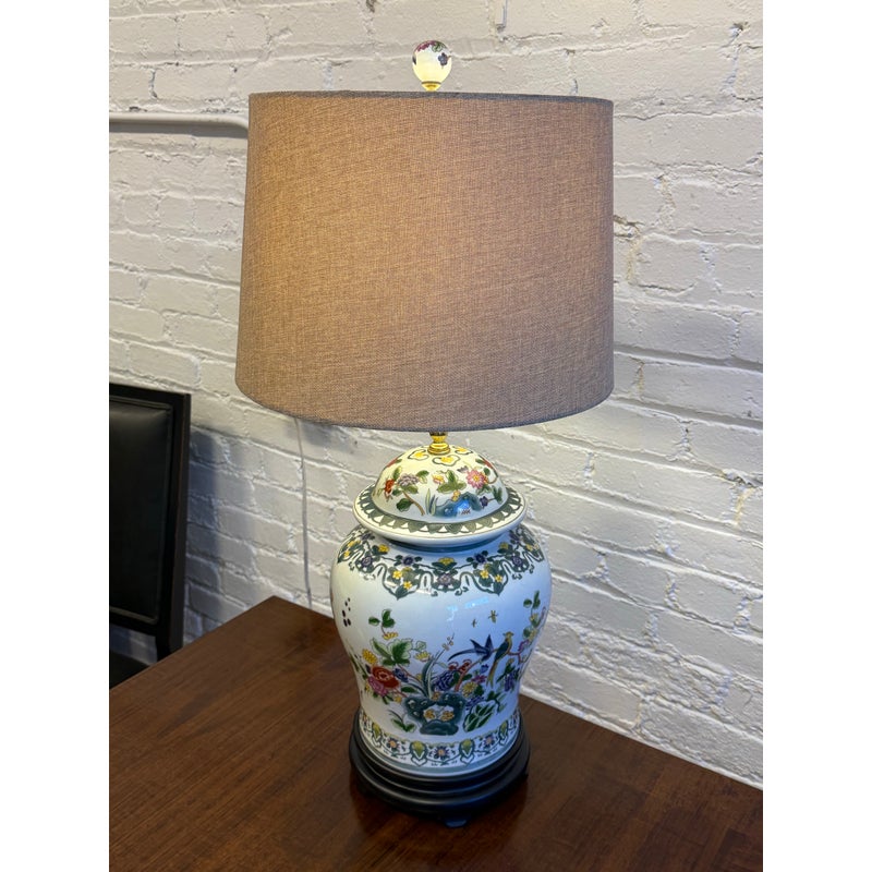 Design Plus Gallery presents a Famille Rose Temple Jar Table Lamp. This table lamp is made with decorative depictions of indigo colored rocks, flower blooms, buds, berries, and grass. Natural, enriched colors are jumping off of its white ceramic background of not only on the vase part of the lamp but on its complimentary finial ball. There is a natural lamp shade of tan linen in a drum shade to included. The lamp is in good condition for its usage.