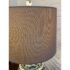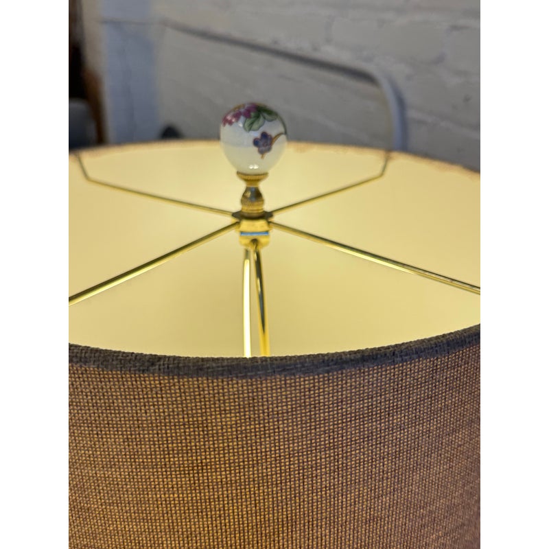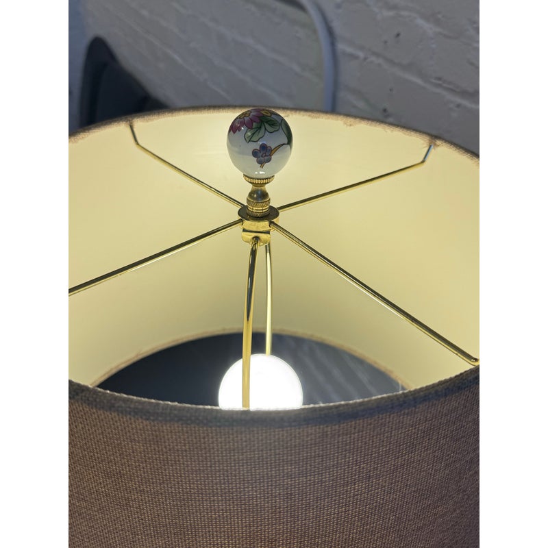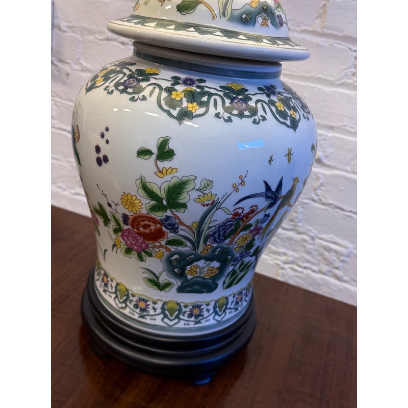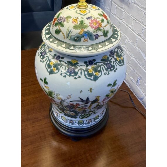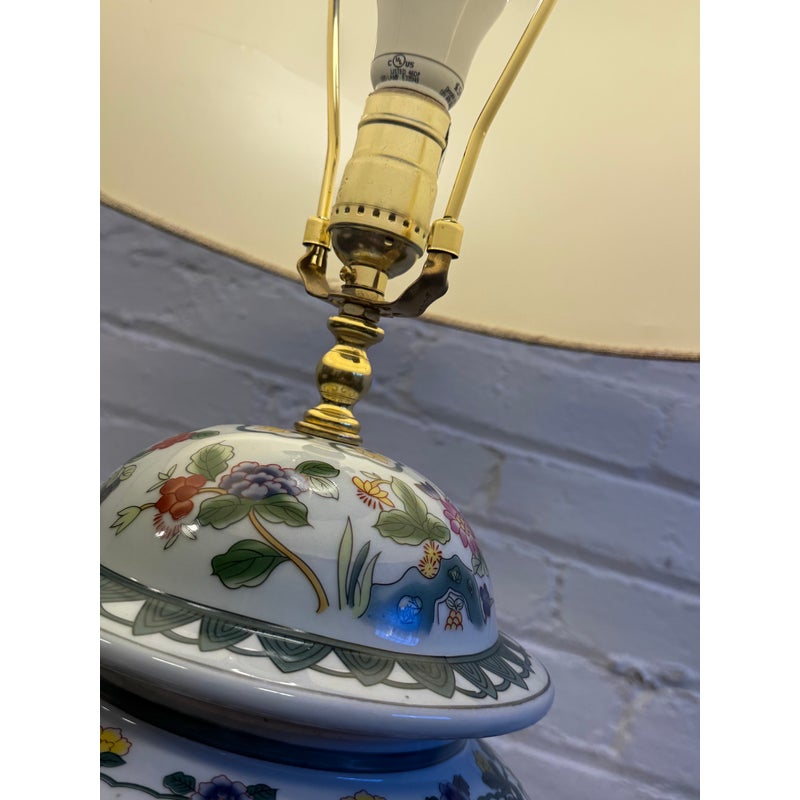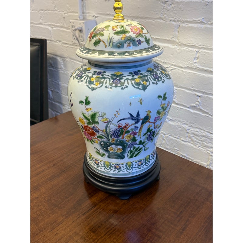 Design Plus Gallery presents a Famille Rose Temple Jar Table Lamp. This table lamp is made with decorative depictions of indigo colored rocks, flower blooms, buds, berries, and grass. Natural, enriched colors are jumping off of its white ceramic background of not only on the vase part of the lamp but on its complimentary finial ball. There is a natural lamp shade of tan linen in a drum shade to included. The lamp is in good condition for its usage.
