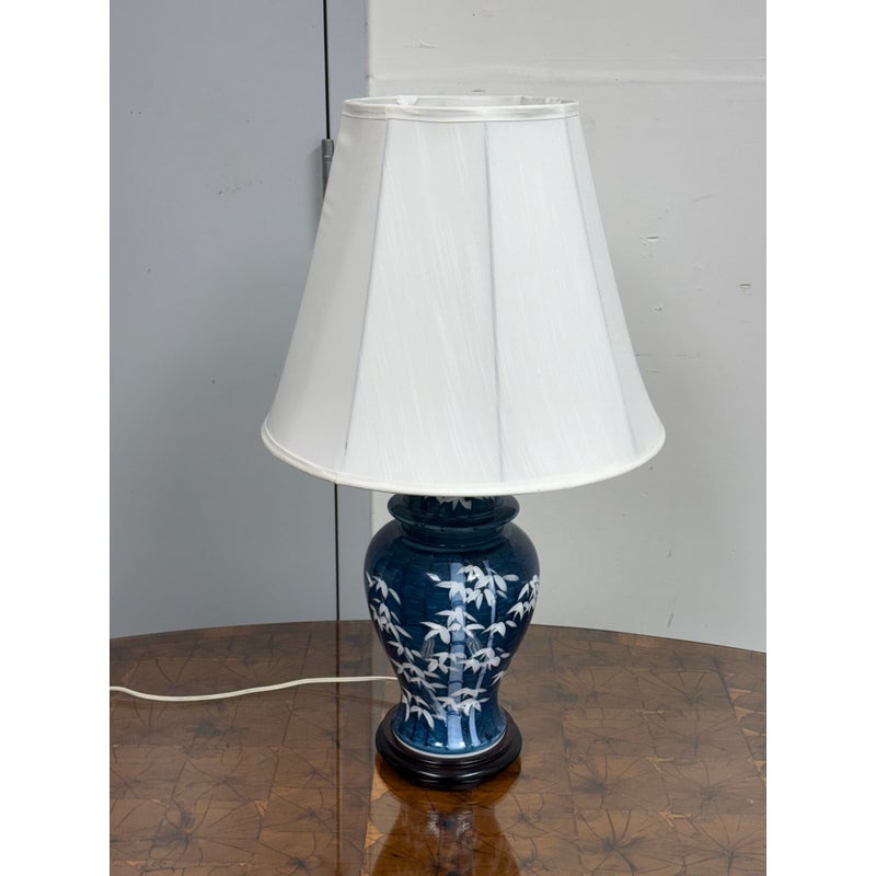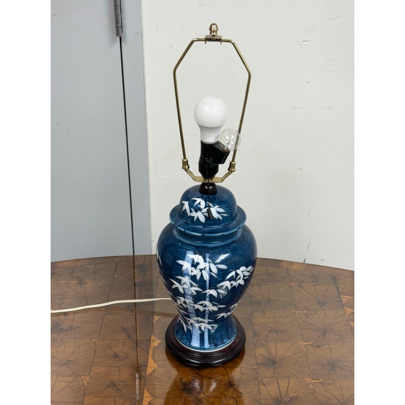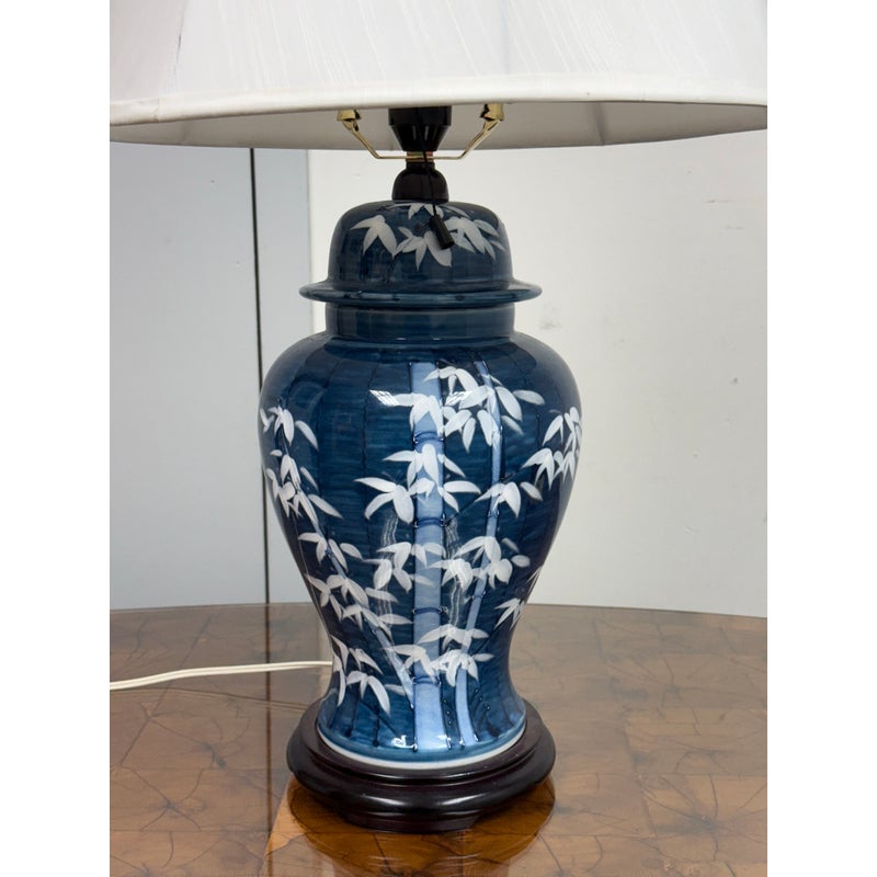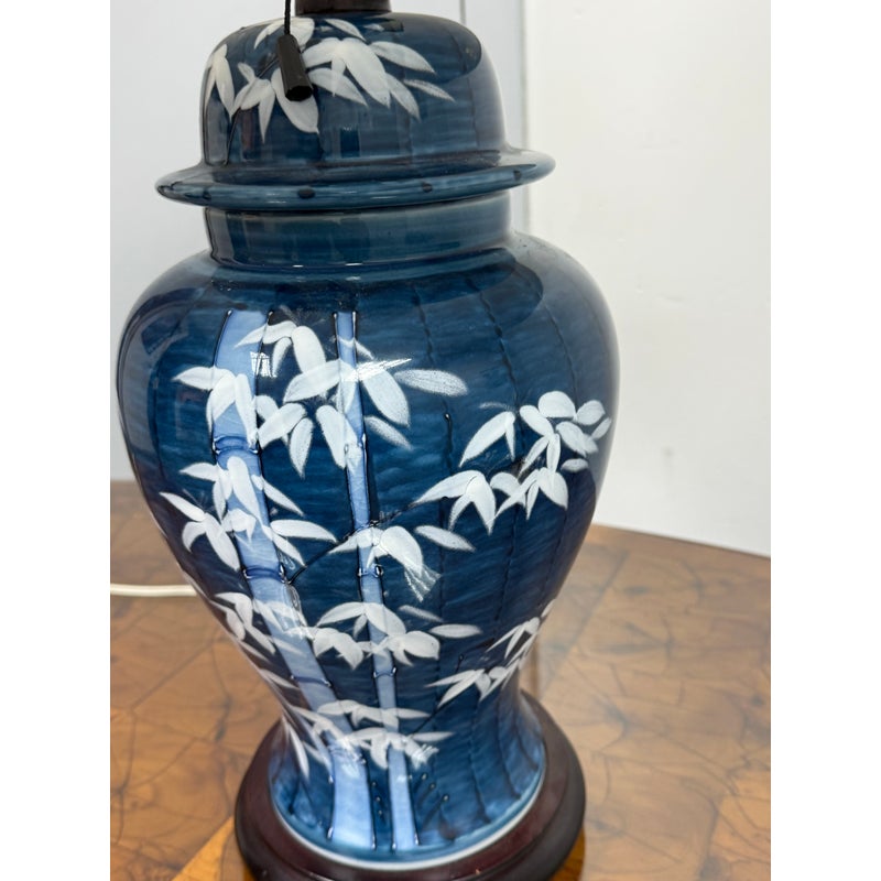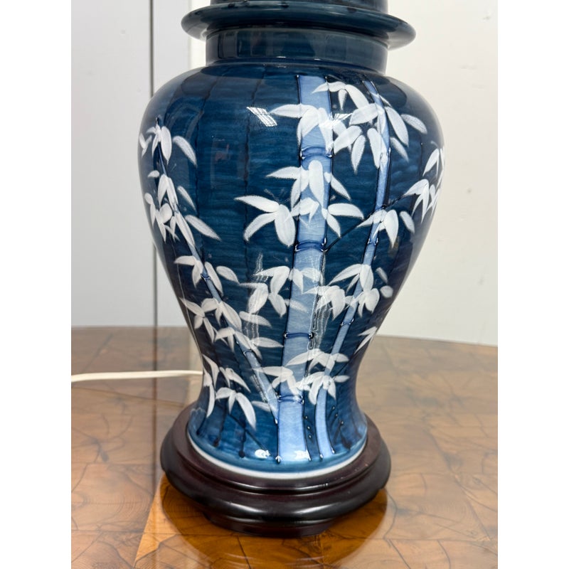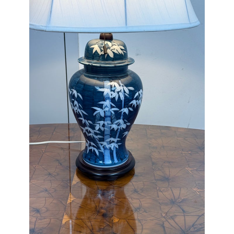 Design Plus Gallery presents the Lucky Bamboo Table Lamp. The lamp offers a lidded ginger jar ceramic body of blue with white flowering bamboo rods. The lamp rests on a wood base for supports and offers a trumpet silk shade. Is in good condition with minimal surface wear.