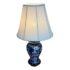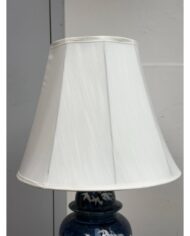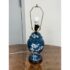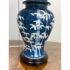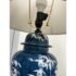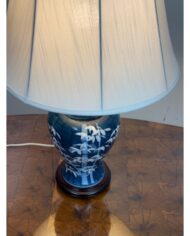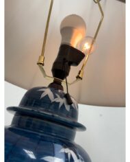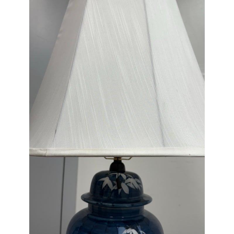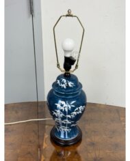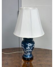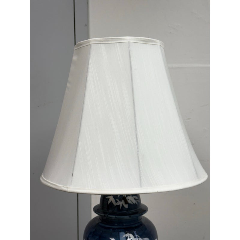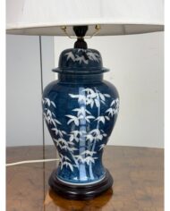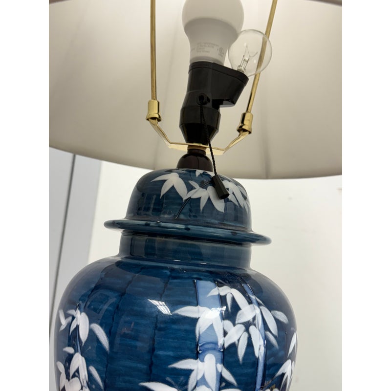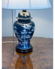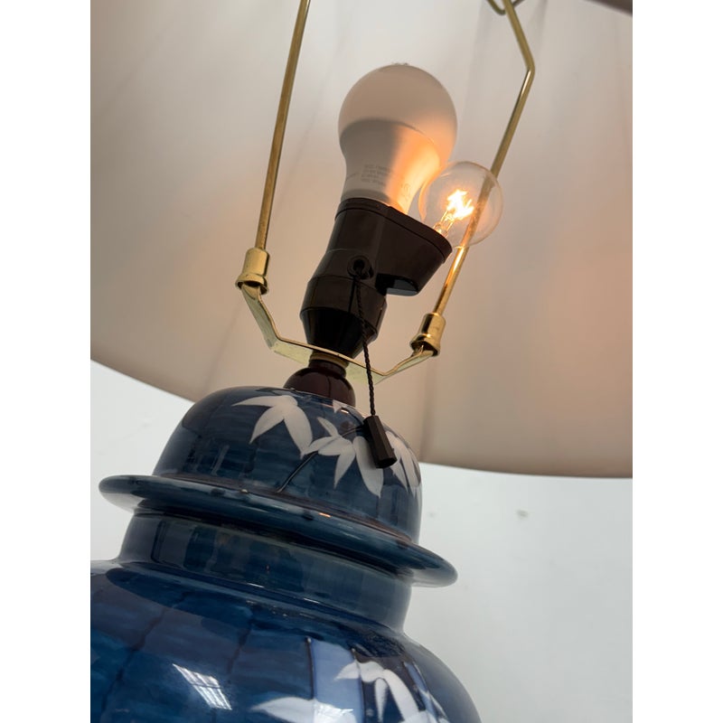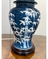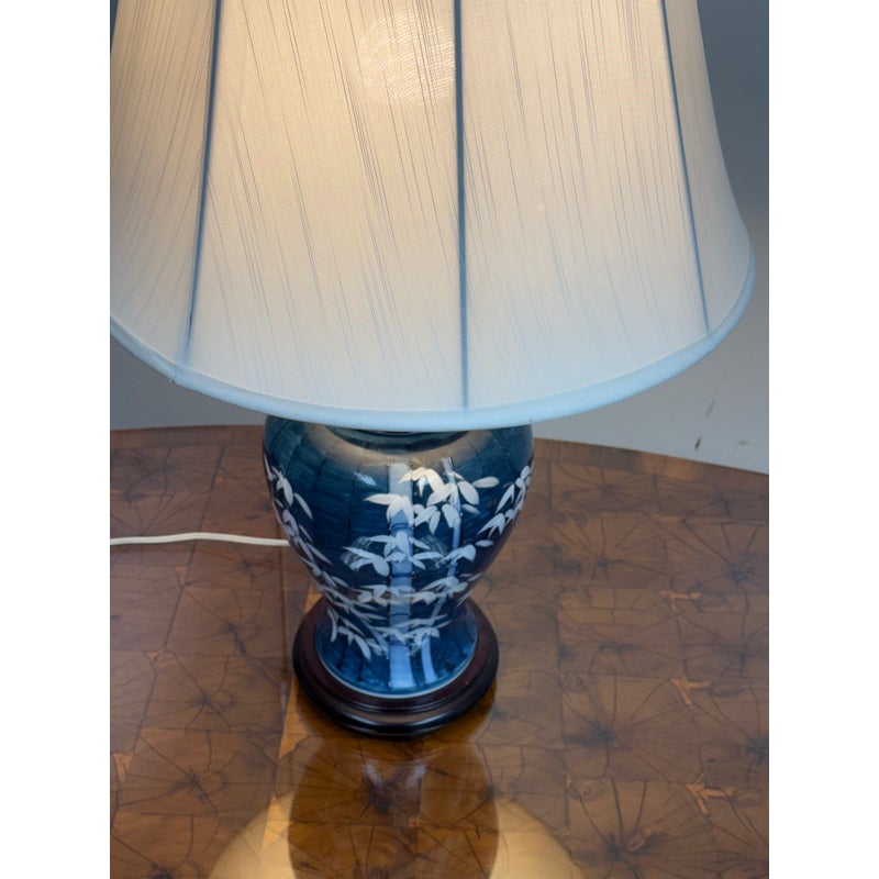 Design Plus Gallery presents the Lucky Bamboo Table Lamp. The lamp offers a lidded ginger jar ceramic body of blue with white flowering bamboo rods. The lamp rests on a wood base for supports and offers a trumpet silk shade. Is in good condition with minimal surface wear.