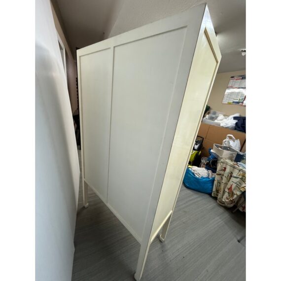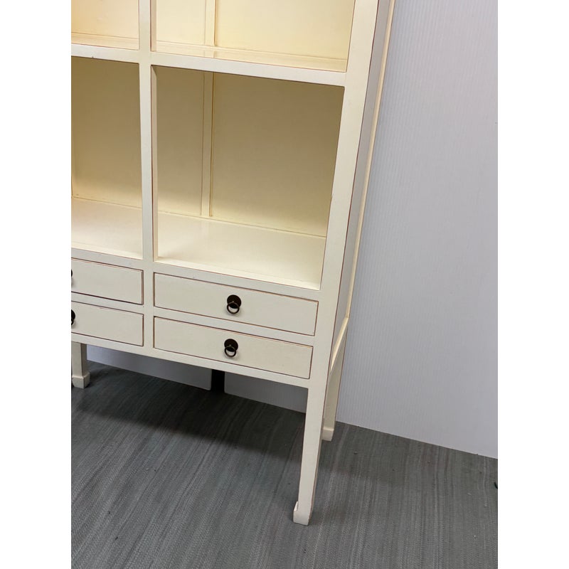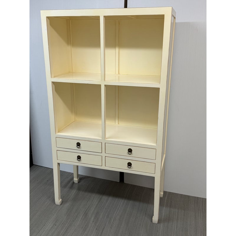 Design Plus Gallery presents a Chinoiserie Zen Ivory Finish Bookcase. A refined union of Chinoiserie charm and Ming-era elegance, this bookcase is crafted from elmwood and finished in a soft ivory that accentuates its clean, architectural lines. The upper section presents four well-proportioned cubbies, ideal for showcasing books, ceramics, or curated objects. Below, four drawers offer discreet storage to keep the silhouette serene. Set on four slender legs that culminate in classic Ming curved feet, it stands with a graceful, elevated presence, bringing quiet sophistication to living rooms, studies, and entryways alike. In good condition, visible and minimal wear from usage.