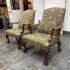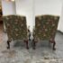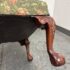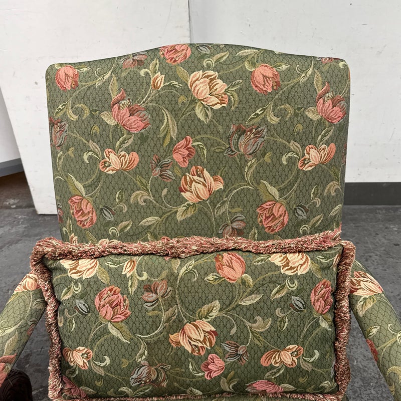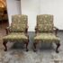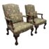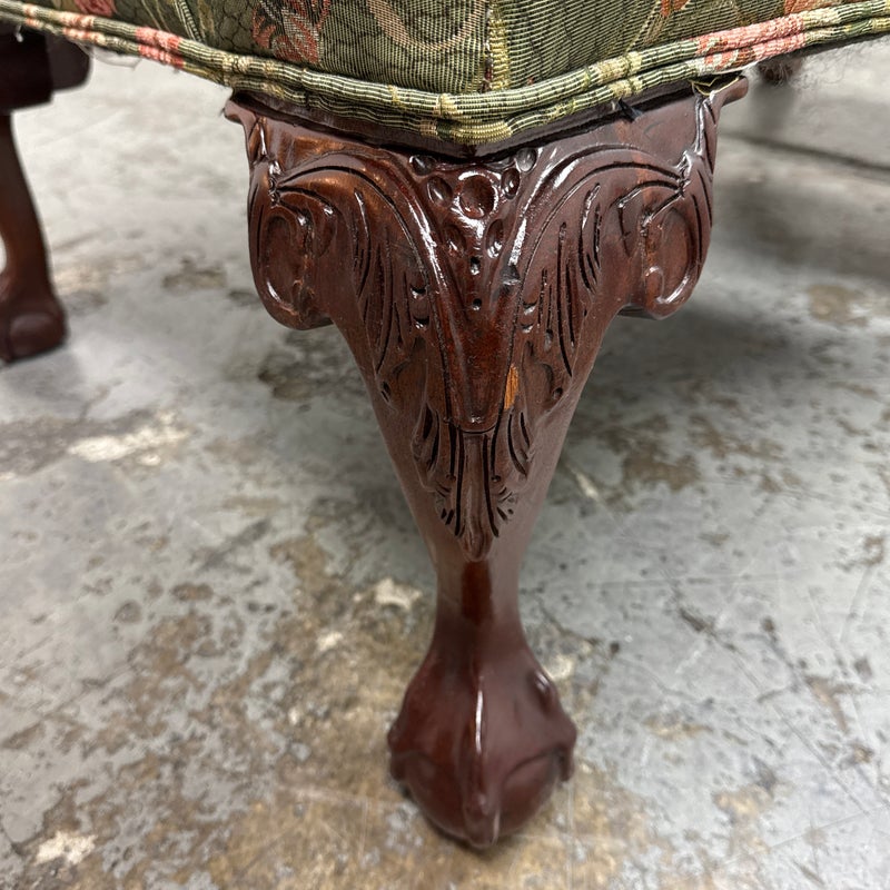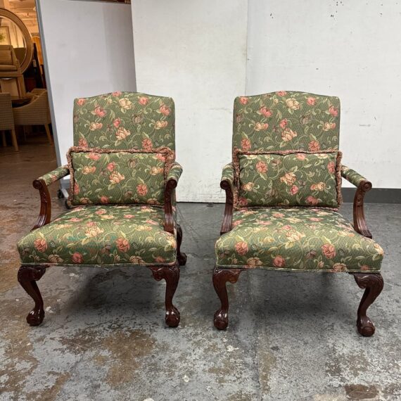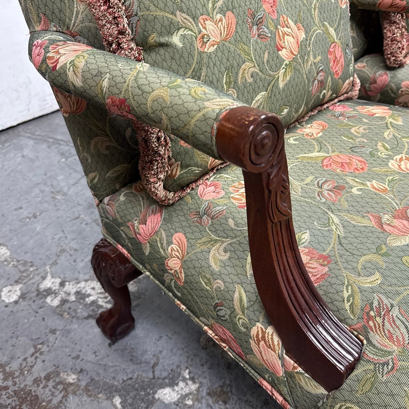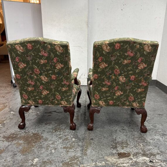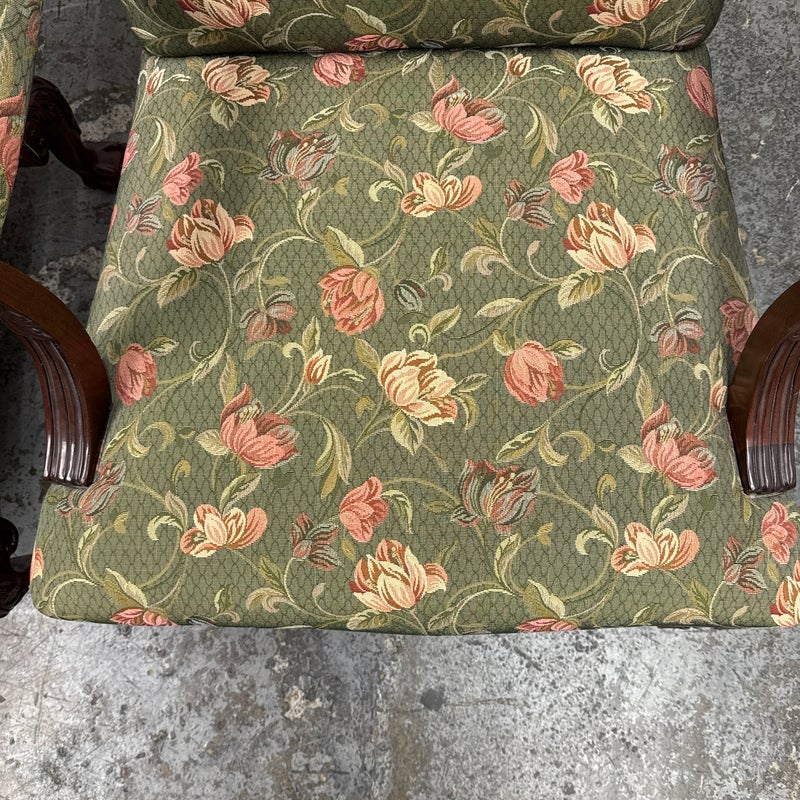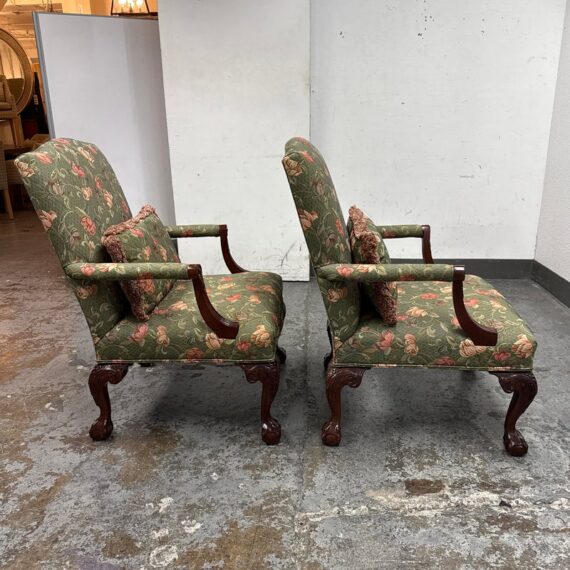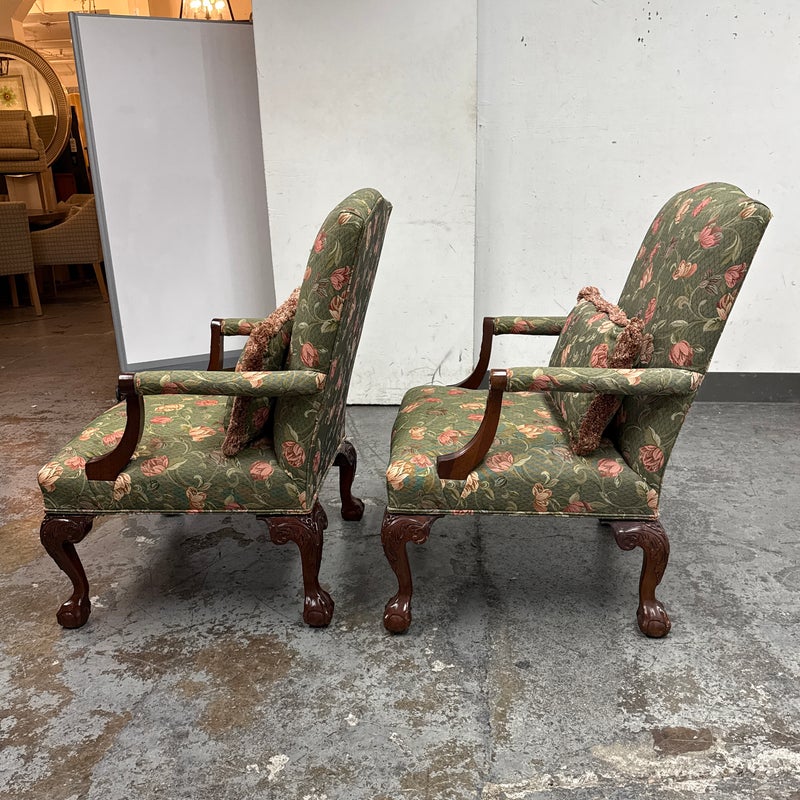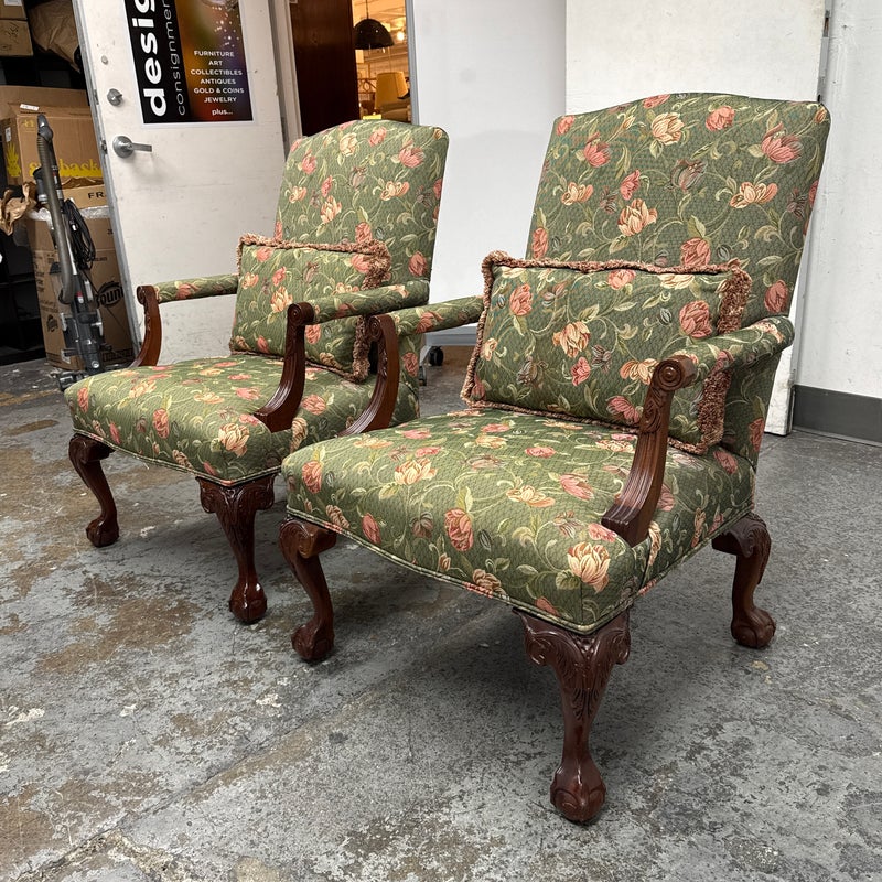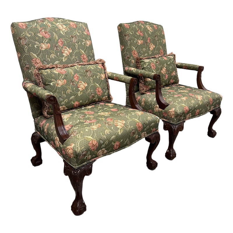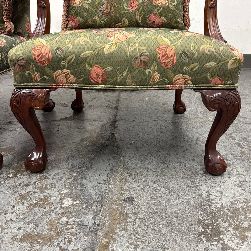 Design Plus Gallery presents a Pair of Carved Mahogany Chippendale Chairs. The set were customized from top to bottom with superior finishes and fine details. The fabric on the upper portion of the chairs from has a green background with faint trellis in gold and overlapping flowers of red + peach. Their legs have tremendous detail as well with open arms with upholstered rests, acanthus leaf joinery at top of the legs followed with ball-in-claw feet. the chairs have two throw pillow with fringe detail in the same fabric. Overall the chairs are in good condition with slight visible wear for their usage.