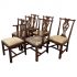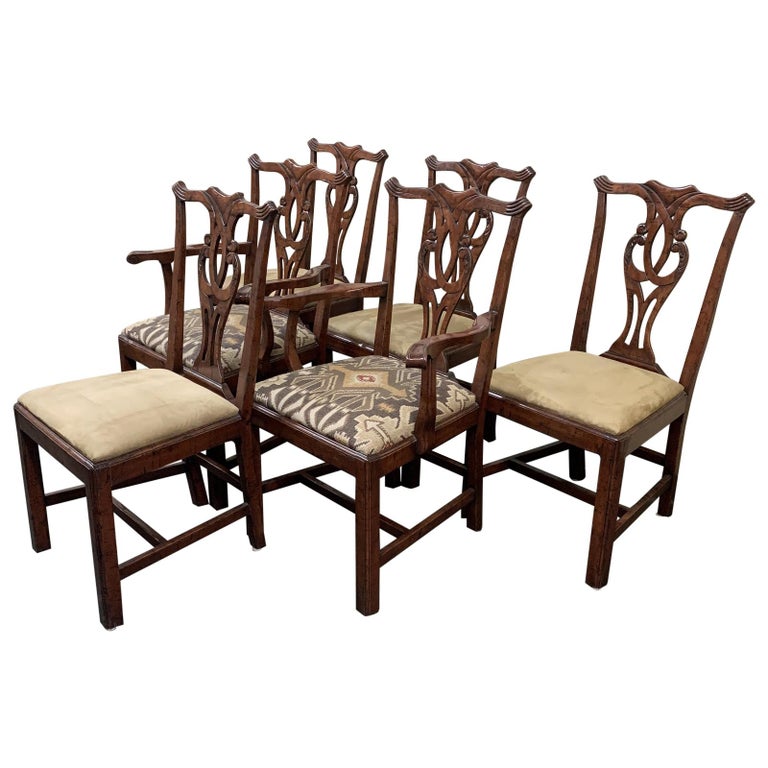 Design Plus Gallery presents a Set of Six Traditional Style Walnut Finished Chairs. A unique fusion of styles with Regency Chippendale inspired backs that simplify into a Stickley influenced base. Arm chairs are upholstered with an neutral Navajo inspired woven with yellow and red accents. Side chairs upholstered in corresponding neutral micro fiber fabric.