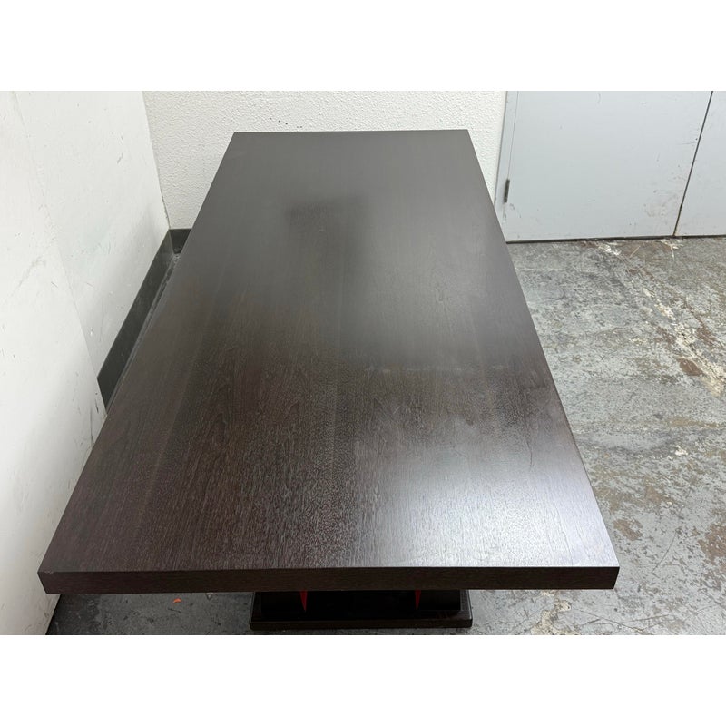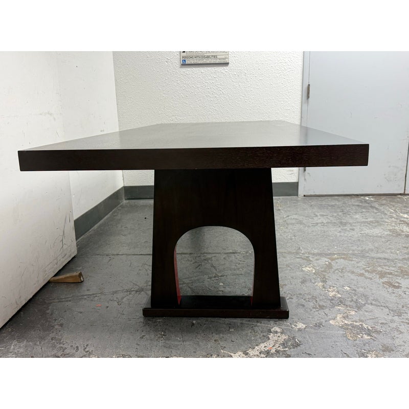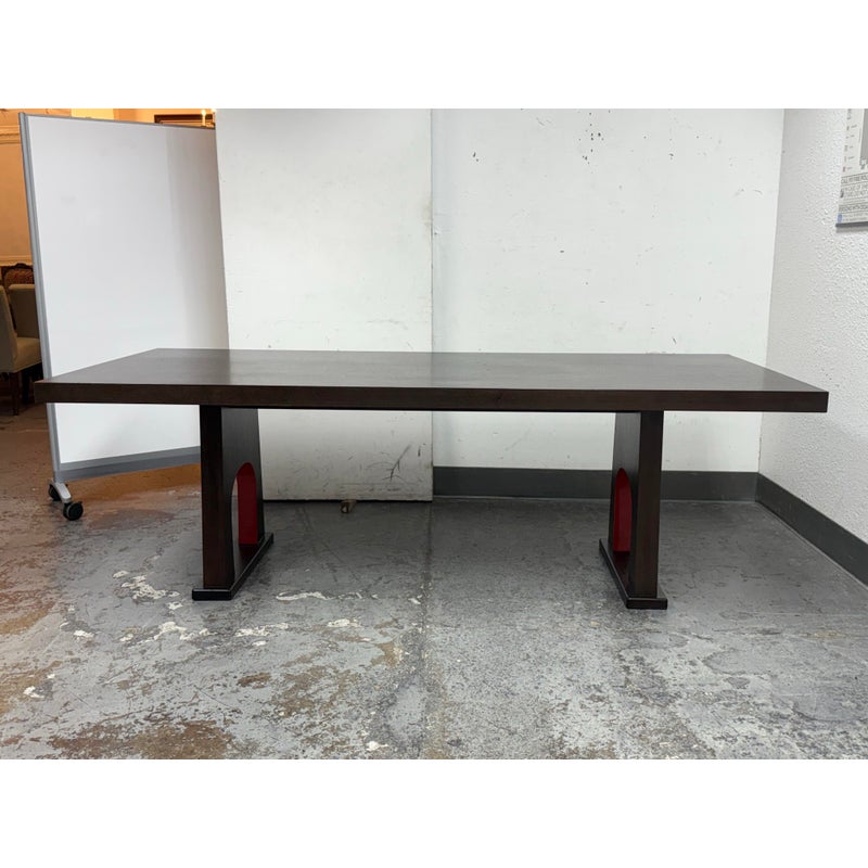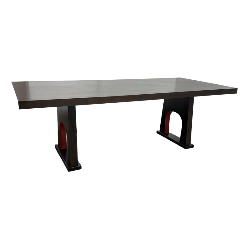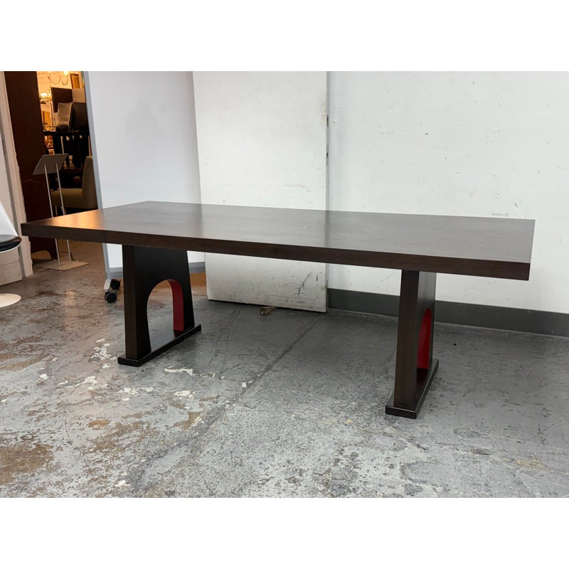 Design Plus Gallery presents the Cipangu Dining Table from Holly Hunt. Designed by Christian Liaigre. The table is in a dark mahogany wood with two arched legs that have red lacquer painted on the inside of the crest. Christian Liaigre by Holly Hunt tag. Is in good condition with minimal signs of wear.