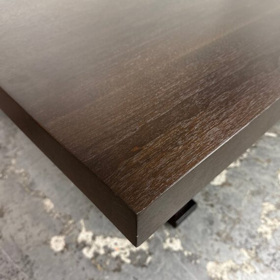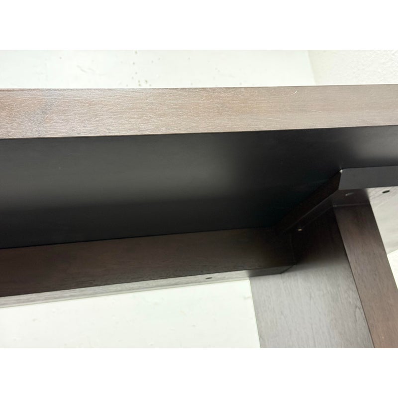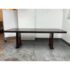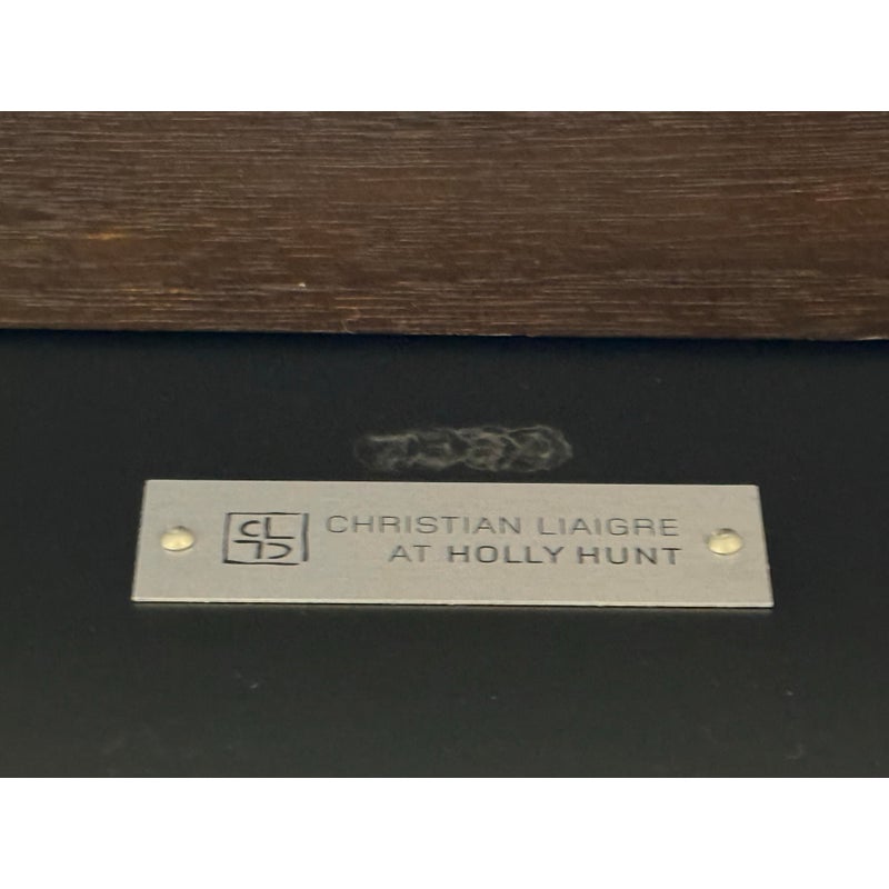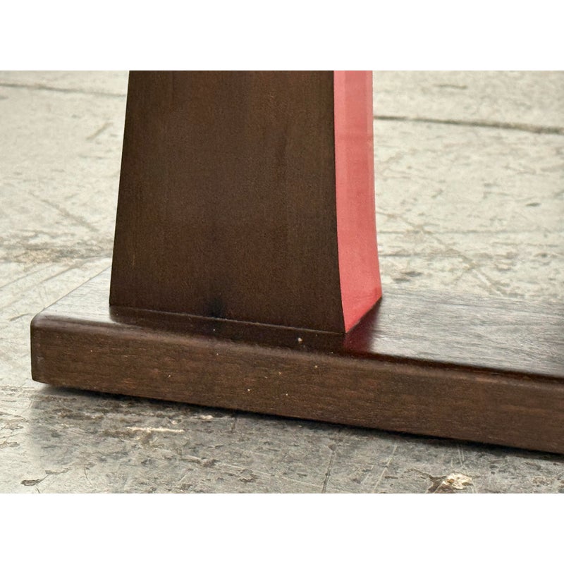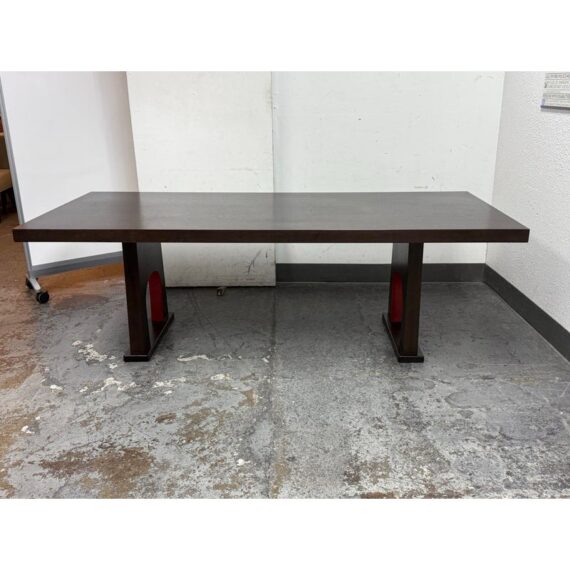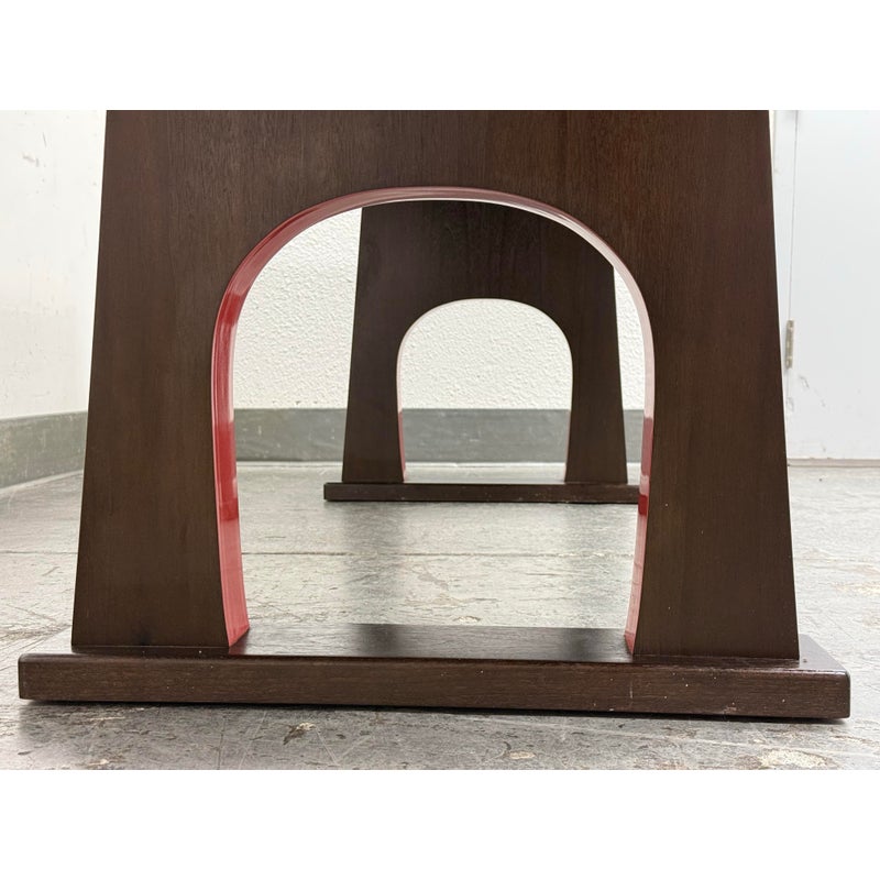 Design Plus Gallery presents the Cipangu Dining Table from Holly Hunt. Designed by Christian Liaigre. The table is in a dark mahogany wood with two arched legs that have red lacquer painted on the inside of the crest. Christian Liaigre by Holly Hunt tag. Is in good condition with minimal signs of wear.