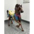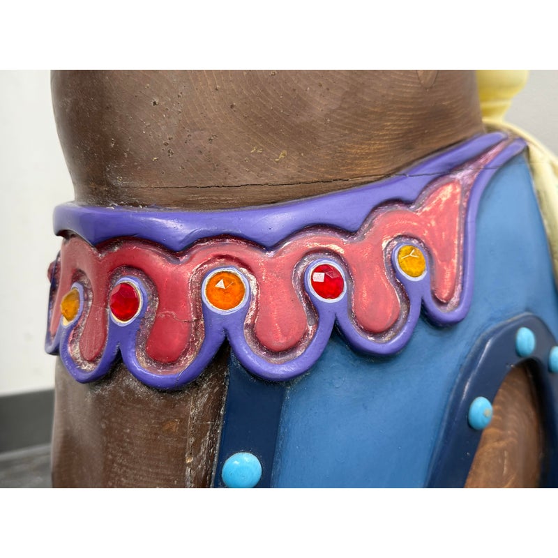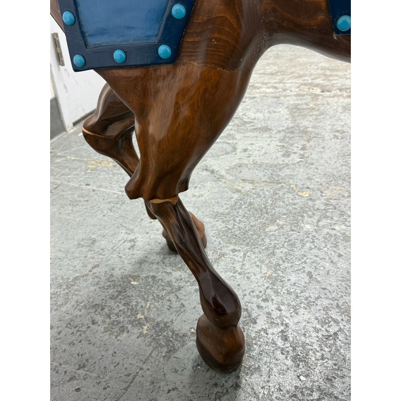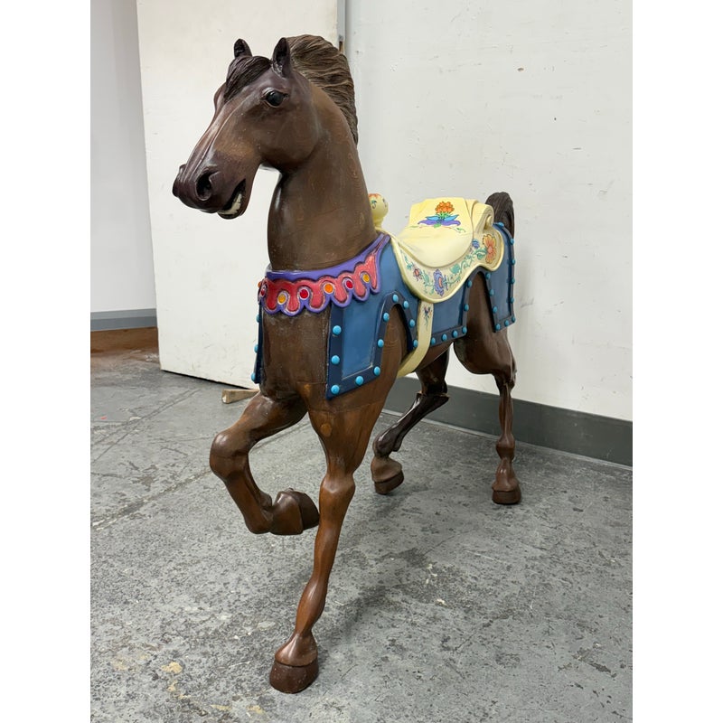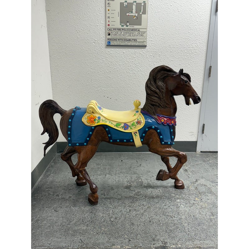 Design Plus Gallery presents a Carousel Horse that was Hand Made by Sante Fe Artist Christopher Olson. Standing at nearly four feet tall, this nearly life size horse is great to admire and enjoy in your children’s nursery. A striking piece for your horse crazed child, the brown horse has a cream toned saddle with pretty dressage around it color. Is in good condition for its usage.