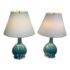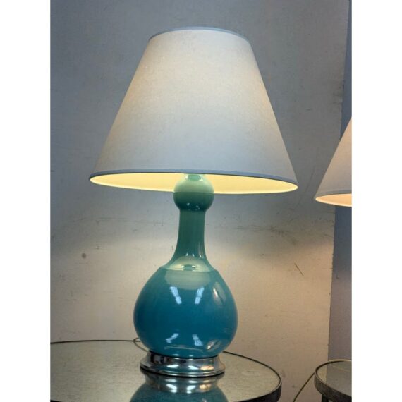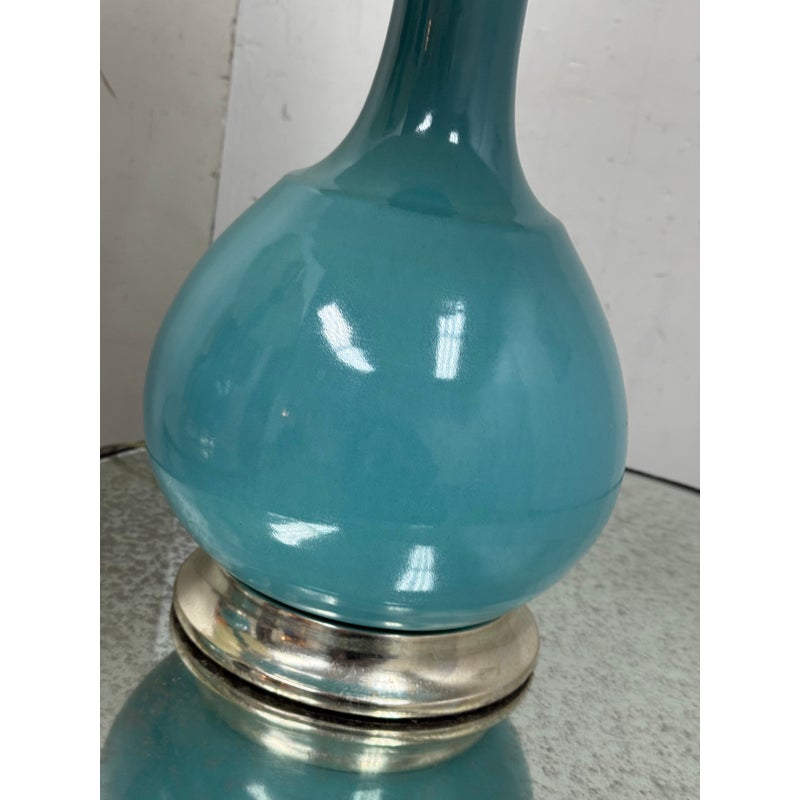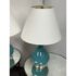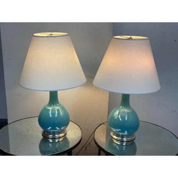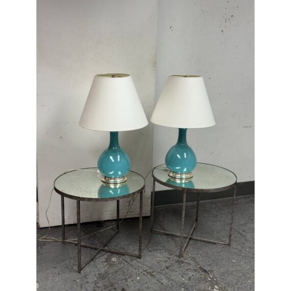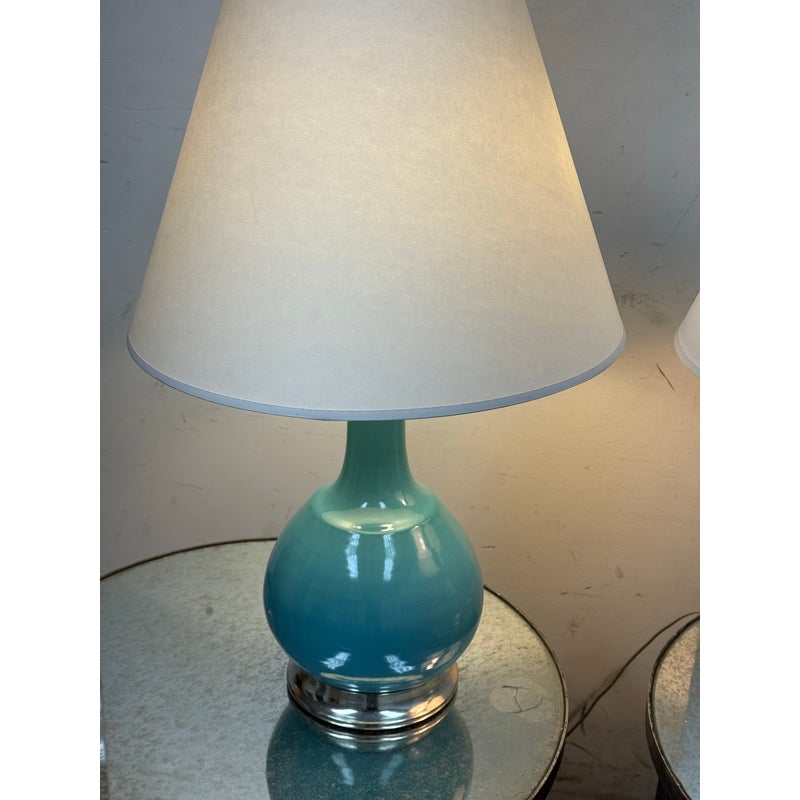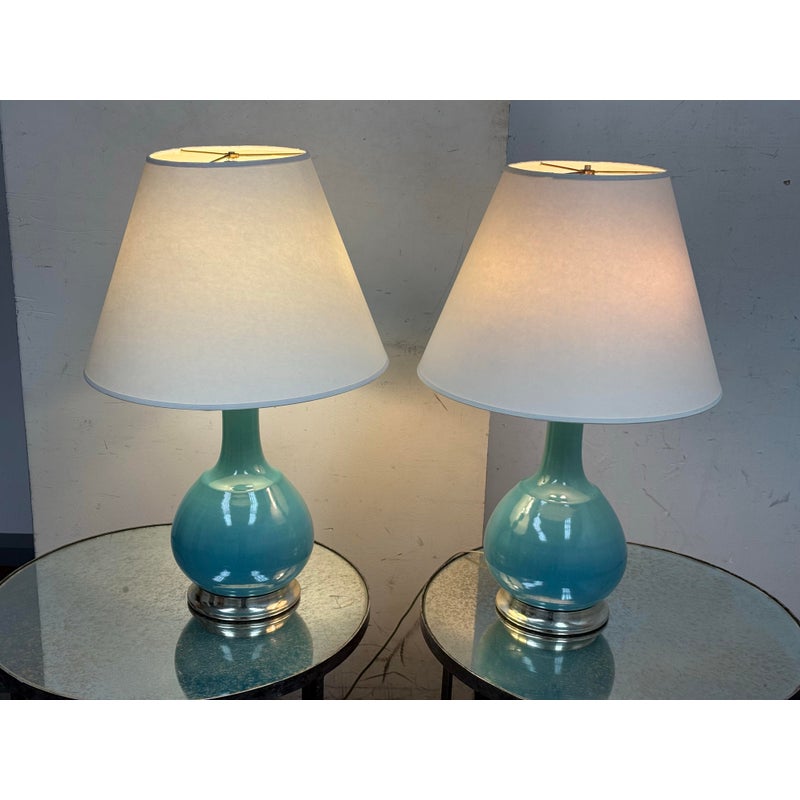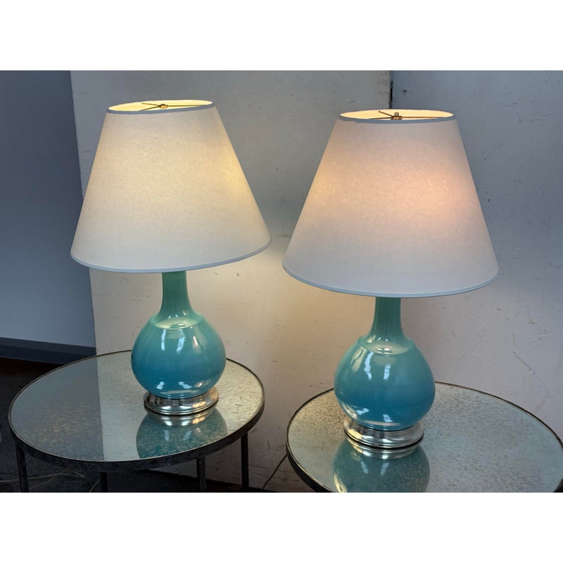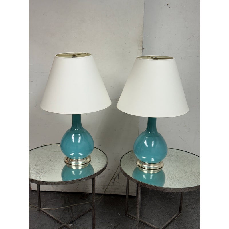 Design Plus Gallery presents the Cameron Table Lamps in Hydrangea by Christopher Spitzmiller, Inc. The lamps are of the highest quality and come at a premium price. The body of the lamps are in a teal, their tone Hydrangea, with a white gold finish base and double socket exposure. They are both in good condition for their usage with their only flaw being missing finials. Made in the USA.