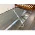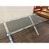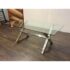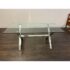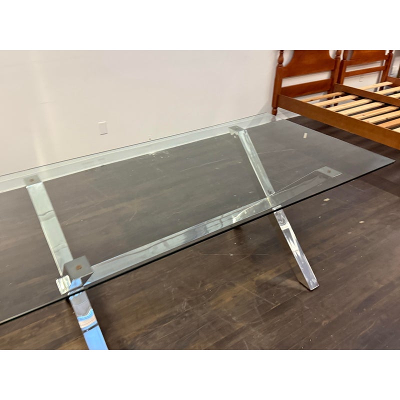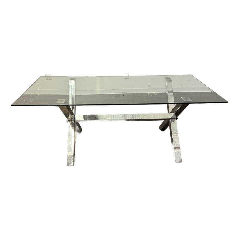 Design Plus Gallery presents a Chrome and Tempered Glass Dining Table. This style of table is popular in the late 20th century and was influenced by early Ralph Lauren Home. The table has a shiny base of chrome with two cross hatch ends and an interior stretcher connecting them. There is a thick, tempered glass table top that is removable for easy moving. It is in good condition for its usage.