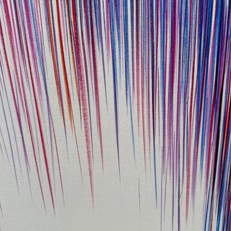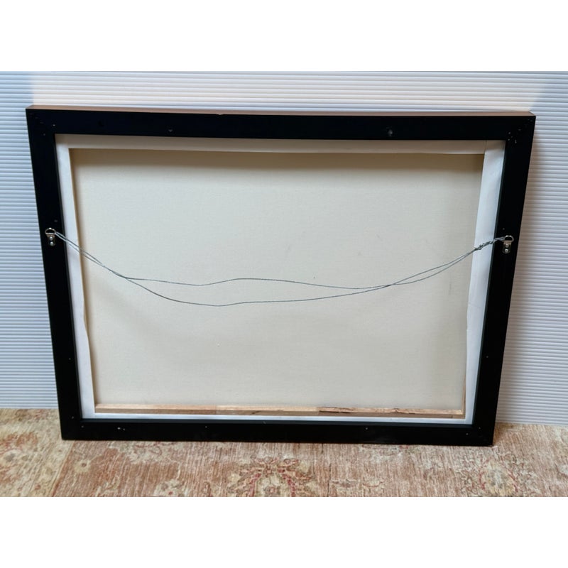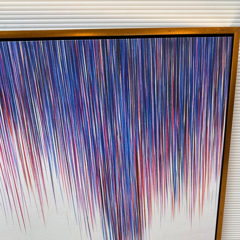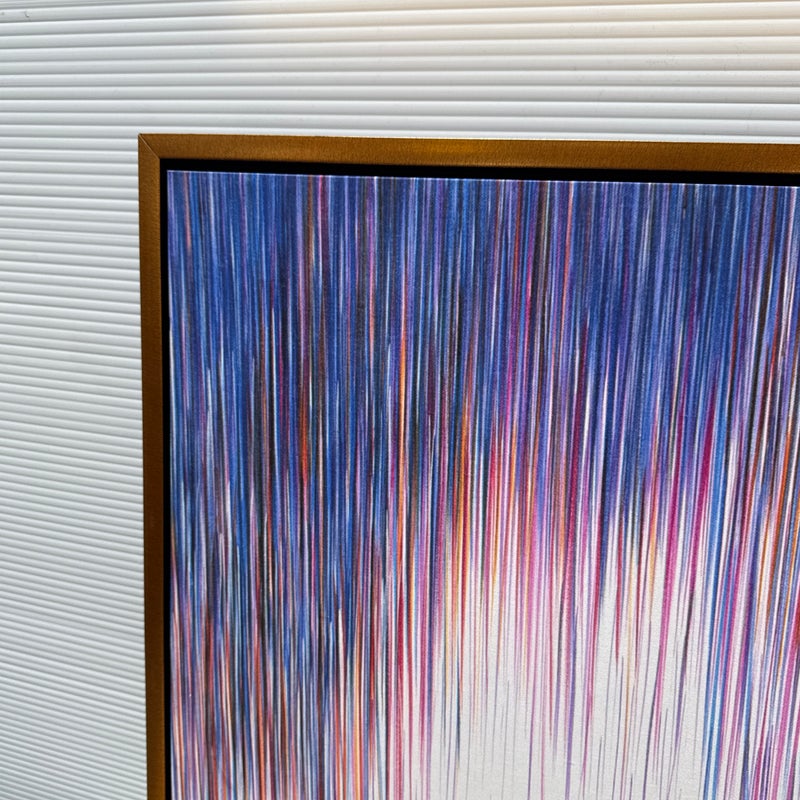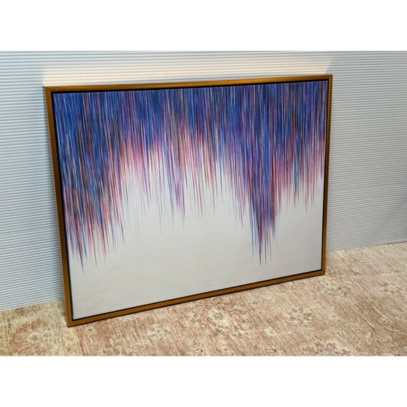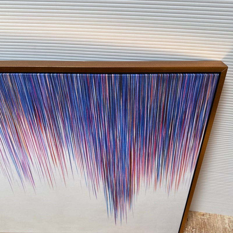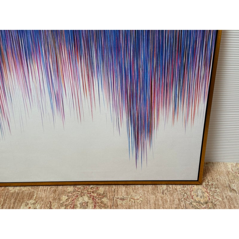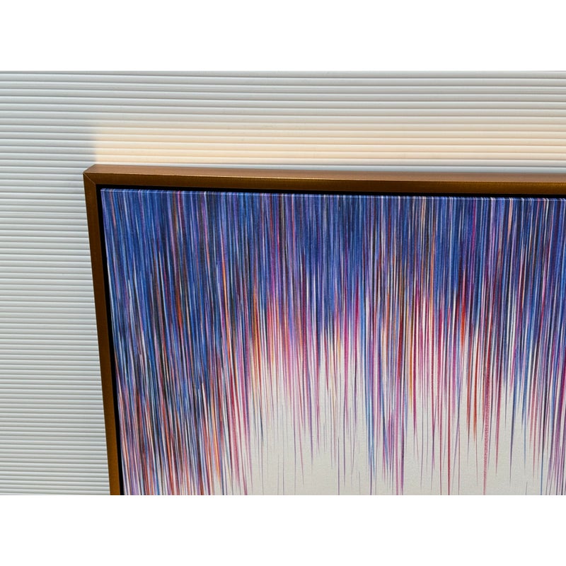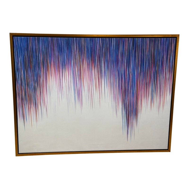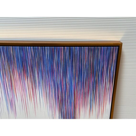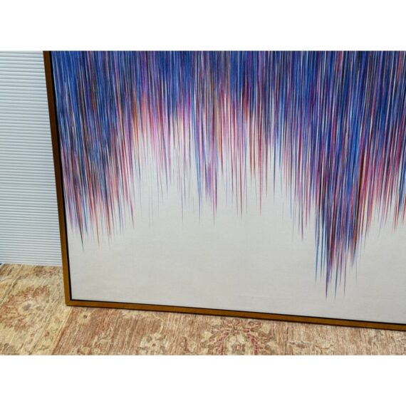Design Plus Gallery presents a “A Line Is a Line” by Cinta Garcia. The compelling print is on stretched canvas floating in a walnut tone frame. The artwork has striation of colors; such as purple, red, and blues spiking downward in a technological fashion. Overall, the artwork work is in good condition, minimal wear from usage.
