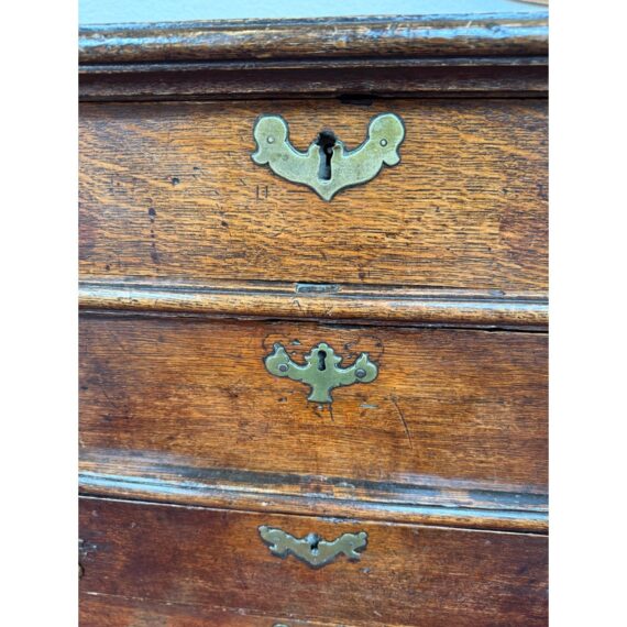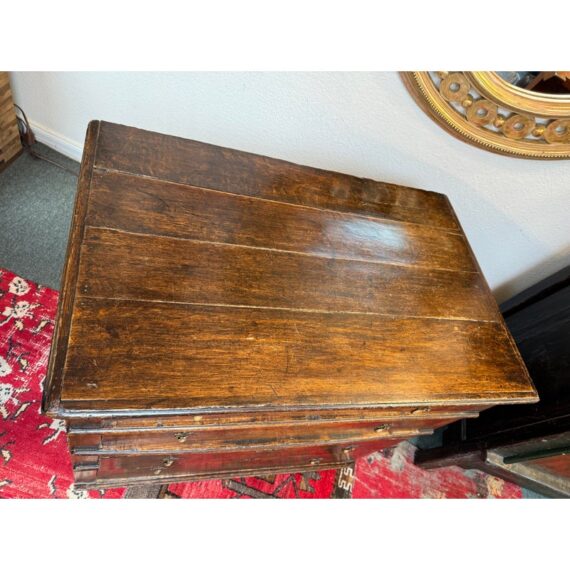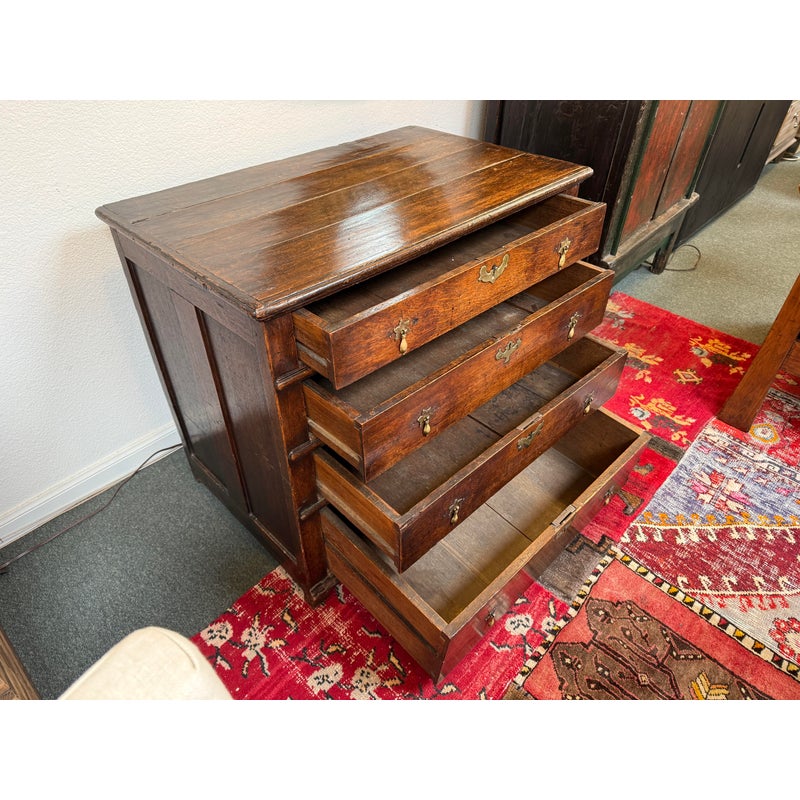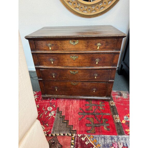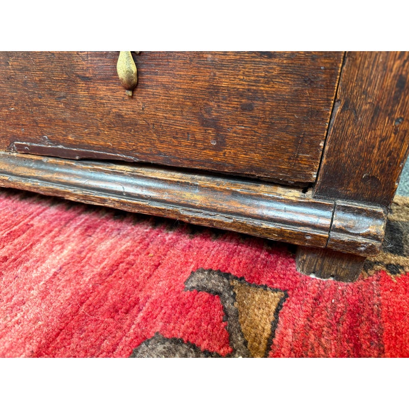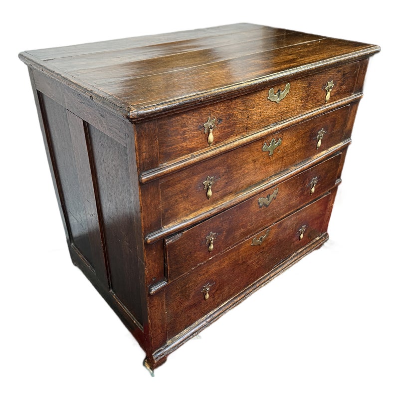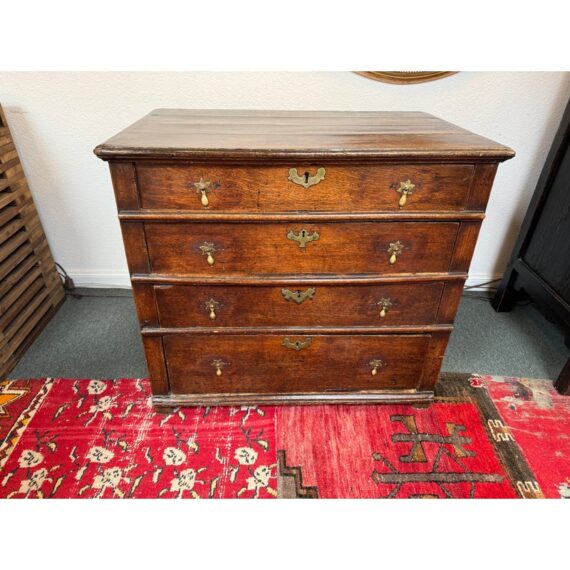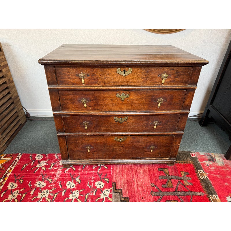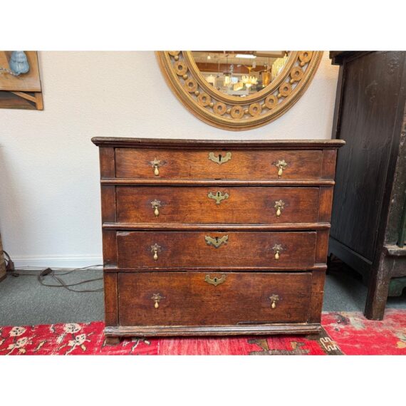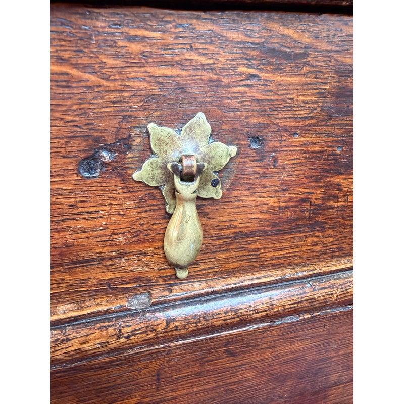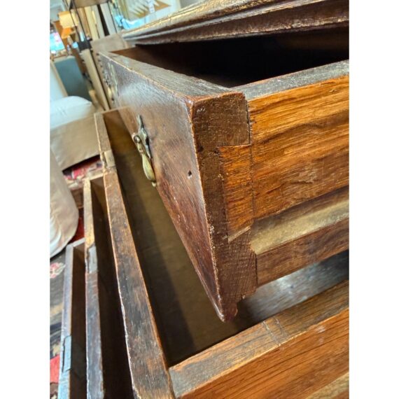 Design Plus Gallery presents a True Relic, a Chest of Drawers from the 17th Century. The chest has four graduated depth drawers, is raised on block feet and gilt metal handles that were added in the 18h century. The drawers all have dovetailed joinery with paneled sides and back. For its centuries old age, the chest is in functioning good condition and some areas that could be restored, if needed.