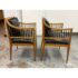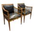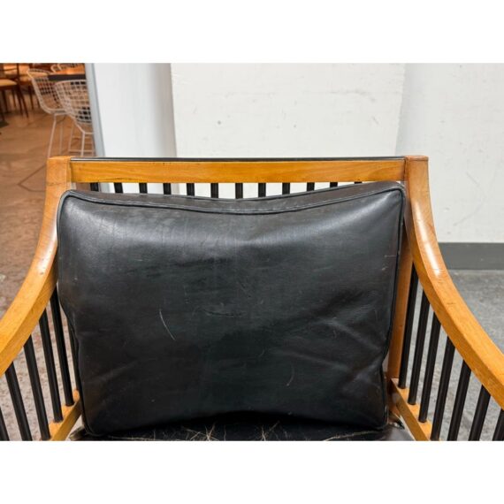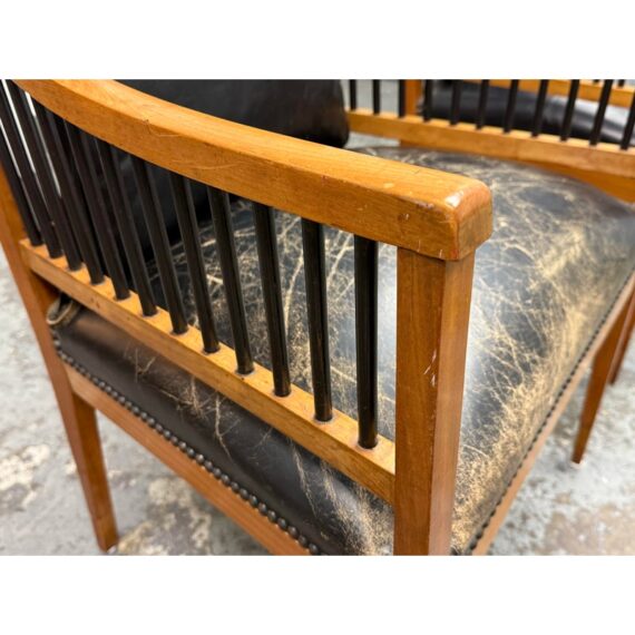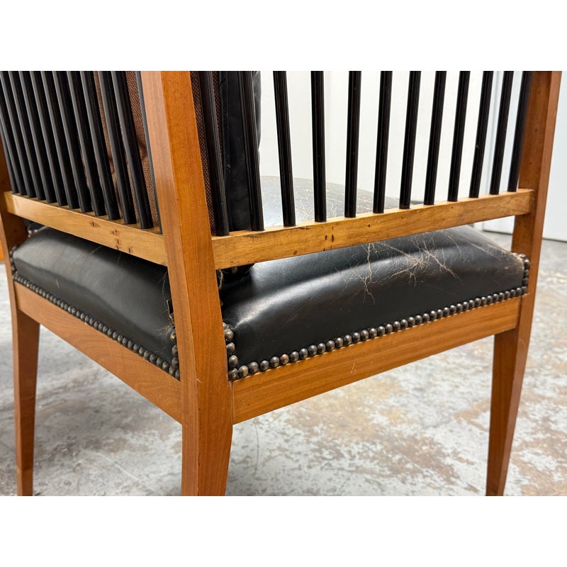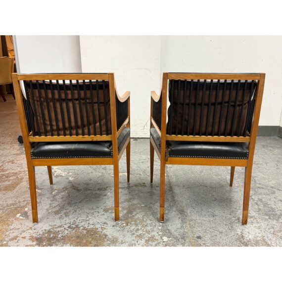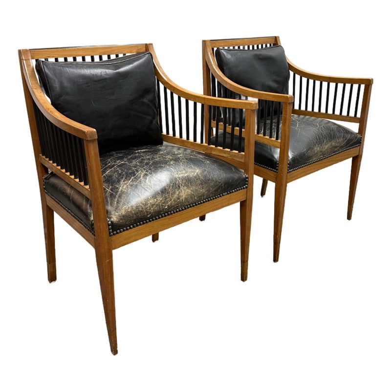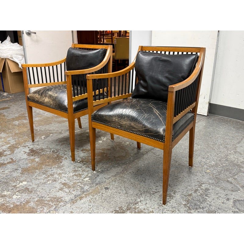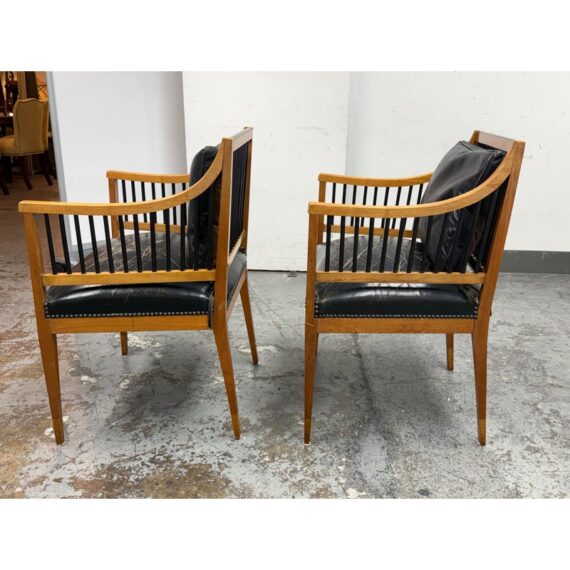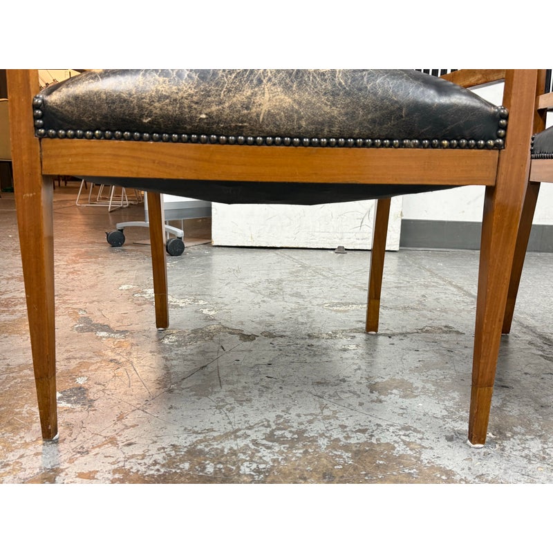 Design Plus Gallery presents a Pair of Circa 1835 Austrian Biedermeier Cherry Wood + Leather Arm Chairs. The chairs structural frame is made from cherry wood and has shaped arms and legs accented by ebonized rods along the sides, back, and top stiles for a dramatic contrast. The strong period construction speaks to their enduring quality, while the streamlined silhouette reflects a design sensibility well ahead of its time. The seats are upholstered their original black leather with decorative nailhead trim along the borders. The leather shows visible, natural distress consistent. A rare find for a pair of these chairs as they offer timeless design, exceptional materials, and nearly two centuries of history. They are in good antique condition, visible and minimal wear. Made in Austria.
