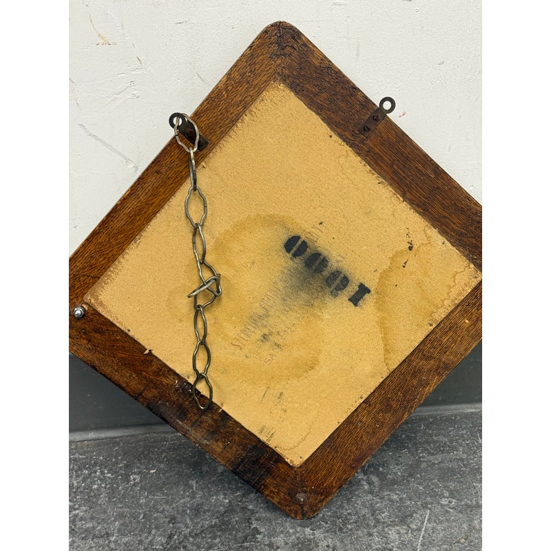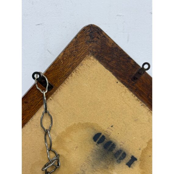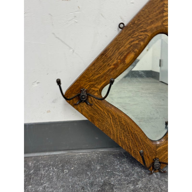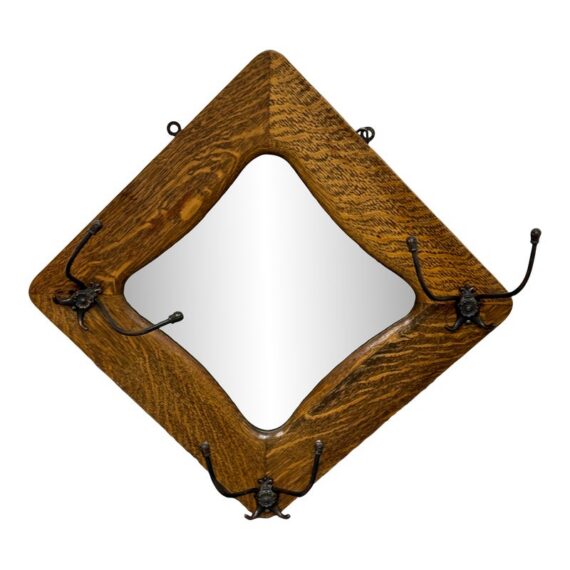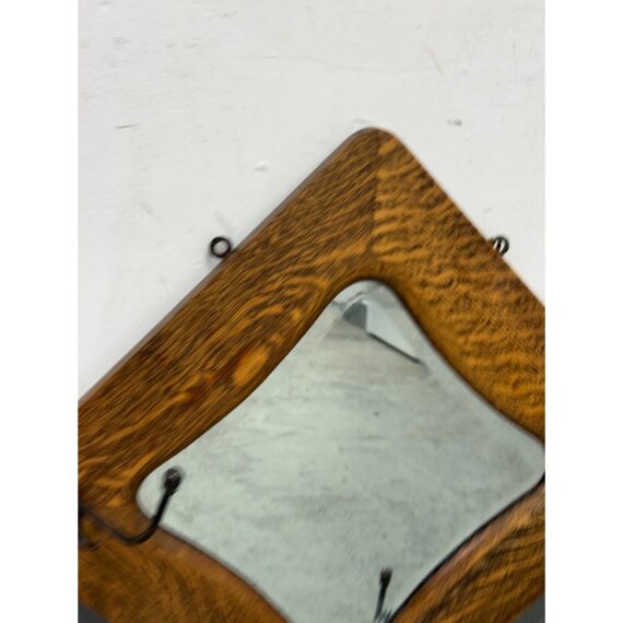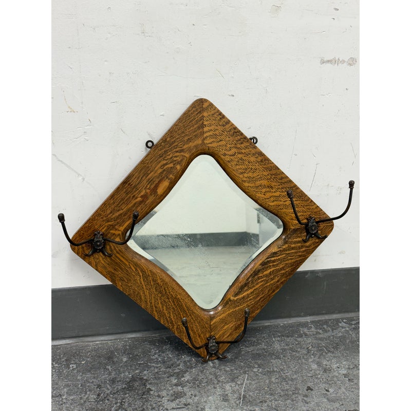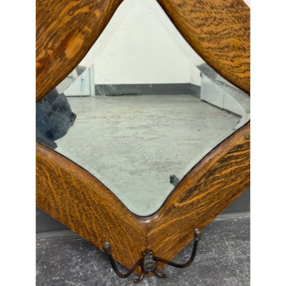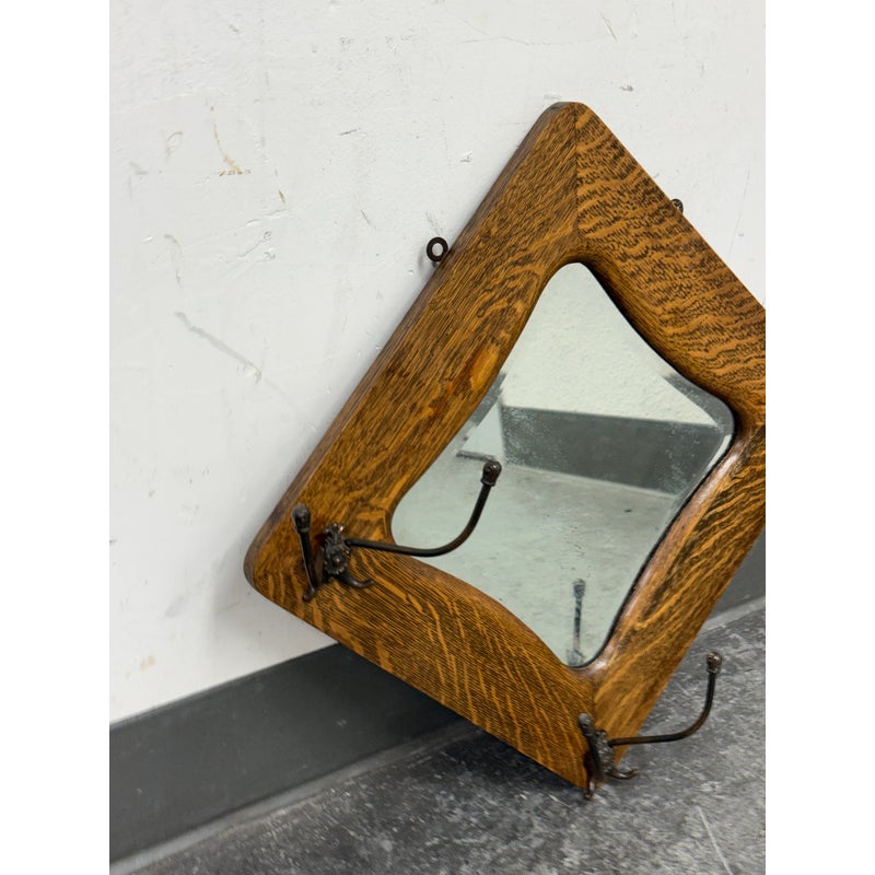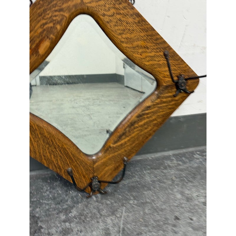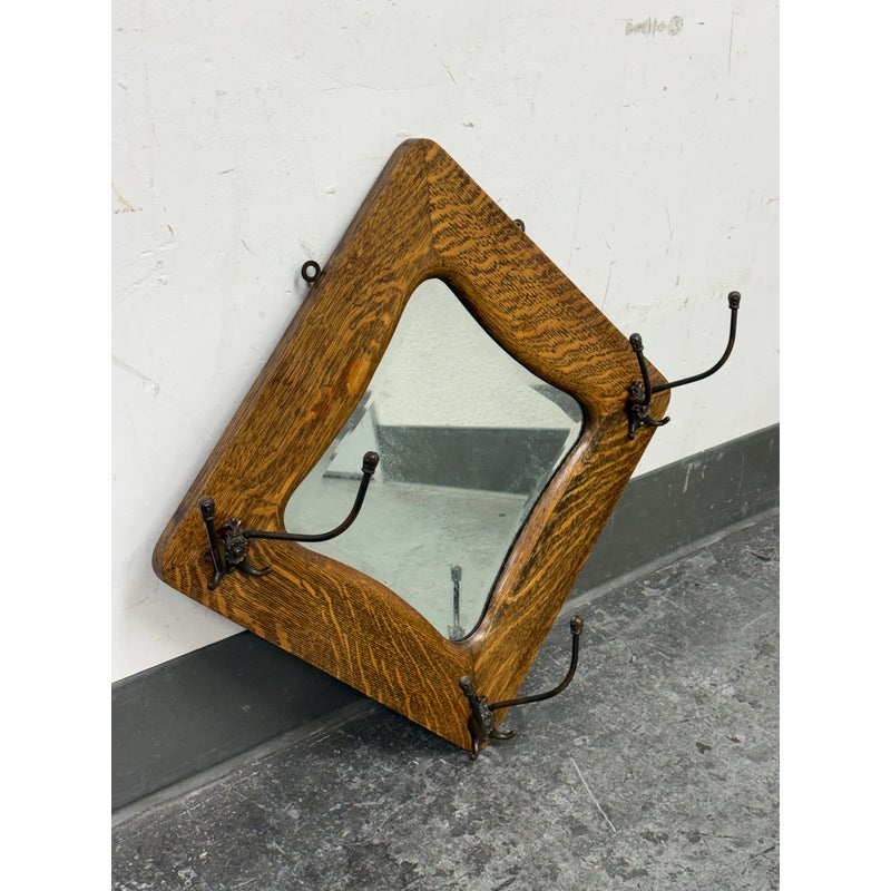 Design Plus Gallery presents a Tiger Oak Wood Wall Mirror with Hanging Hooks.This piece combines a beveled mirror set within an angular oak frame. Surrounding the mirror are original metal hooks making it both functional and decorative. The wood displays pronounced grain patterns consistent with period construction, while the hardware adds character and utility. This wall-mounted piece offers practical storage paired with vintage appeal. In good condition, visible and minimal wear from usage.