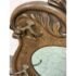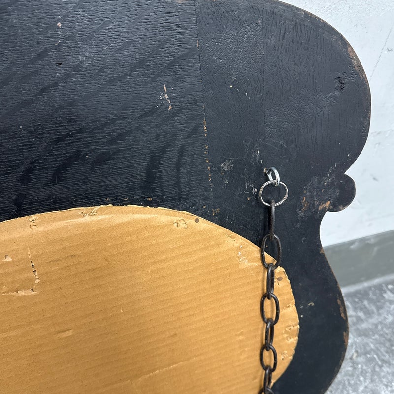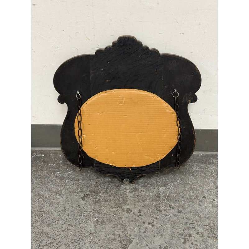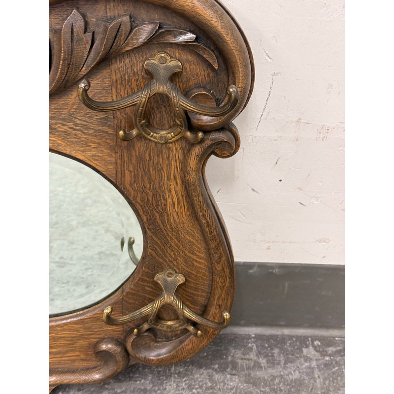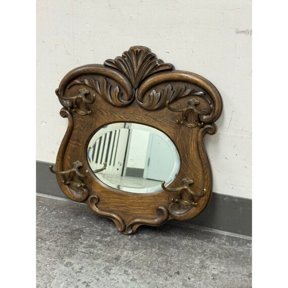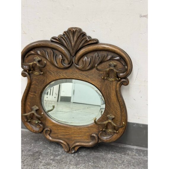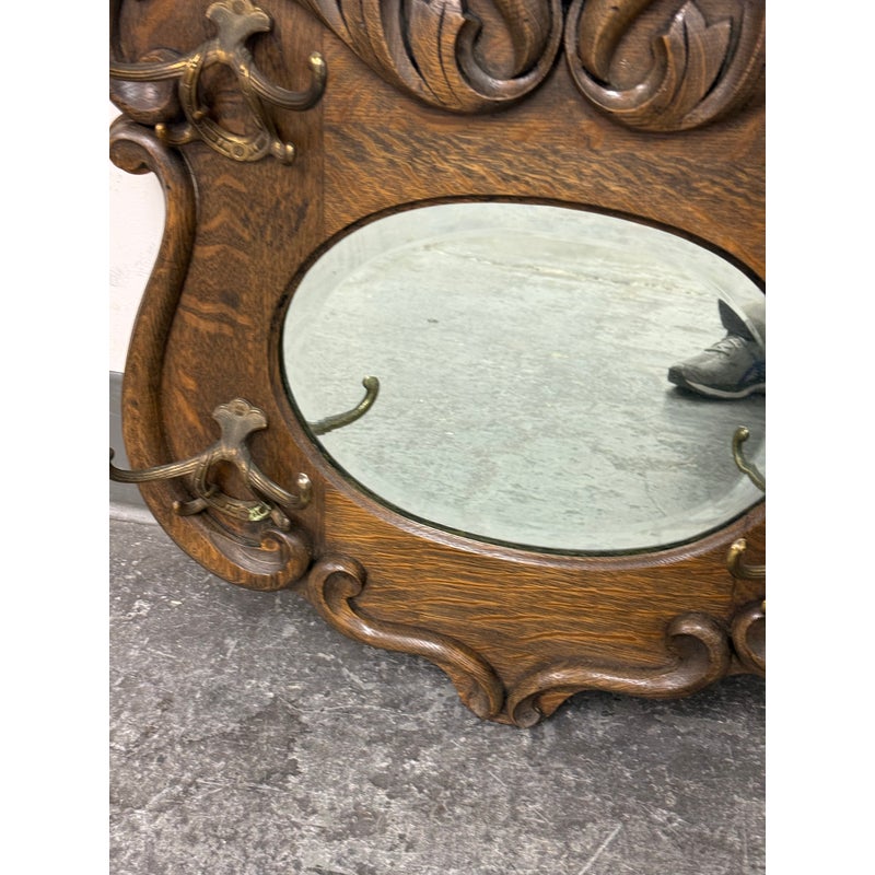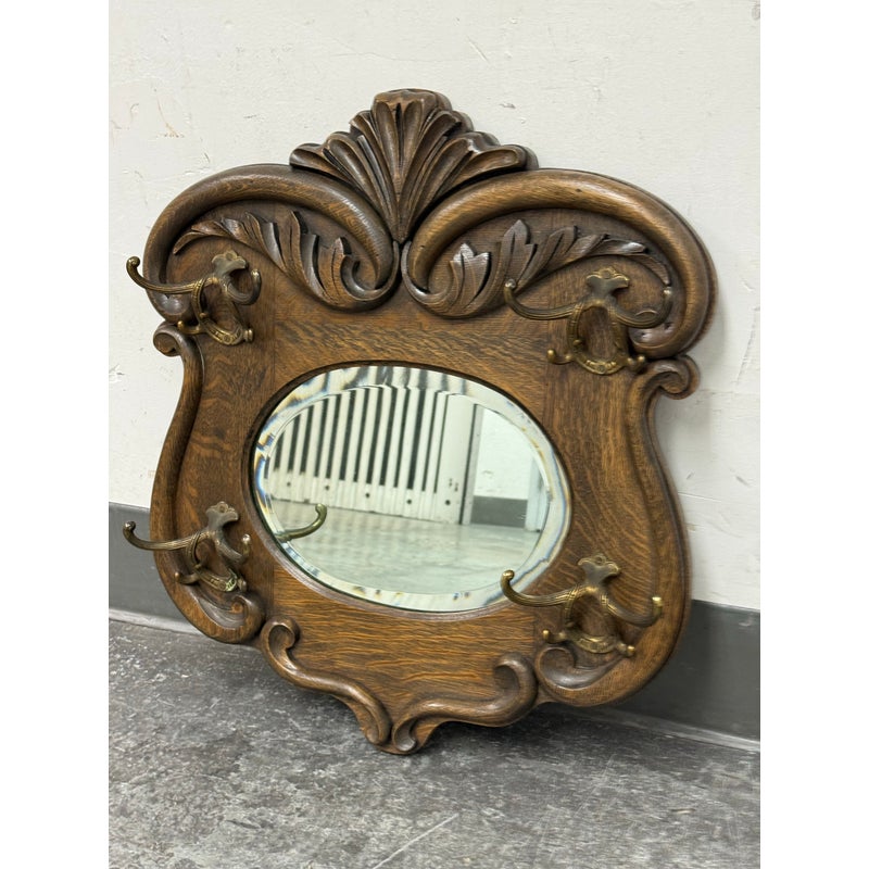 Design Plus Gallery presents a Tiger Oak Wood Wall Mirror with Hanging Hooks from the Early 20th Century. The highly carved and decorated frame displays layered scrollwork and botanical motifs. An oval mirror plate sits at the center to offer contrast against the natural oak tones and detailed relief. Ideal for entryways, powder rooms, or as a decorative wall accent, this mirror brings period character and visual interest to a variety of interiors. In good condition, visible and minimal wear from usage.