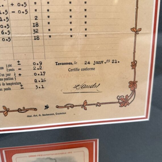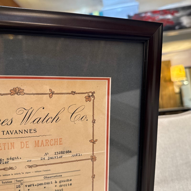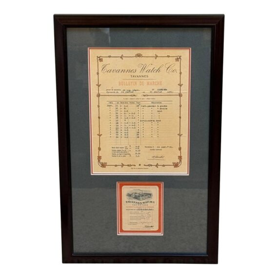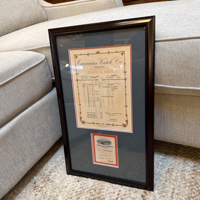 Design Plus Gallery presents a Circa 1921 Framed Tavannes Watch Co. A Bulletin de Marche Certificate. Custom matted and framed. In good condition, minimal wear from usage.
