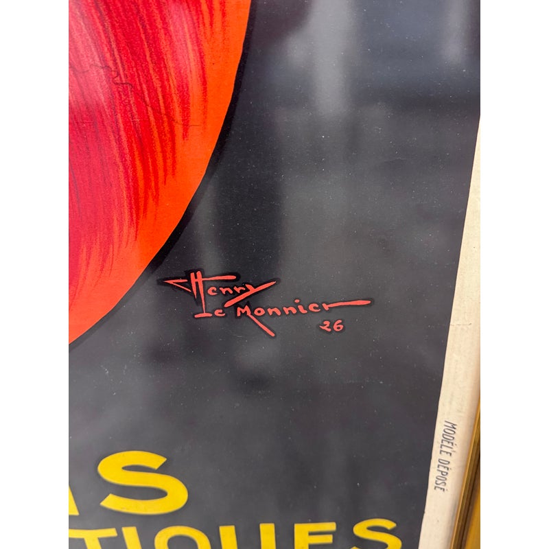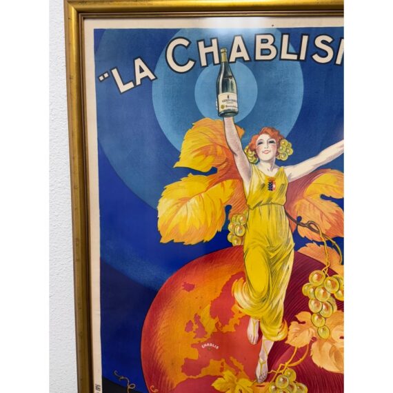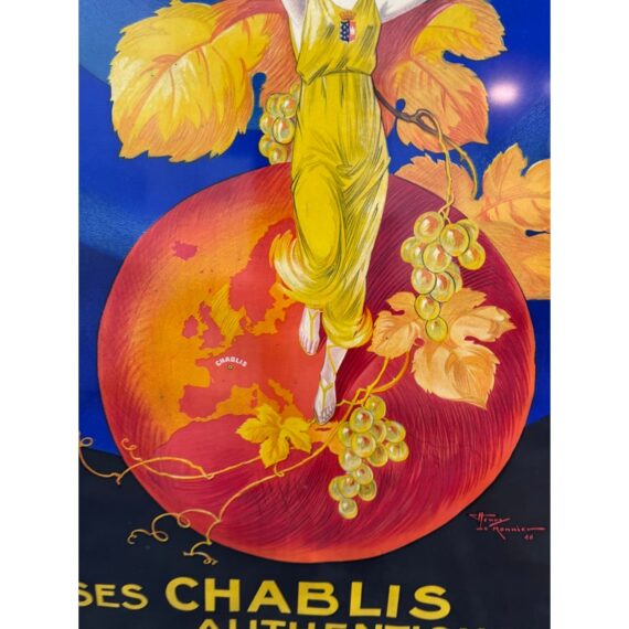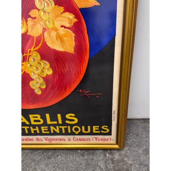 Design Plus Gallery presents an Original Stone Lithograph created in 1926 by Henry le Monnier. The lithograph was made to promote Chablis wines in France. It is often said that a talented poster artist can tell so much of a story in a single image. Here, le Monnier shows the viewer that fine Chablis wines are enjoyed around the globe. He conveys his message with rich details and bold graphics. The colors of this poster work so well together. Henry Le Monnier (1893-1978) created a small body of work in the field of advertising posters. Most of his designs were created from the 1920s – late 1930s and are colorful, spirited, and somewhat humorous. Le Monnier has a fine artistic hand and many of his posters are quite valuable in today’s market. It is in good overall condition with minimal visible wear for its usage.