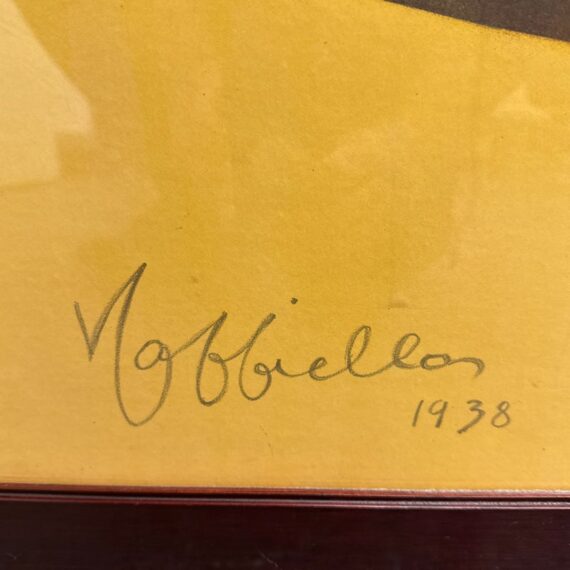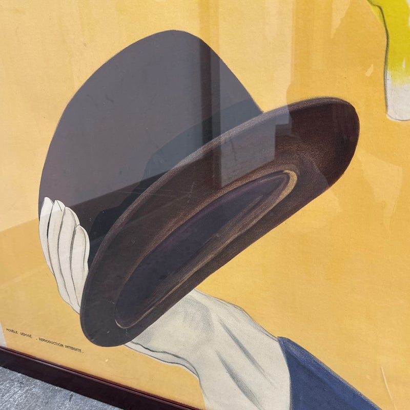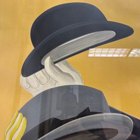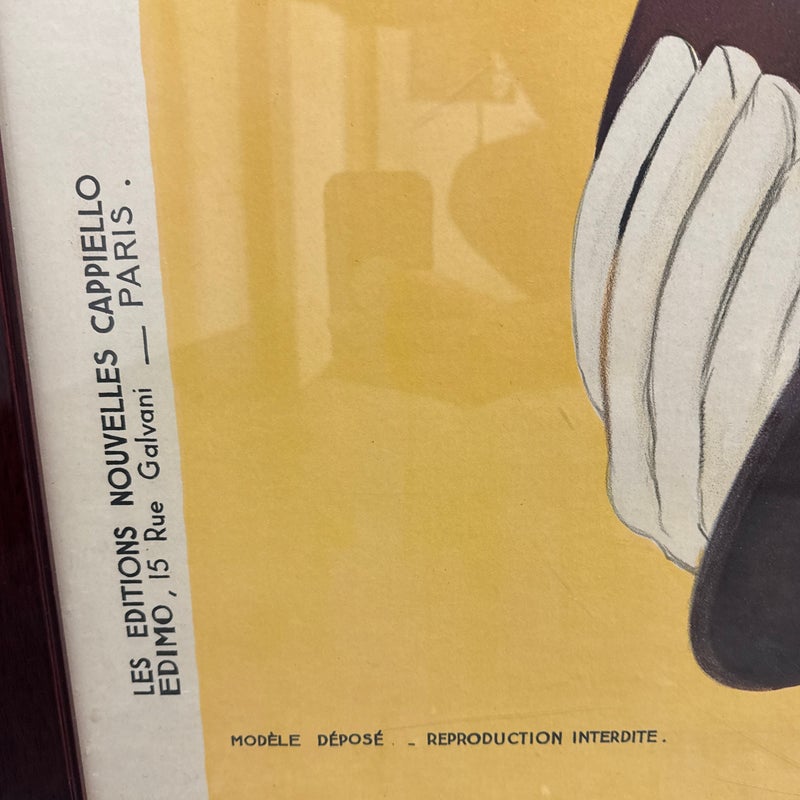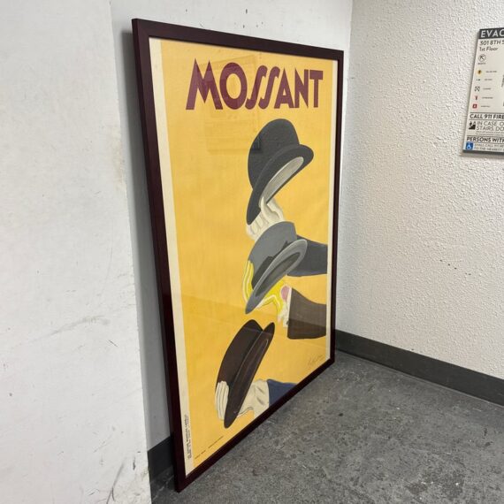 Design Plus Gallery presents a Circa 1938 Leonetto Cappiello (1875-1942) Lithograph Poster. Titled: Mossant. features a Gentleman dresser of hats and Gloves. Custom framed in a mahogany finish + plexiglass glass. Cappiello created nearly a thousand poster designs from 1899 to this final image of 1938. The poster has visible and minor wear from usage.
