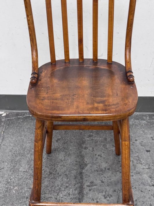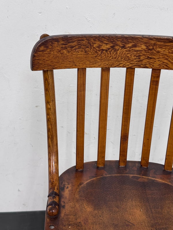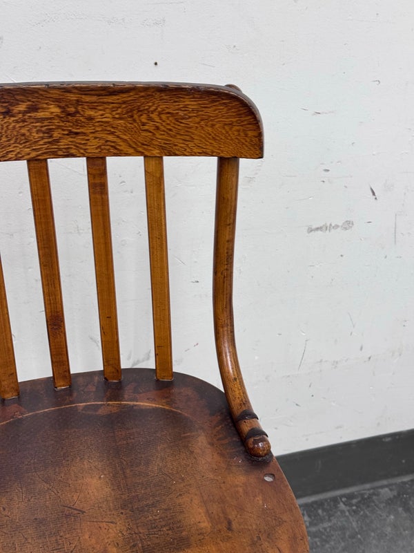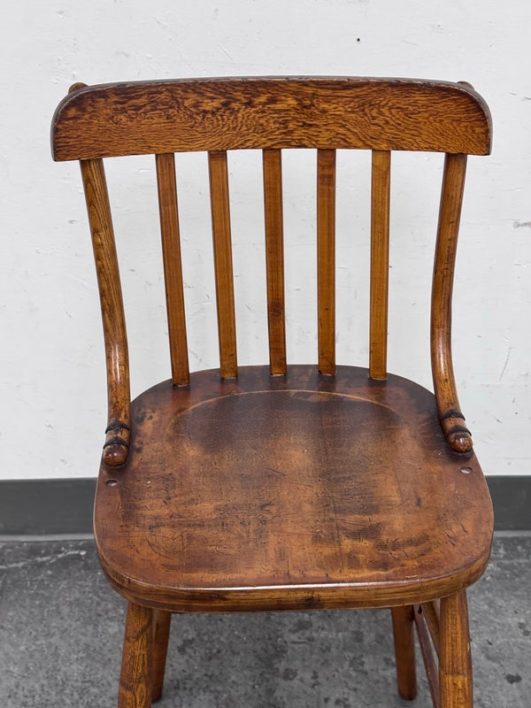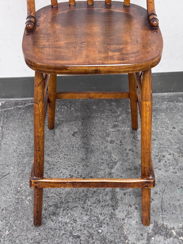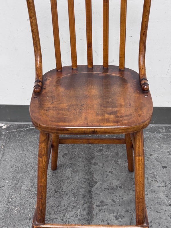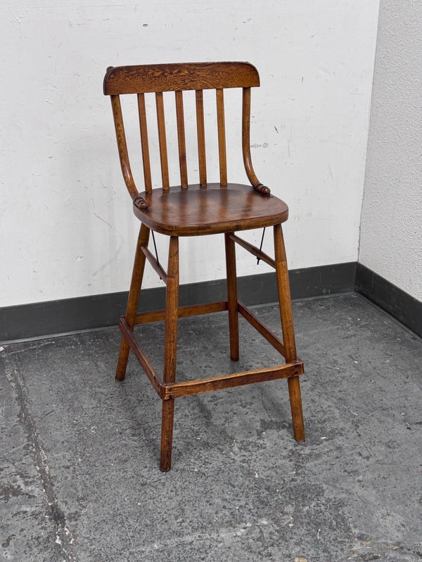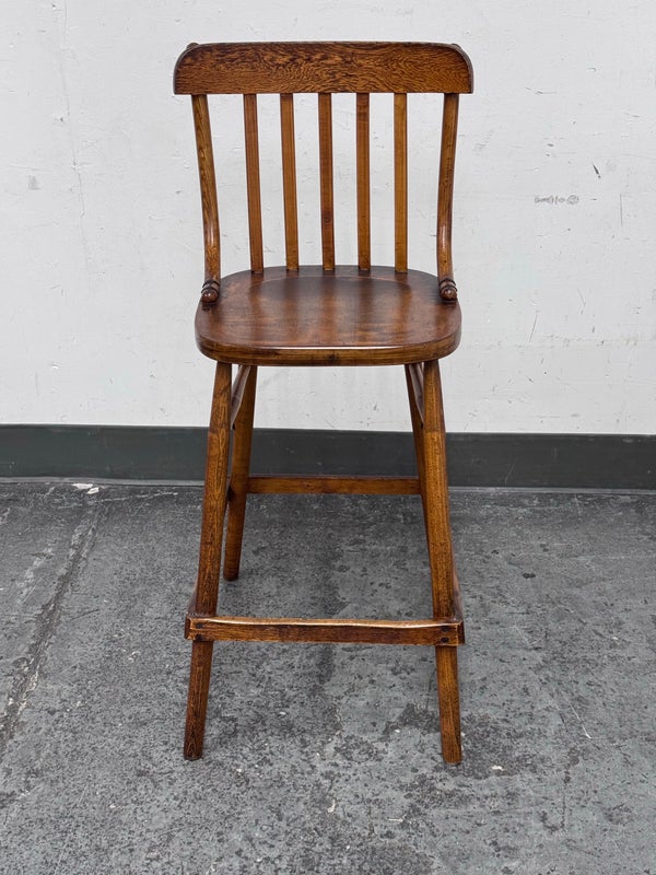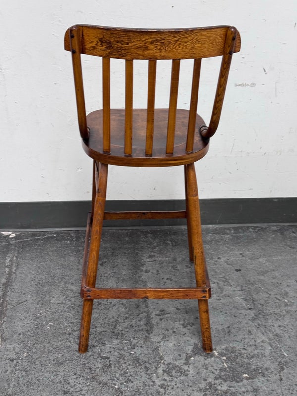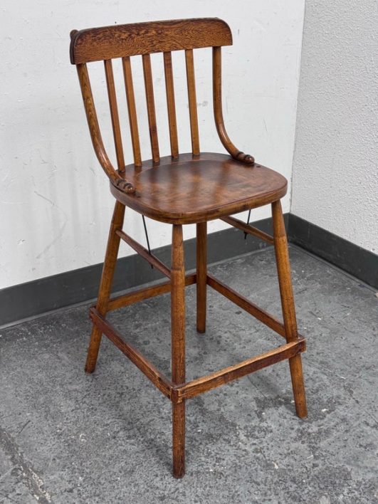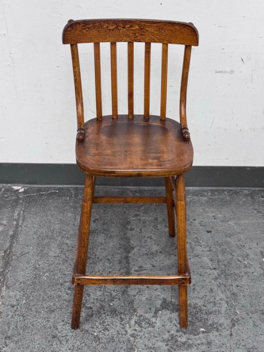 Design Plus Gallery presents a Tiger Oak Wood Children’s High Chair from 1941, DeFrehn & Sons. The company was very well known for their design and manufacturing of chairs from the Late 19th Century and in the mid 20th they partnered with National Store Fixture Company to bring their products to any and all households in America. The high-chair is meant for a child to dine at the table. Is in good condition with visible surface wear that is consistent with it vintage usage.