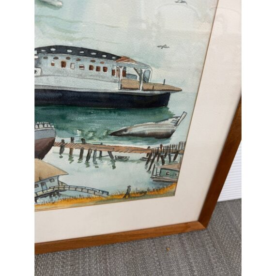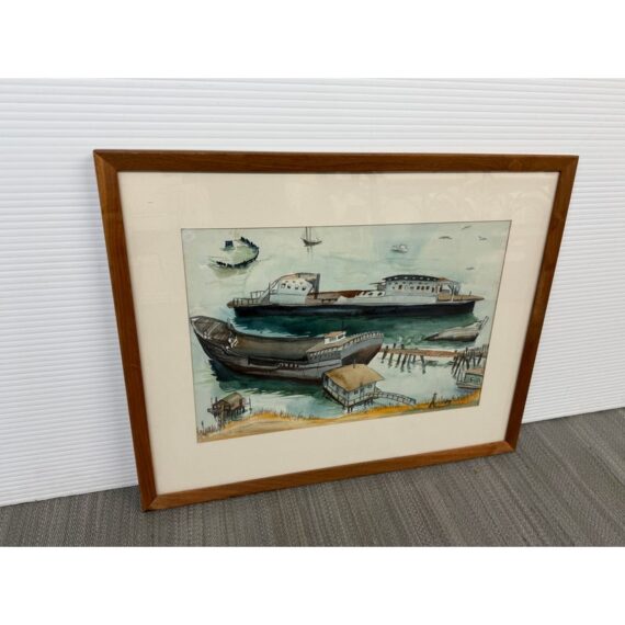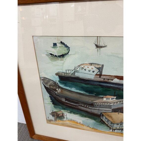 Design Plus Gallery presents “Sausalito” an original Watercolor Painting by the Artist in 1941. Elsie Lower Pomeroy (1882–1971) was an artist most closely associated with the American Scene Painting movement and specifically California Regionalism or California Scene Painting. Known for her landscapes this one has a pair of boats rocking in the tide. A older make of boat is contrasted with a more contemporary ferry boat, both regular sightings in Sausalito. The watercolor scene is professionally matted, framed in simple wood and protected by glass. Light surface wear; condition is good.