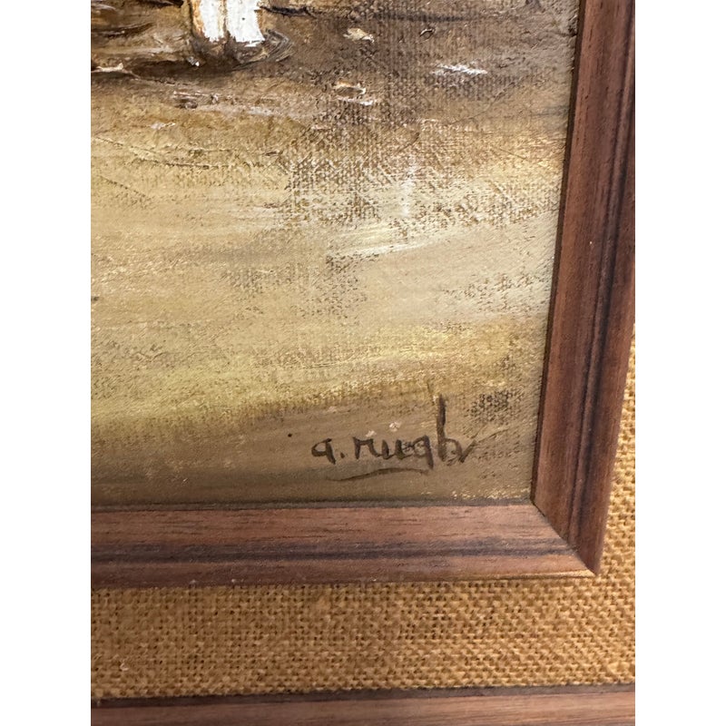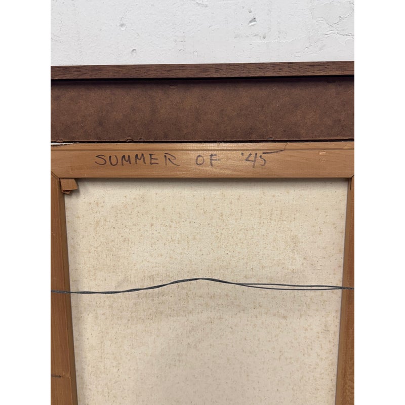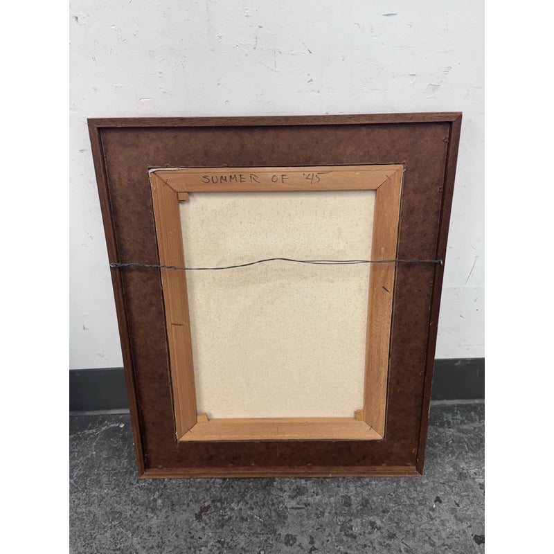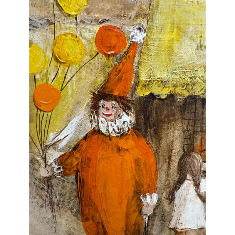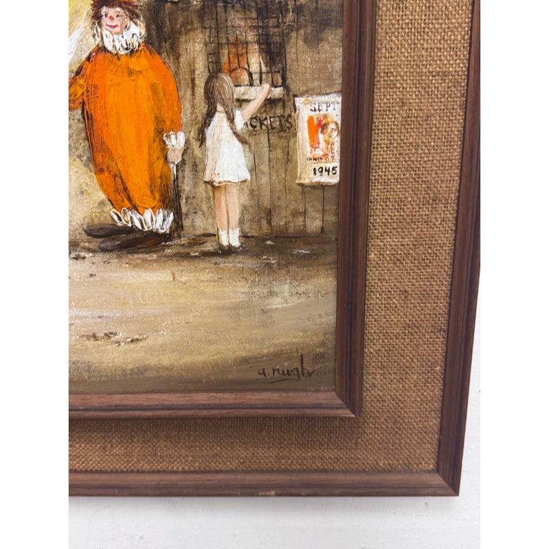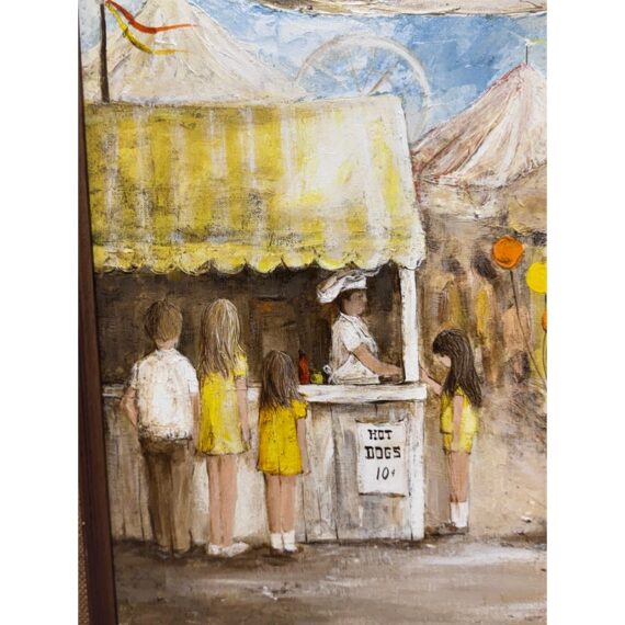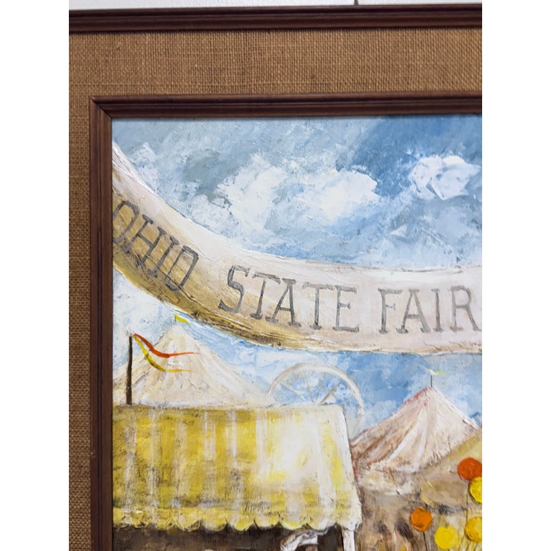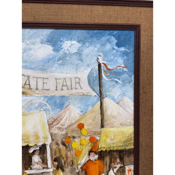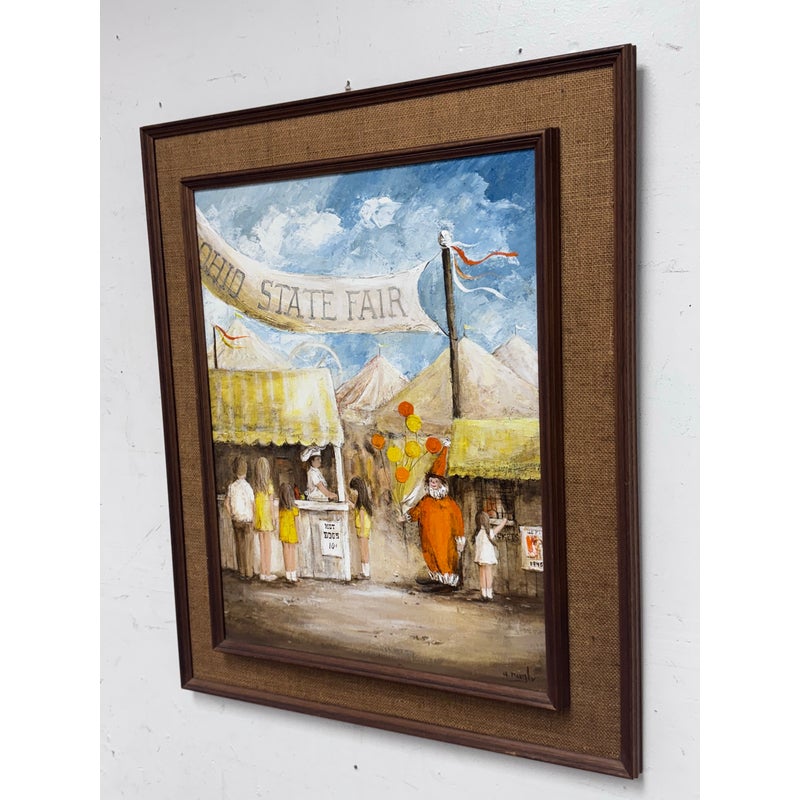 Design Plus Gallery presents a Circa 1945 Titled “Ohio State Fair” Framed A. Rugh. The artwork depicts a scene at a state fair, with a banner reading “OHIO STATE FAIR” visible in the background. The painting shows a line of people, including children, waiting at a booth, while a clown in an orange outfit holds balloons nearby. In good condition, minimal wear. Artist signature on bottom right.