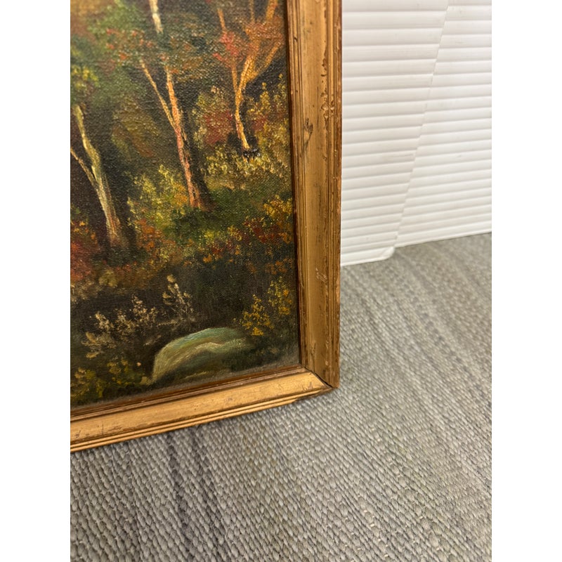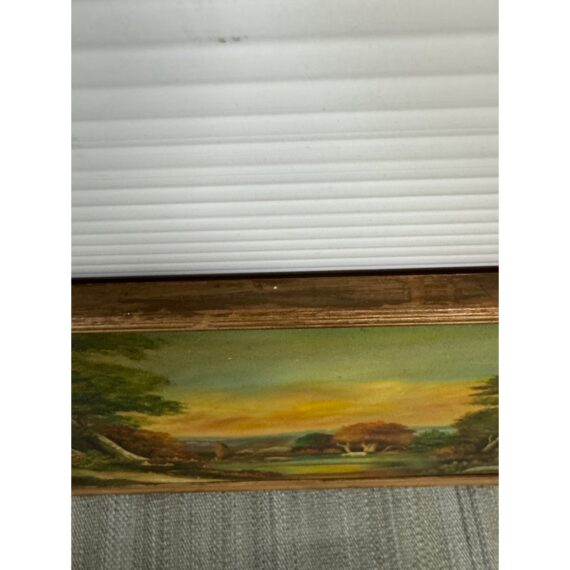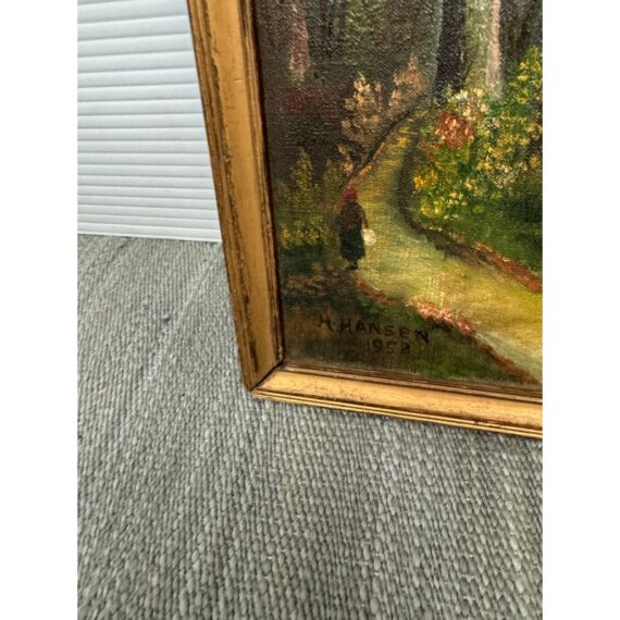 Design Plus Gallery presents “Picnic in Meadow” an Original Painting from Artist H. Hansen. The artist’s signature can be found on the lower left, certifying its authenticity. Set in a lush meadow surrounded by towering trees, the composition has a winding path on the left side, where a single figure is seen carrying basket. Along the trail, two figures are comfortably seated on the grass, enjoying their picnic amidst the towering wild grasses and gentle sunlight. The open meadow has the presence of livestock grazing and roaming freely. Hansen’s use of rich oil paints brings the scene to life, with a warm palette of greens, yellows, oranges, and earthy browns. The brushwork captures both the delicate sway of the grasses and the dappled sunlight filtering through the trees. Elegantly framed, this painting offers a window into the tranquil pleasures of rural life in the 1950s, making it a delightful addition for collectors of vintage artwork or those who appreciate mid-century pastoral scenes. In good condition, visible and minimal wear.