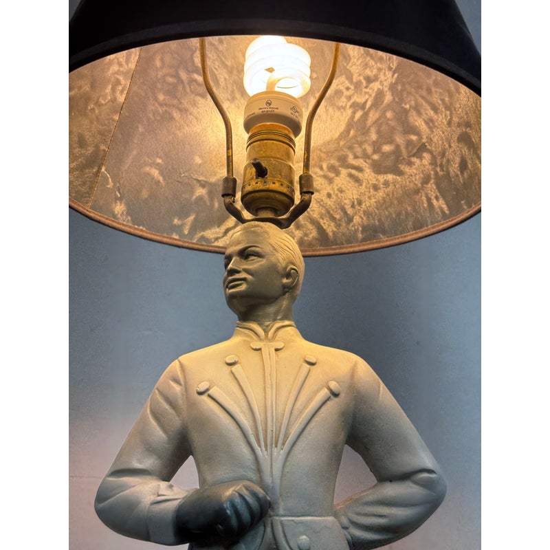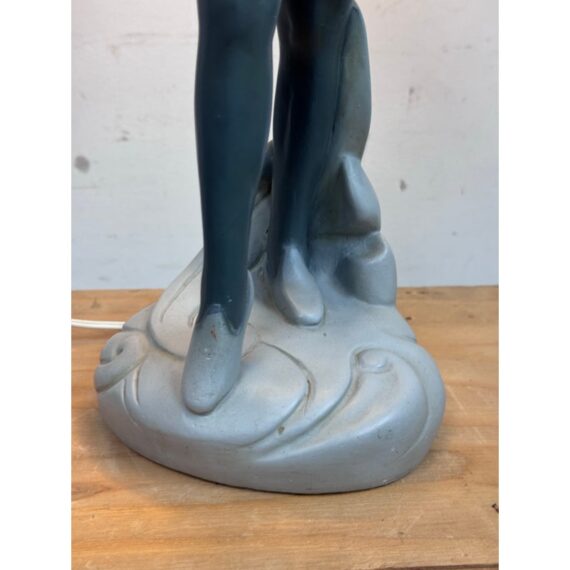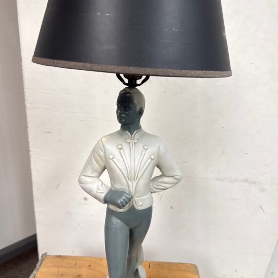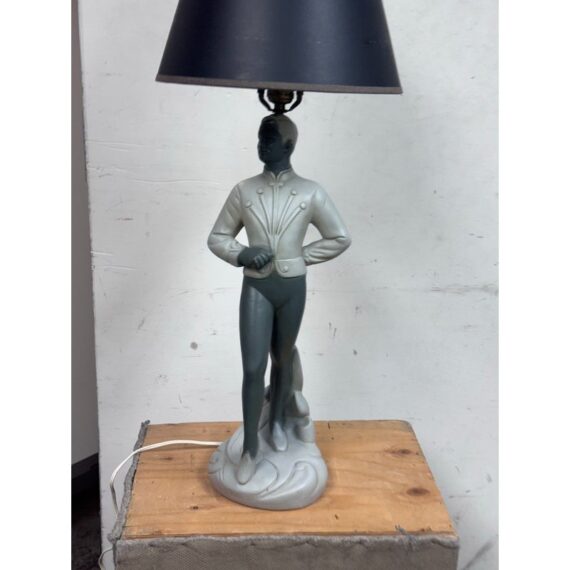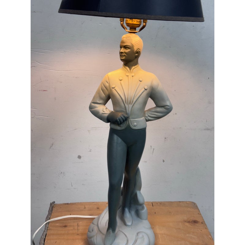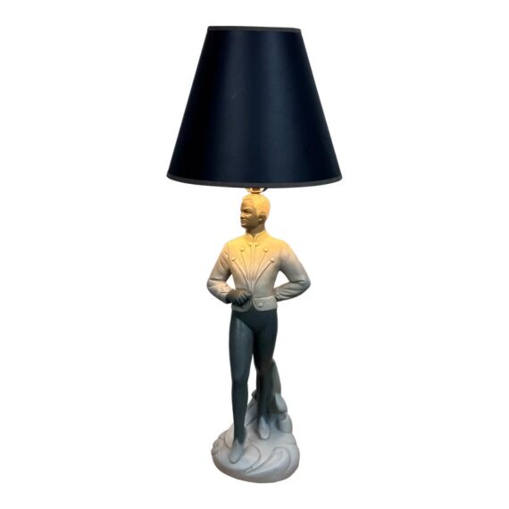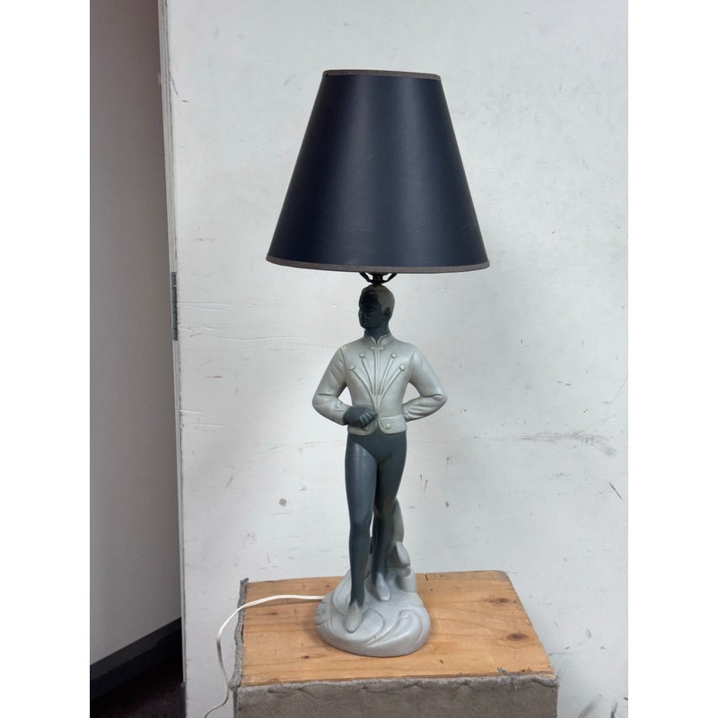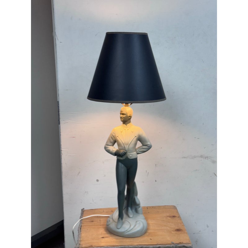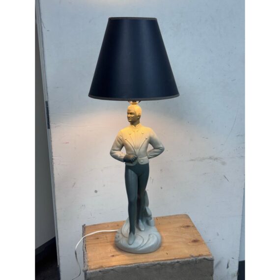 Design Plus Gallery presents a Circa 1960’s Chalkware Table Lamp manufactured by Brest Mfg. Co. of Chicago. The male ballet dance lamp is part of a pair, often referred to as a “pas de deux” set, with the other lamp featuring a female dancer. This is a single lamp. In good condition, visible and minimal wear from usage.