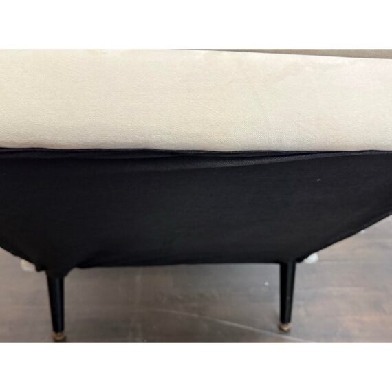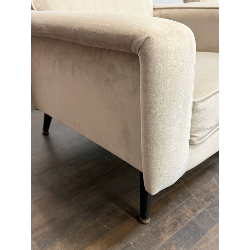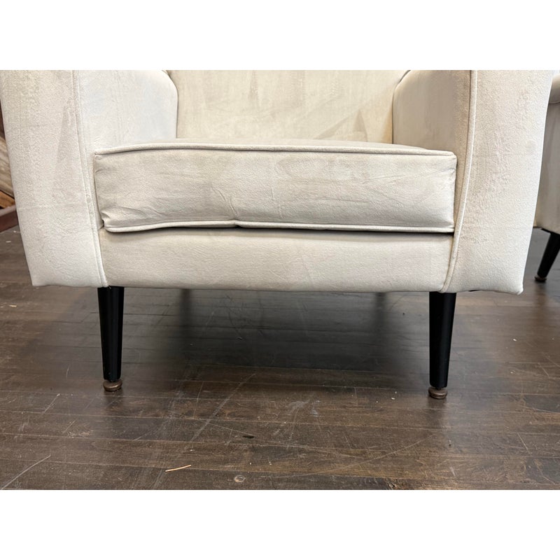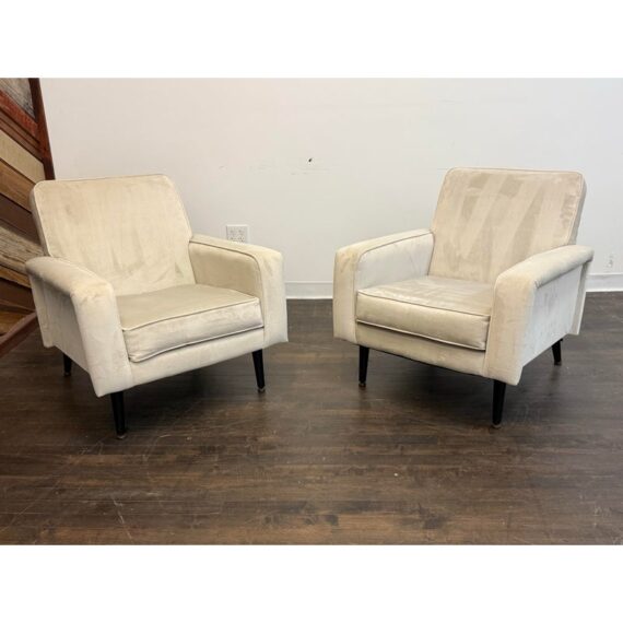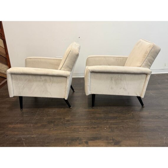 Design Plus Gallery presents a Pair of Circa 1960’s Lounge Arm Chairs. A pair of French lounge armchairs, showcasing a clean, architectural silhouette. Upholstered in an ivory/ light gray velvet with visible yet minimal wear consistent with age and use, they feature gently slanted backs, loose seat cushions, and a squared frame that balances comfort with structure. Finished with black stained tapered legs, these chairs offer a timeless mid-century aesthetic well suited for both classic and modern interiors. In good vintage condition, visible and minimal wear from usage. Made in France.