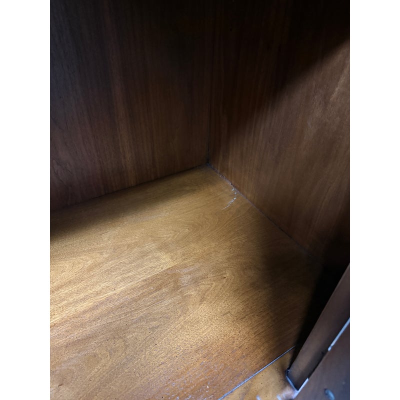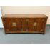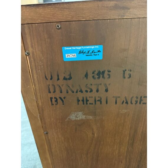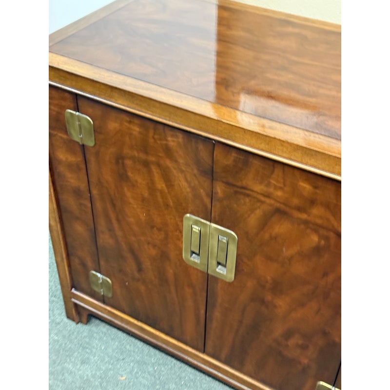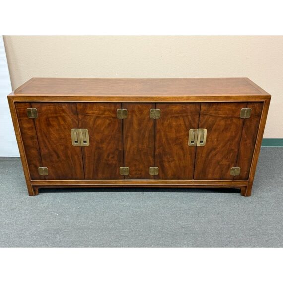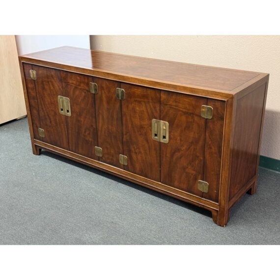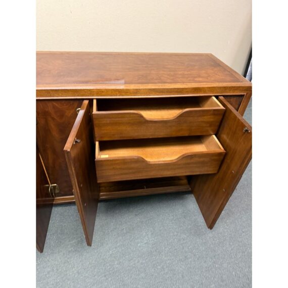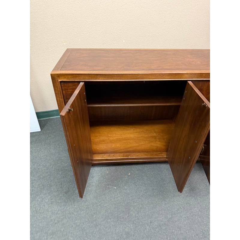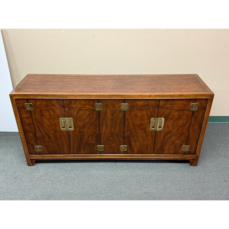 Design Plus Gallery presents a Vintage Dynasty Sideboard by Drexel Heritage. This gorgeous Chnoiserie style cabinet is part of the Dynasty Collection, circa 1960’s. Model 013-136. A beautifully designed piece with inlaid walnut burl, beveled case trim and recessed brass hardware. Opens to two drawers with integrated handles in the right and a cabinet with removable shelf to the left. Light surfacew ear; condition is good for age and use.