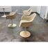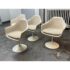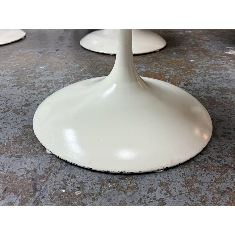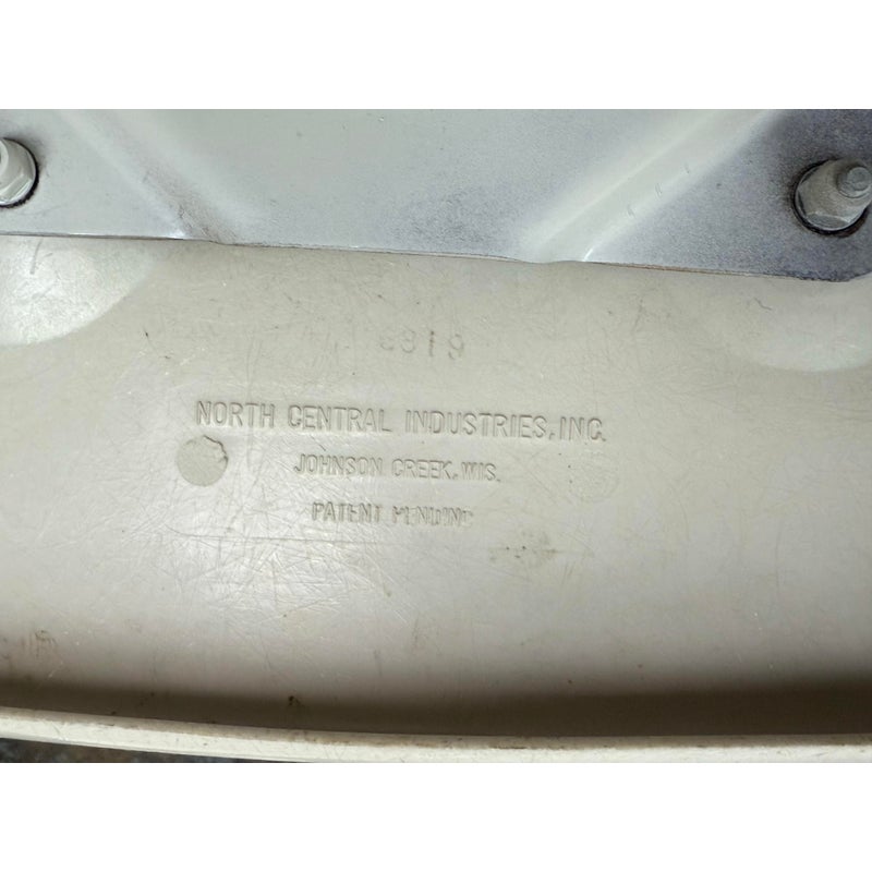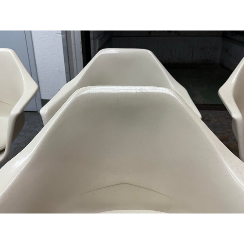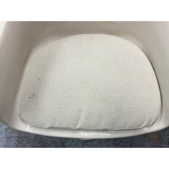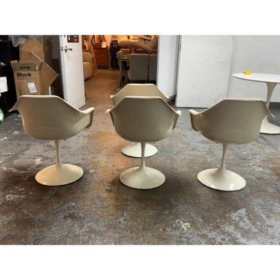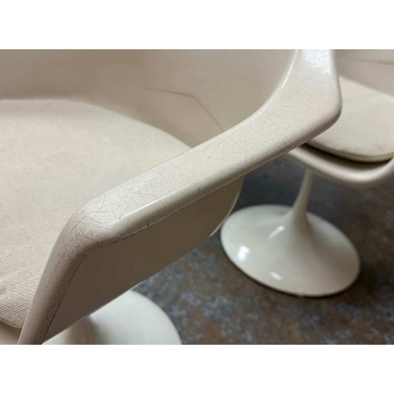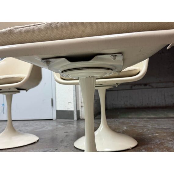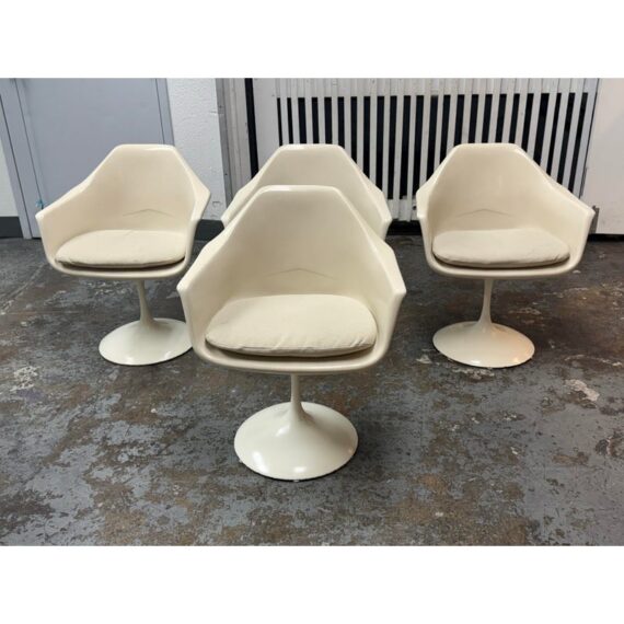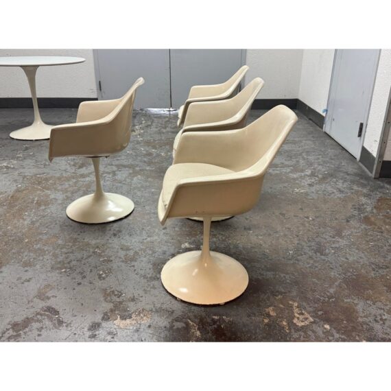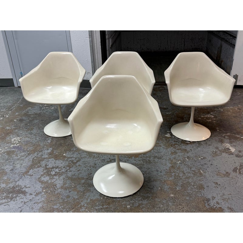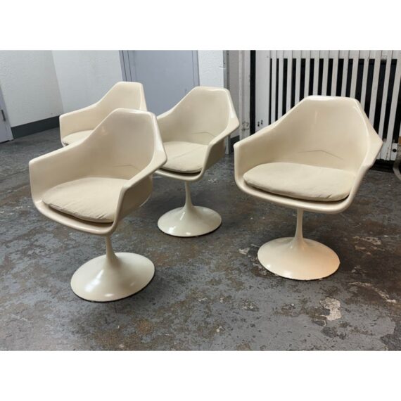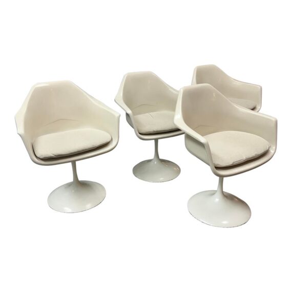 Design Plus Gallery presents a Set of 4 North Central Industries Off-White Tulip Dining Chairs in the Style of Eero Saarinen. Made in Johnson Creek, WI in the early 1960’s, this set of vintage chairs are reminiscent of Knoll, and are made of white fiberglass, featuring a swivel function. Padded seat cushions with zippers could easily be reupholstered. In good vintage condition with visible wear from age and use. Made in Wisconsin, USA.