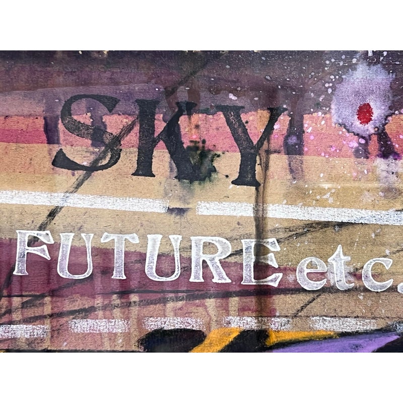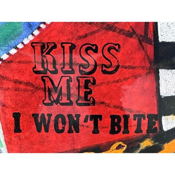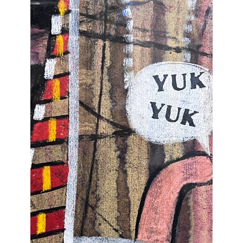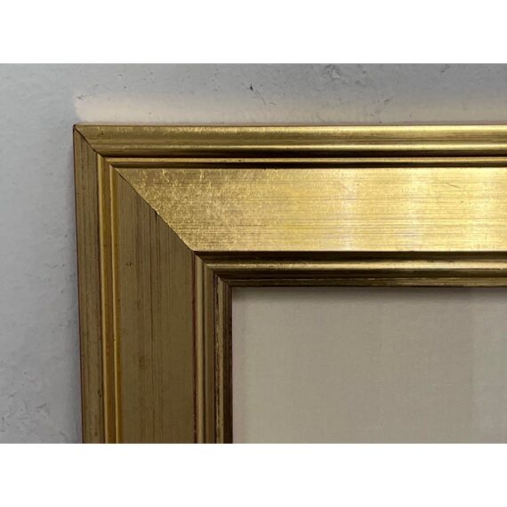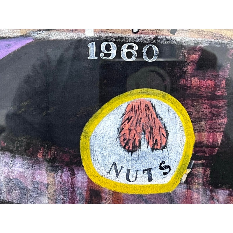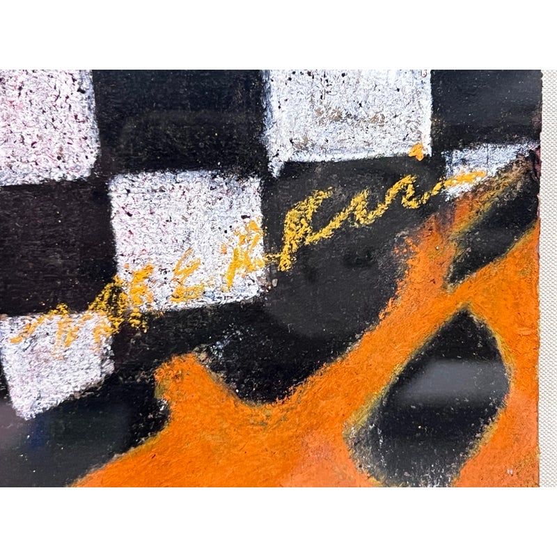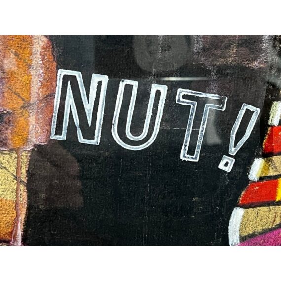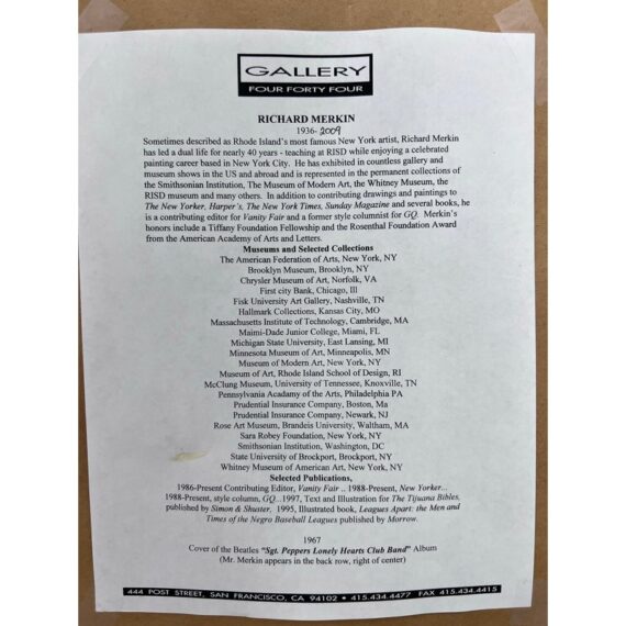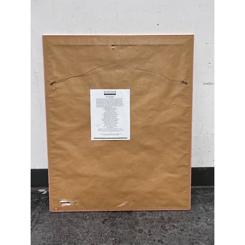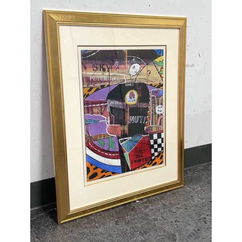 Design Plus Gallery presents “Imaginary Portrait of Michael Frimkiss” by Richard Merkin in 1965. Richard Marshall Merkin was an American painter, illustrator and arts educator. Merkin’s fascination with the 1920s and 1930s defined his art and shaped his identity as a professional dandy. This art work has to be an homage to the ceramic artist, Michael Frimkess. Frimkess was an American ceramic artist who lived in Venice, California. In the 1950s and 60s, he was a pupil of Peter Voulkos, a prominent figure in the California Clay Movement. This work of art is made with a mixture of materials with abstract imagery and texts exploding with overstimulating information. It is professional framed in gold with glass over the artwork and a thick off white matte. It is in good condition for its usage with minimal signs of wear.