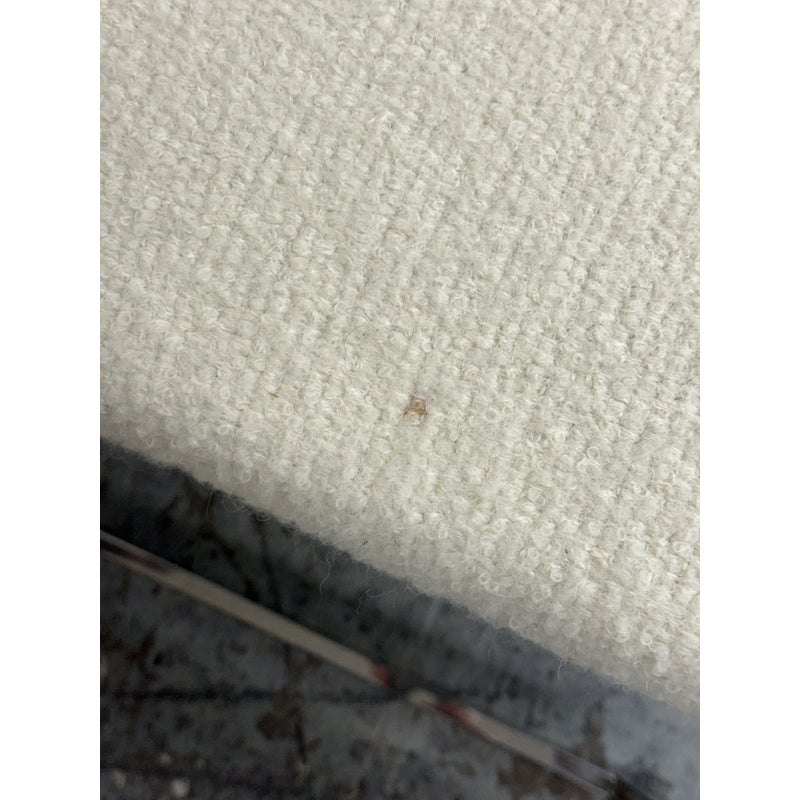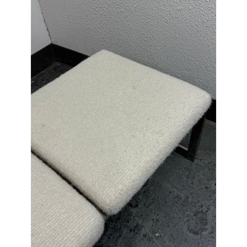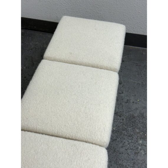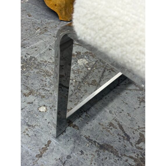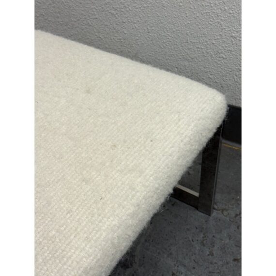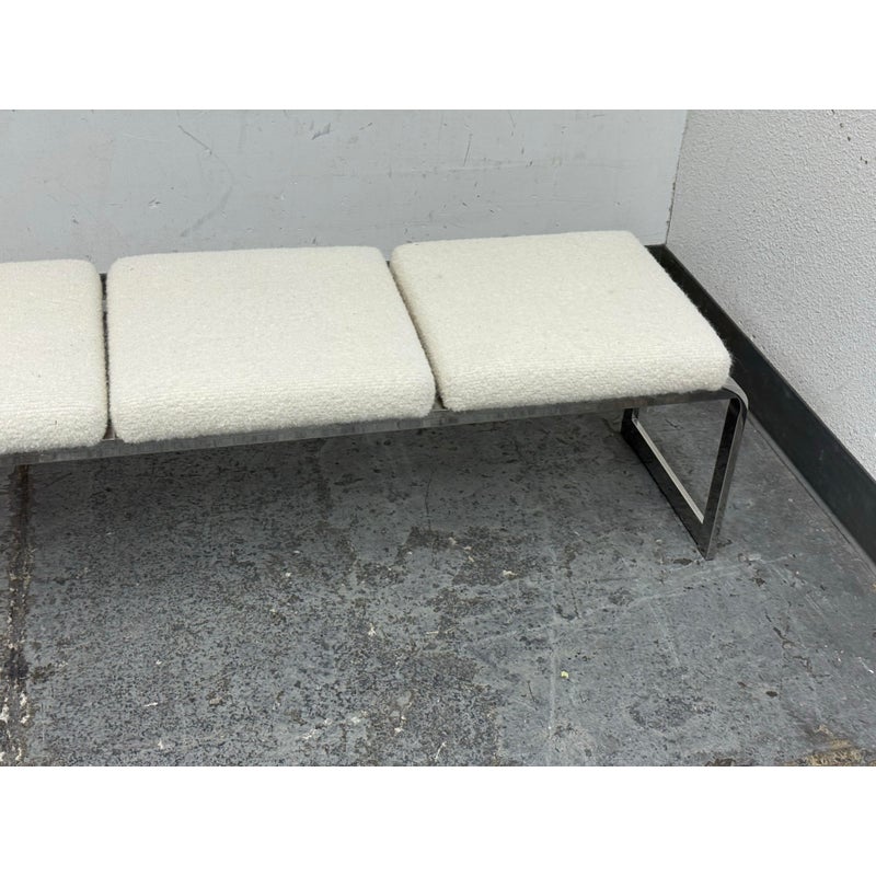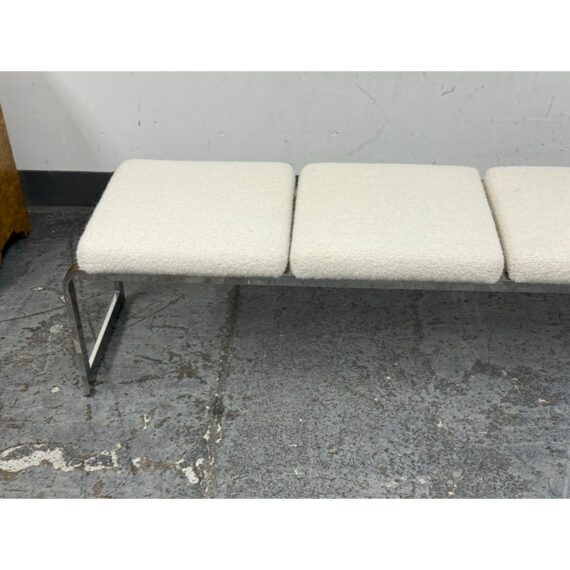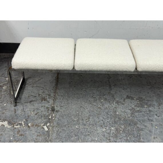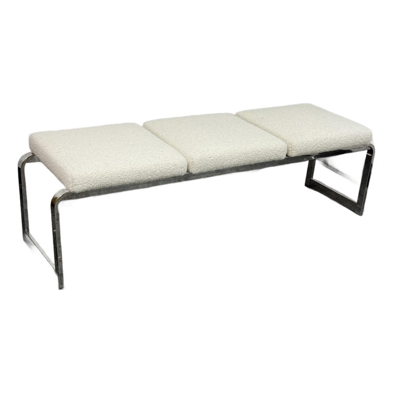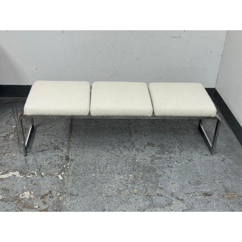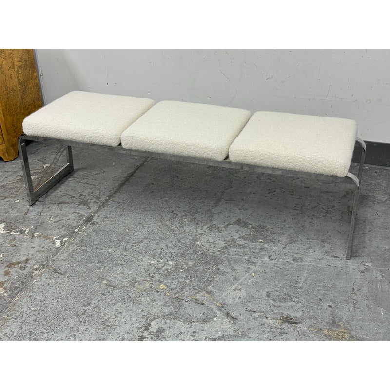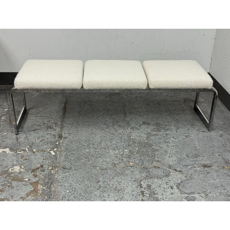 Design Plus Gallery presents a Boucle Bench from the Design Institute of America. It has been upholstered in boucle and offers three individual pads covered in that soft, cream fabric. The frame is chrome so it shines bright and the metallic element gives it a cool vibe. There is some very faint marks to the fabric but overall is in good condition for its usage.