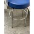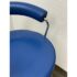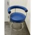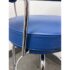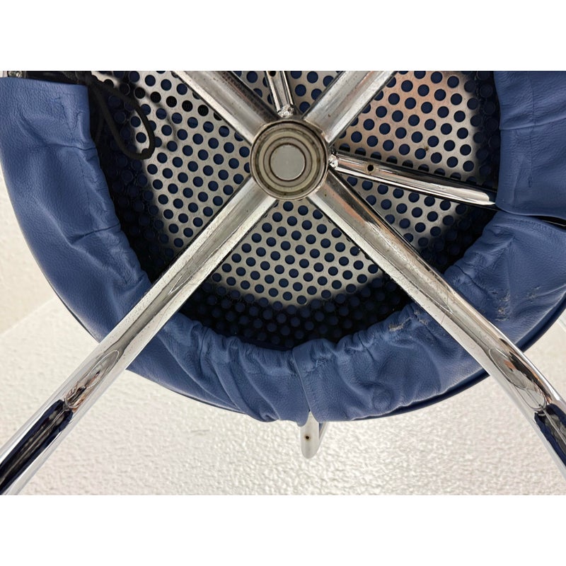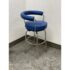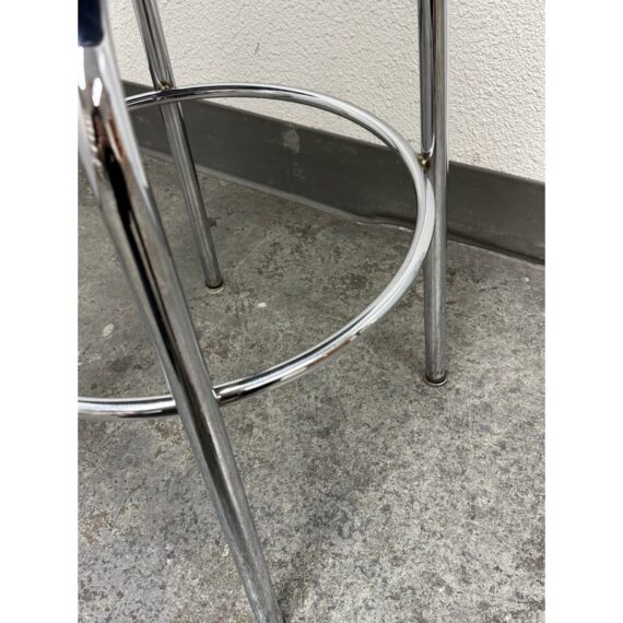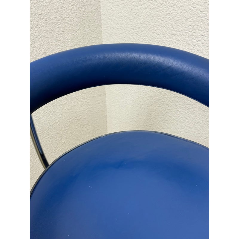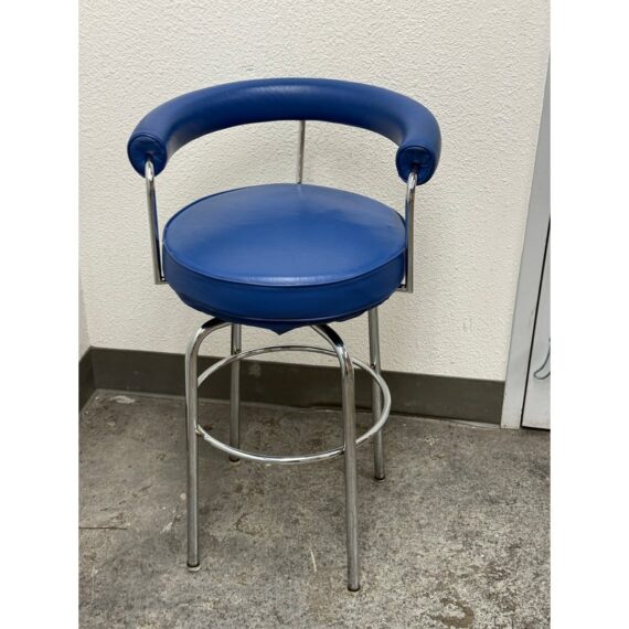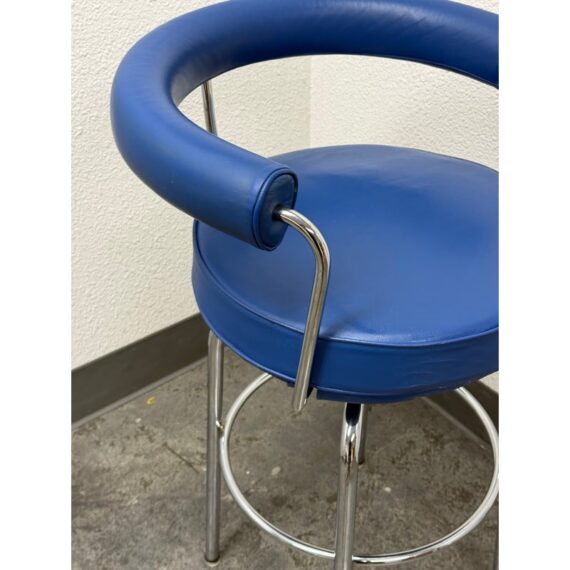 Design Plus Gallery presents a Corbu Style Leather Bar Stool. This contemporary bar stool is defined by clean curves and polished metal detailing from the 1970’s. It has a round cushioned seat and wraparound backrest that are upholstered in vibrant blue vinyl with a continuous metal frame with a chrome treatment. The stools four tubular legs are joined with a circular footrest and has an integrated swivel mechanism to allow for fluid rotation. The combination of bold color and sleek metal gives the piece a modern presence with a nod to retro styling. It is in good condition, visible patina and minimal wear from usage.