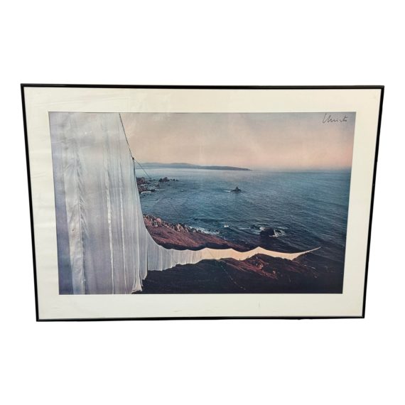 Design Plus Gallery presents “Running Fences” a print by Christo. A photographic record of the artist’s moment-in-time giant installation in West Marin. Mounted, framed and signed by the Artis. Dated 1974. Light rippling evident; condition is fair for age and use.