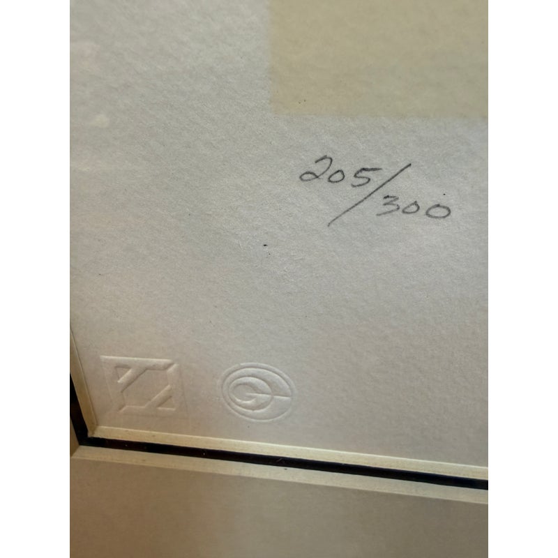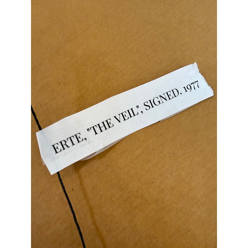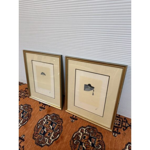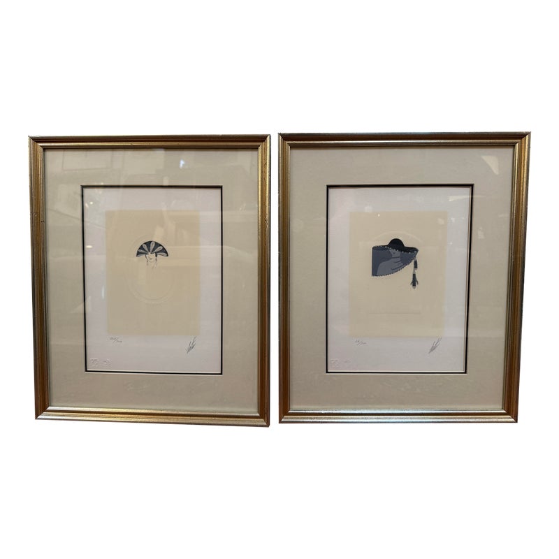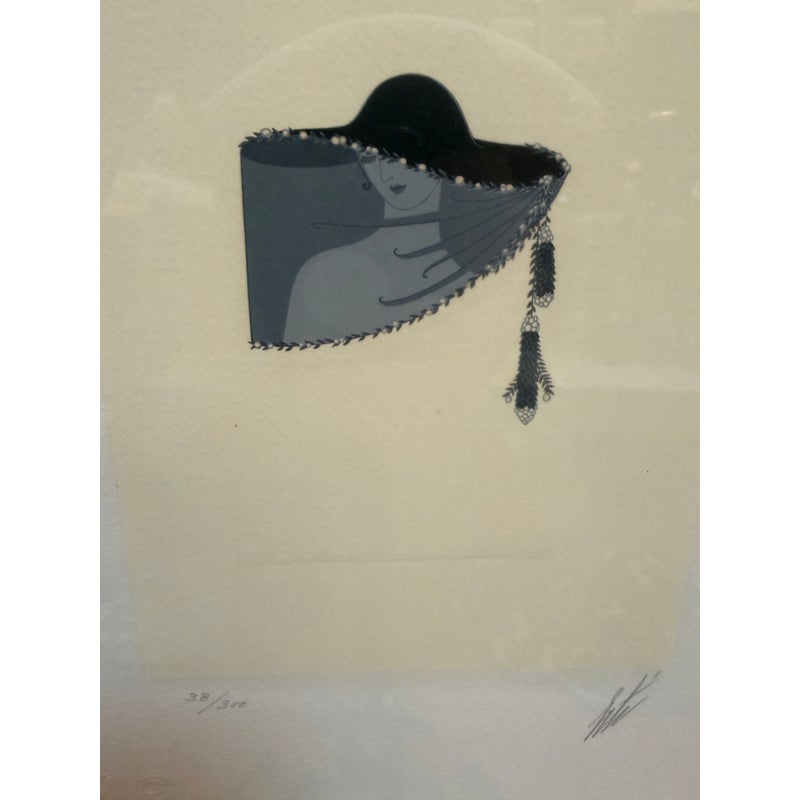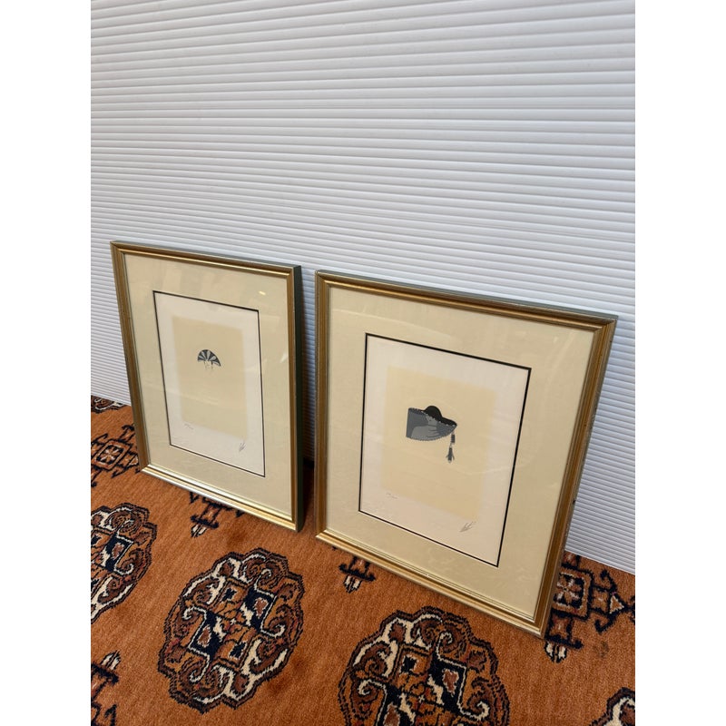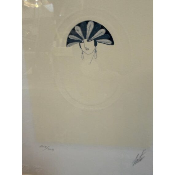 Design Plus Gallery presents a pair of a limited edition serigraphs by Erte’, Romaine de Tirtoff. The Russian-born French artist and designer showcases his elegant and glamorous style in this pair of and hand-signed prints. Incorporated in each piece is the deco style often featured in his prints and theatrical productions. Chapeau themed, both “Feathers” 205/300 and “Veil” 38/300 feature fashionable feather embellished headwear. Professionally matted and framed in gilt wood, protected under glass. Little wear; condition is good.