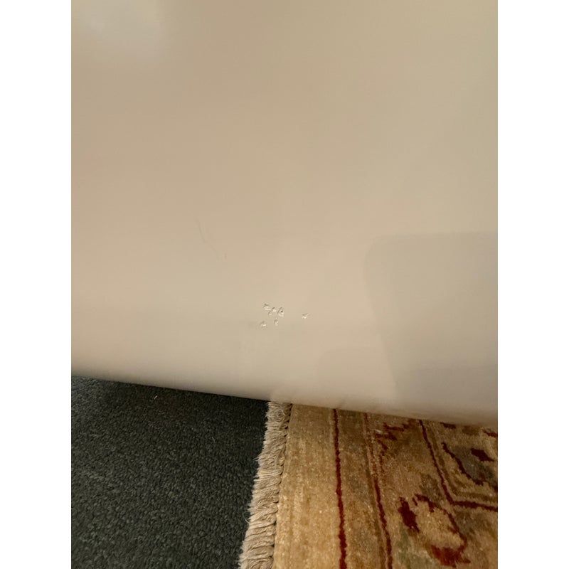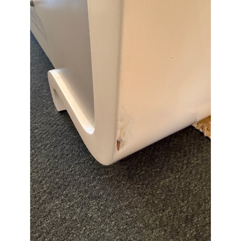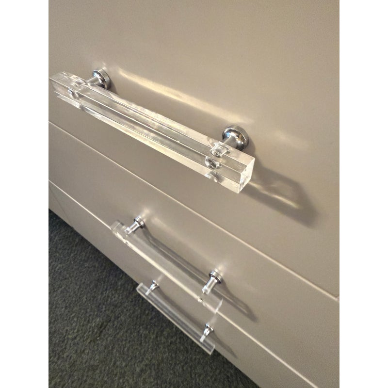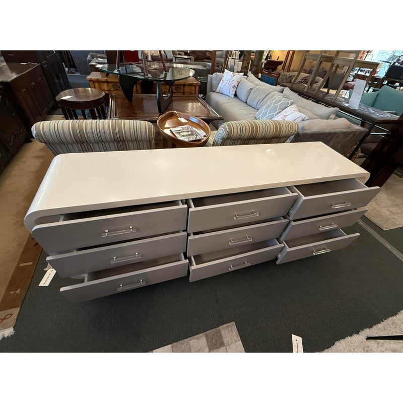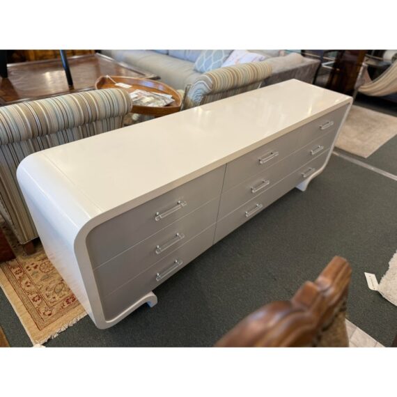 Desig Plus Gallery presents a Custom Dresser designed by Steve Chase, 1976. Nine drawers encased in lacquered gray and white, the waterfall top swoops down to create the perfect support. Lovely lucite handles set the dresser aglow. Light, visible surface wear; consistent with age and use. Made in the USA.