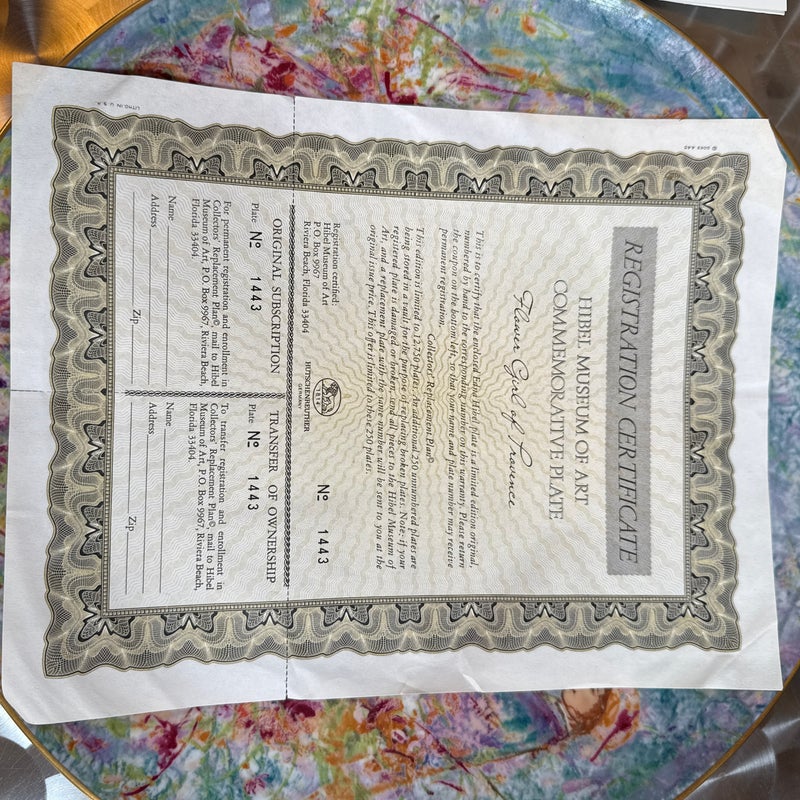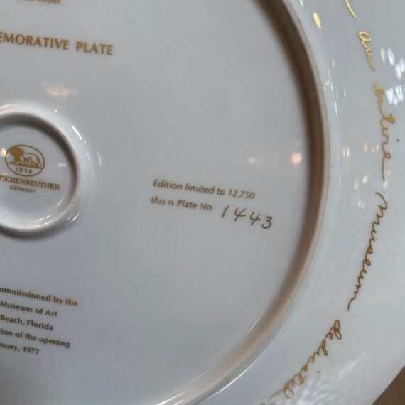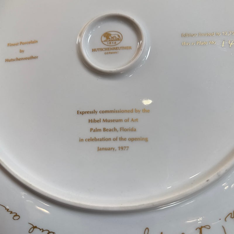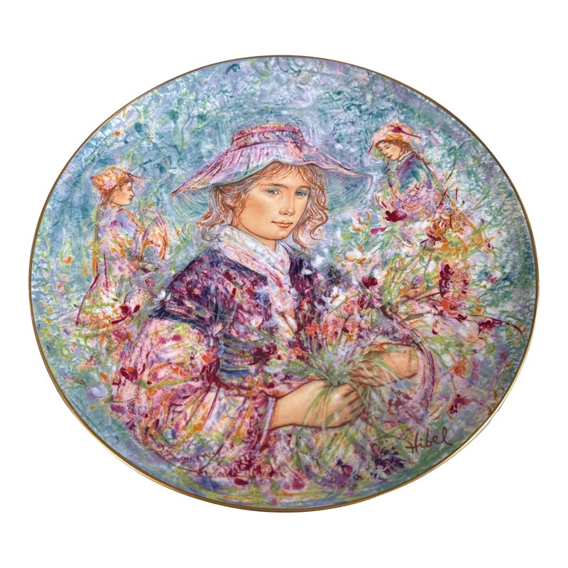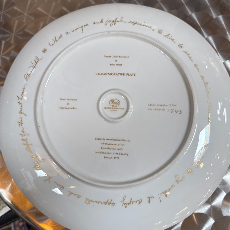 Design Plus Gallery presents the “Flower Girl of Provence” Commemorative Plate by Artist Edna Hibel in 1977. This is a limited run of this design with this one being 1443. of 12750. The plate is in the impressionism style with multi-colors of blue with violets, pinks all found within the porcelain. The American artist Edna Hibel was commissioned for the grand opening of the Hibel Museum of Art in Palm Beach, Florida in 1977. There is pertinent information for this collectible piece on the back side of the plate. Is in good condition for its age and comes with original box.