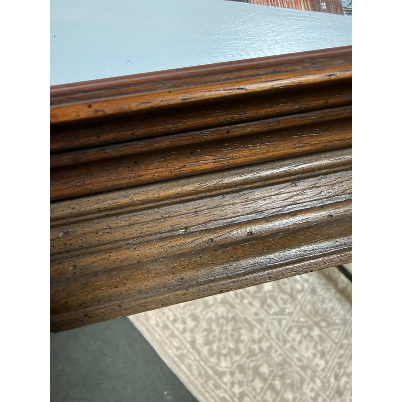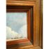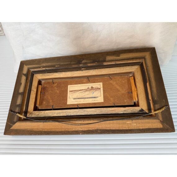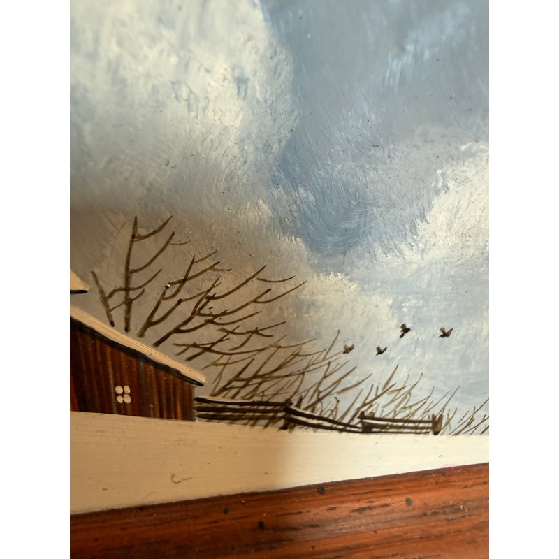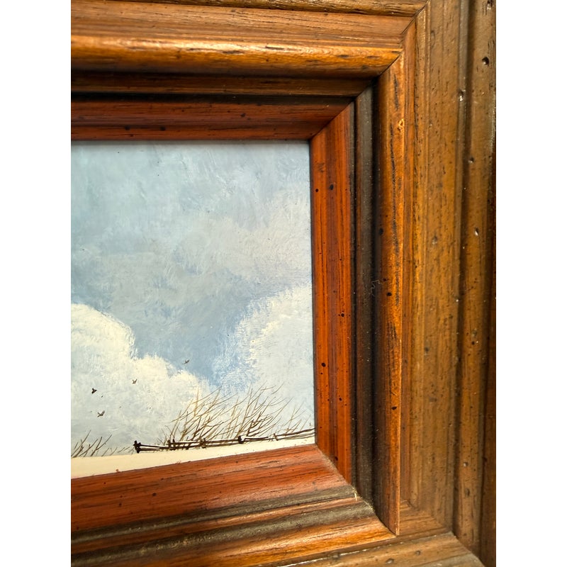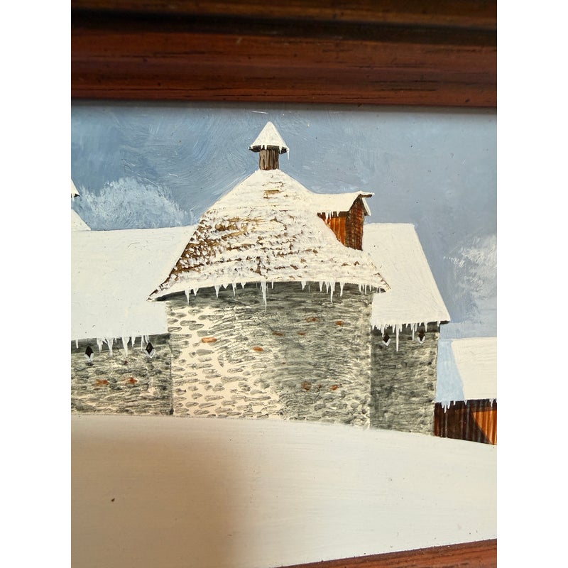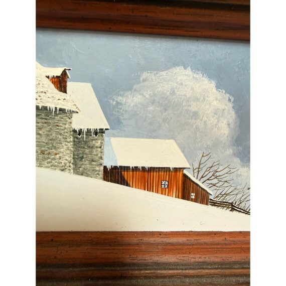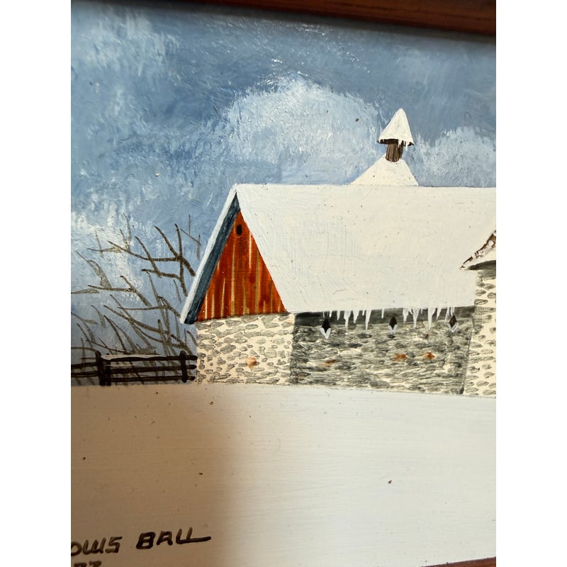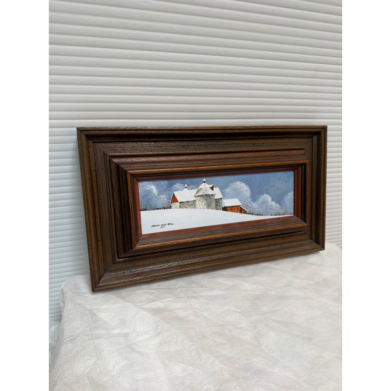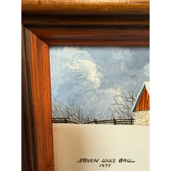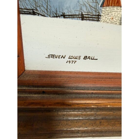 Design Plus Gallery presents a Wintertime Landscape Oil Painting by Artist Steven L. Ball. The art piece is an original from 1977 with that and his signature at the lower left side. The mood is cold, peaceful, quiet as it is set in the wintertime with snow covering the ground completely and the homesteads roofing. Icicles cover the turbine and the fence is capped with snow suggesting a recent downfall of fresh powder. The art work is framed in a thick beveled frame of dark wood. The piece shows more wear on the backside but we considered it to be in good condition and consistent with its vintage age.