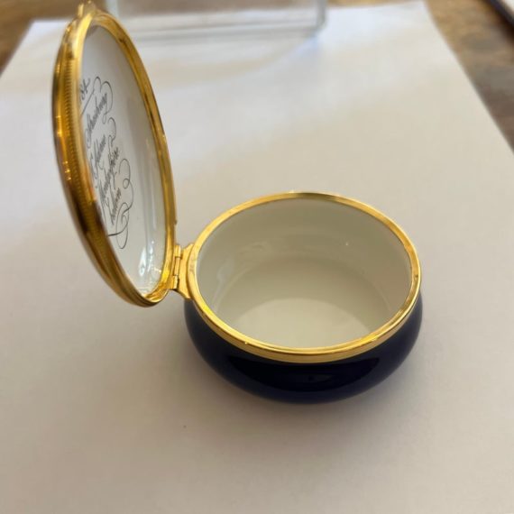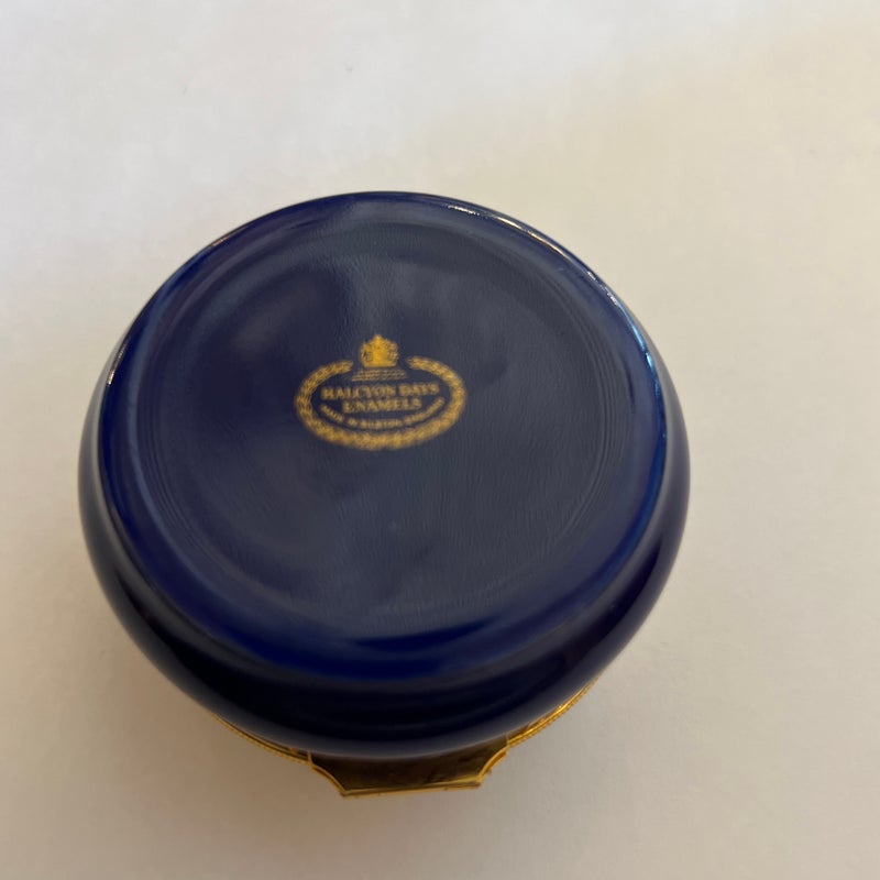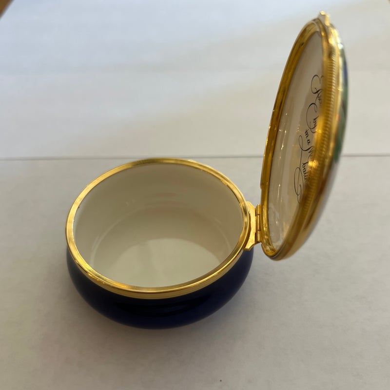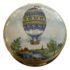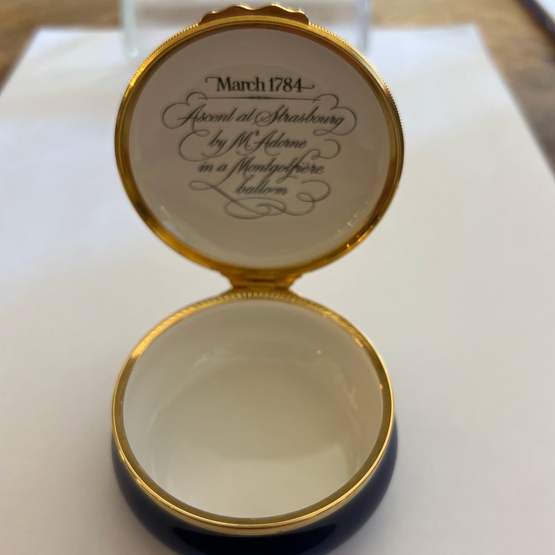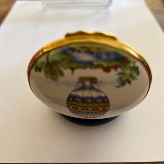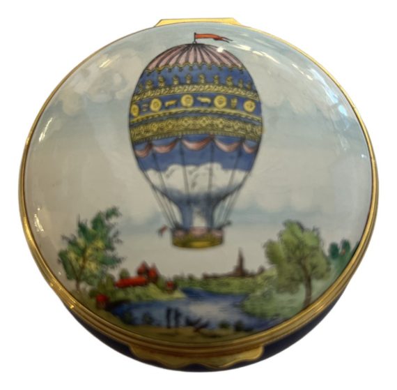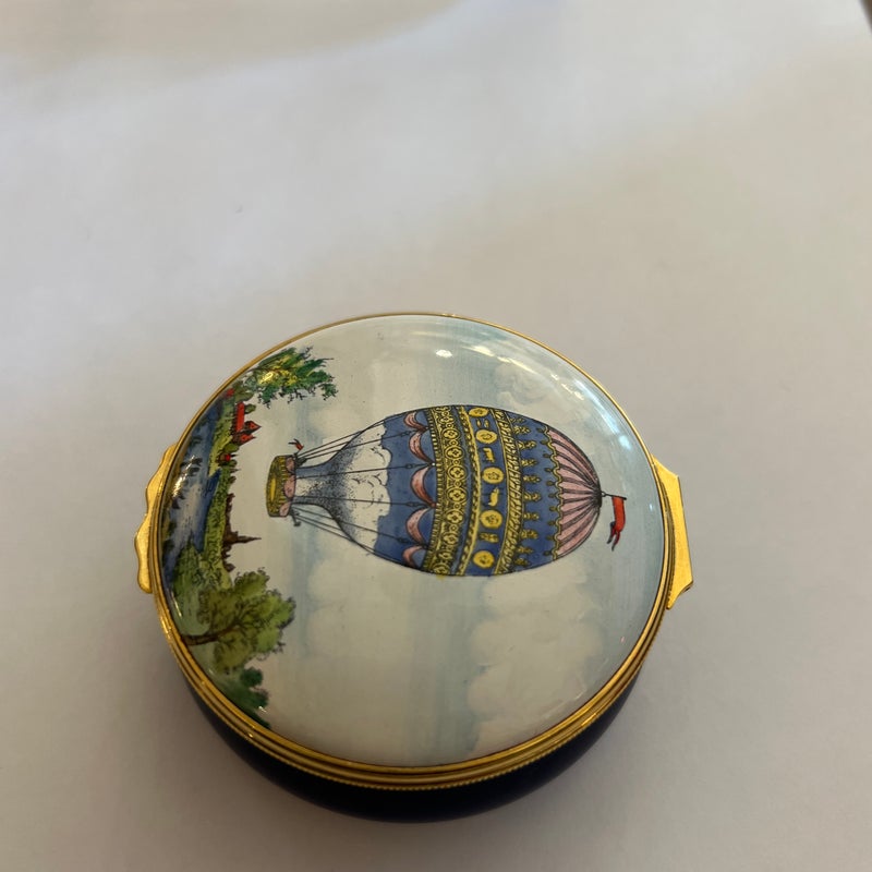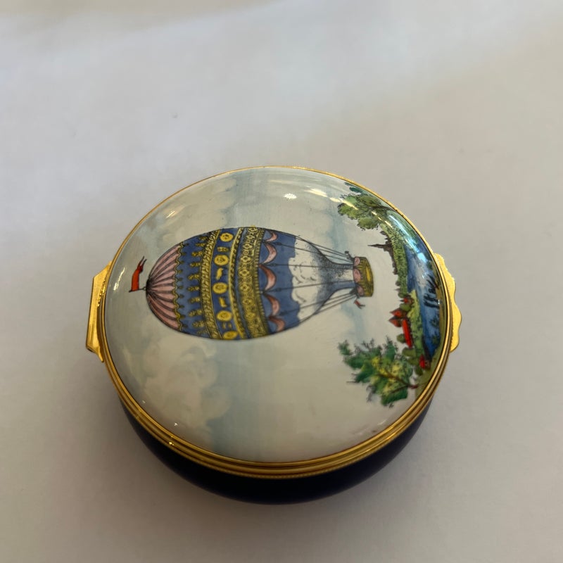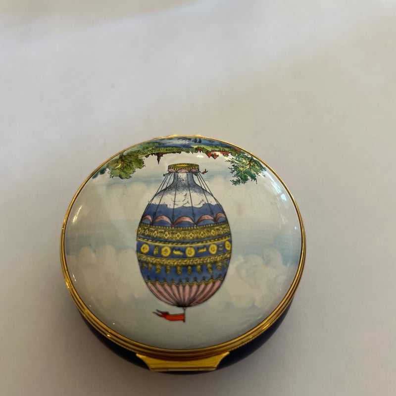 Design Plus Gallery presents a Hot Air Balloon Hinged Trinket Box from Halcyon Days Enamel. Halcyon Days is a luxury gift and accessories company that specializes in English craftsmanship. They are one of only 14 companies in the world to hold all three Royal Warrants to the British Royal Household. This hinged trinket box was enameled on copper in Bilston, England. This box’s design has the Montgolfier hot air balloon making its ascent from Strasbourg UK in 1784, issued in 1978. Is in good condition with no chips or cracks present.