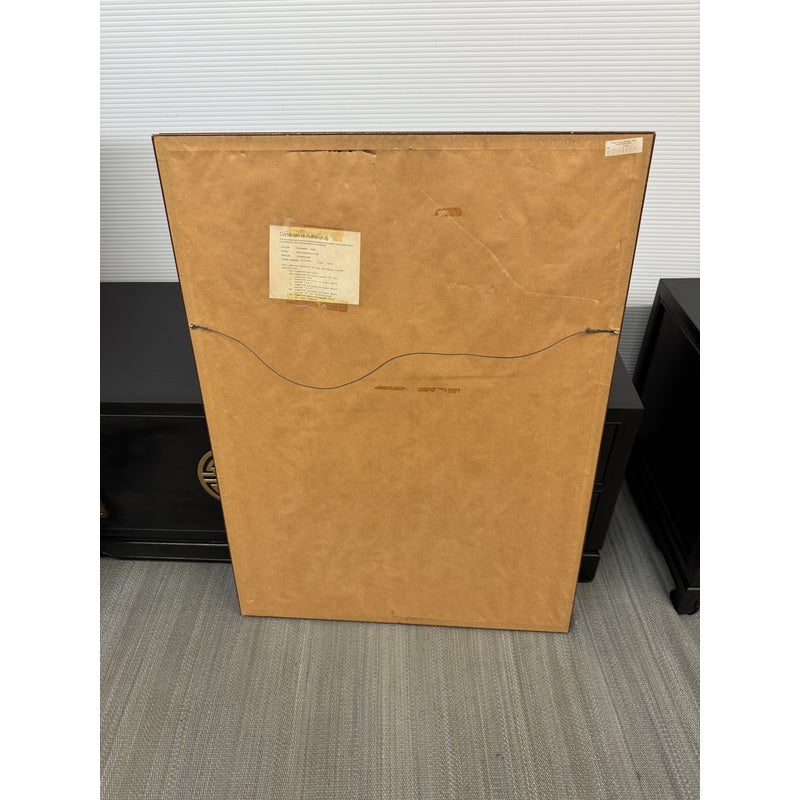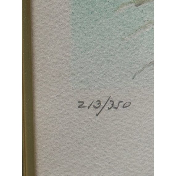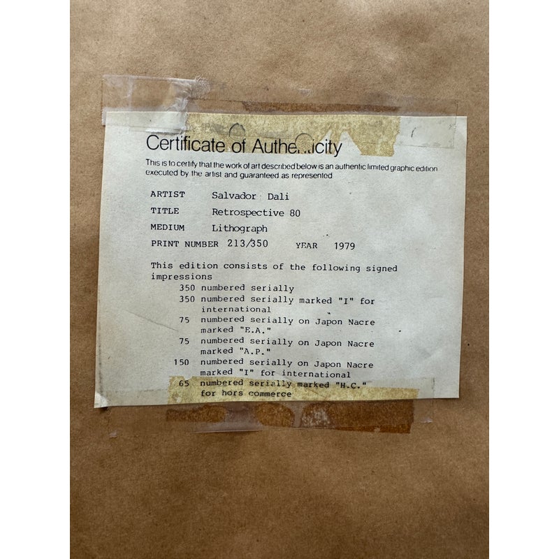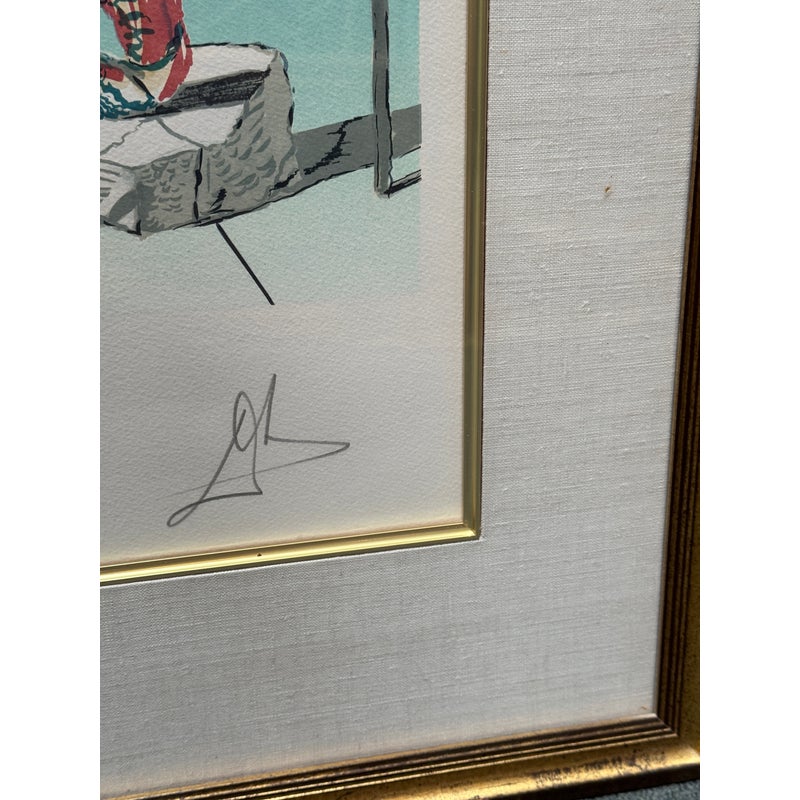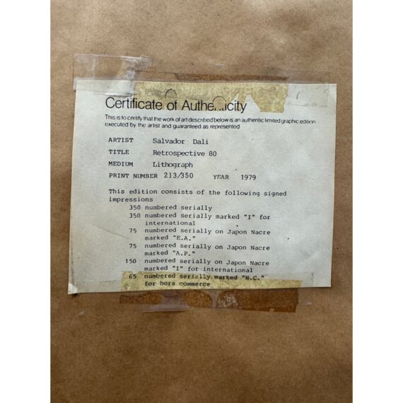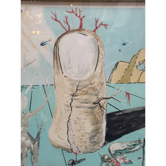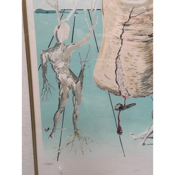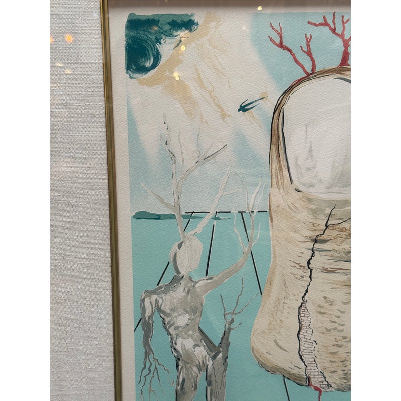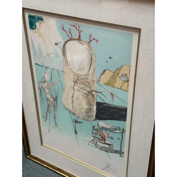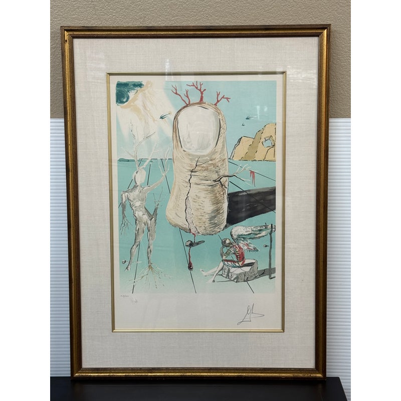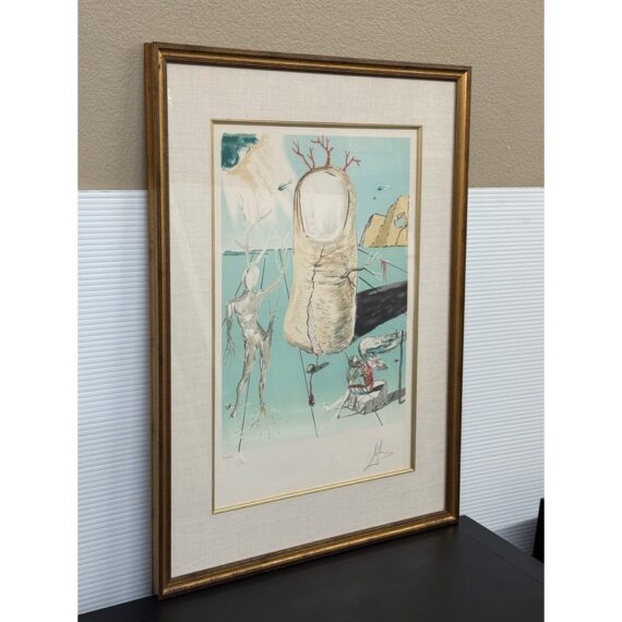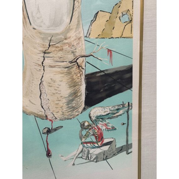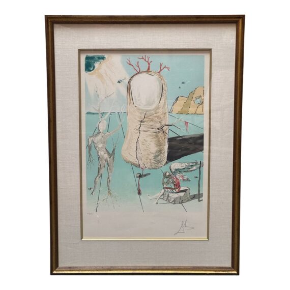 Design Plus Gallery present “The Vision of the Angel of Cap Creus – The Thumb” an Original Lithograph by Salvador Dalí. The art piece reinvent a religion depiction, symbolized the supremacy of God through a giant thumb from which life emerges. The thumb represents the God the Father, the figure to the right embodies humanity (Son of God) and the winged figure on the left represents the Holy Spirit. The limited edition is number 213 of 250 made, with the Dali signature, both at the bottom in pencil. Certificate is on the back of its professional framing. Lithograph is in good condition, certificate shows visible wear and frame has marks to the wood that are consistent with its vintage age.