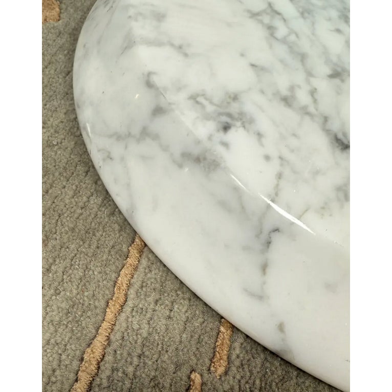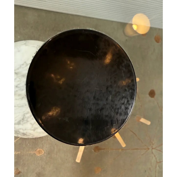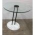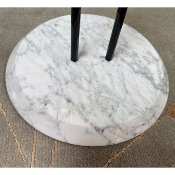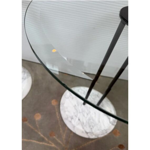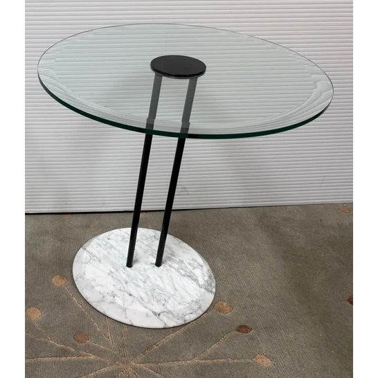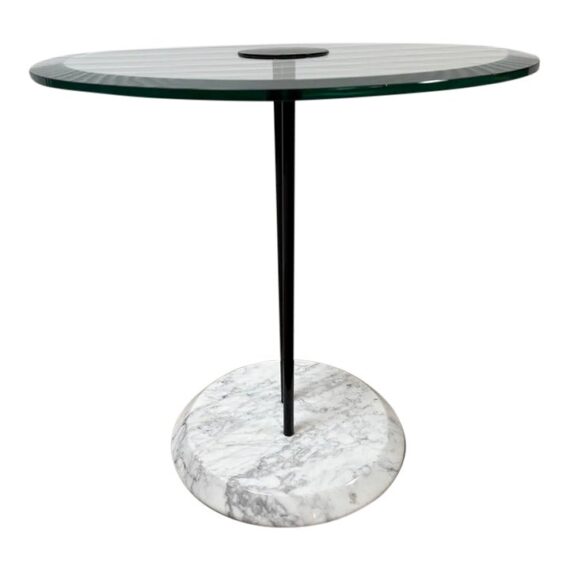 Design Plus Gallery presents a Vintage Modern Side Table by Cattelan Italia. The 1980’s design feature a round beveled base in white Marquinia marble with gray veins. The beveled round glass iis supported by a pair of black metal columns. Always modern, the accent table will move beautifully from space to space. Condition is consistent with age and use, minor scratches